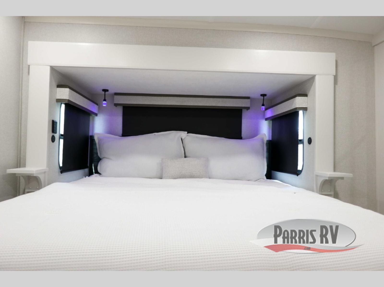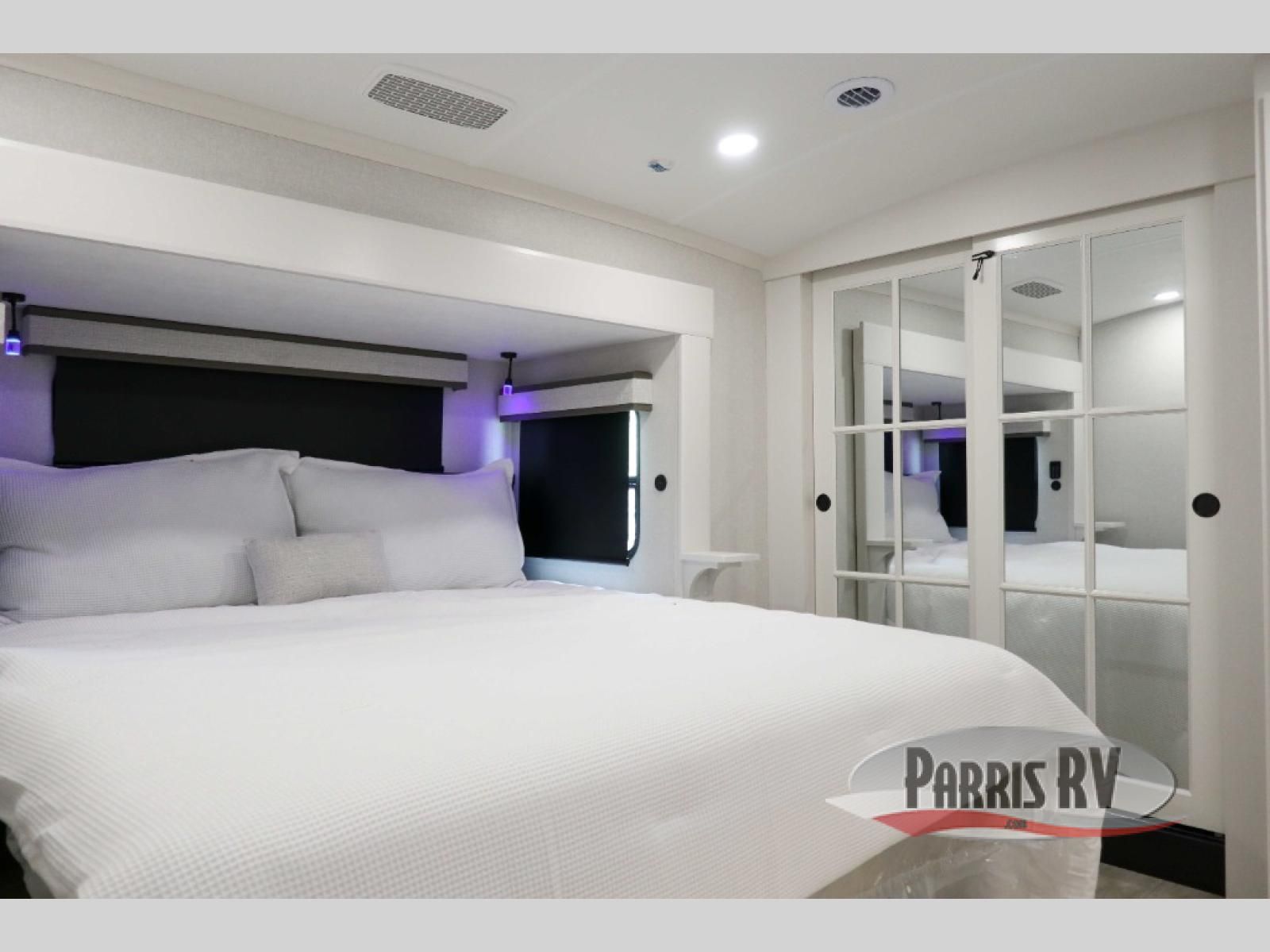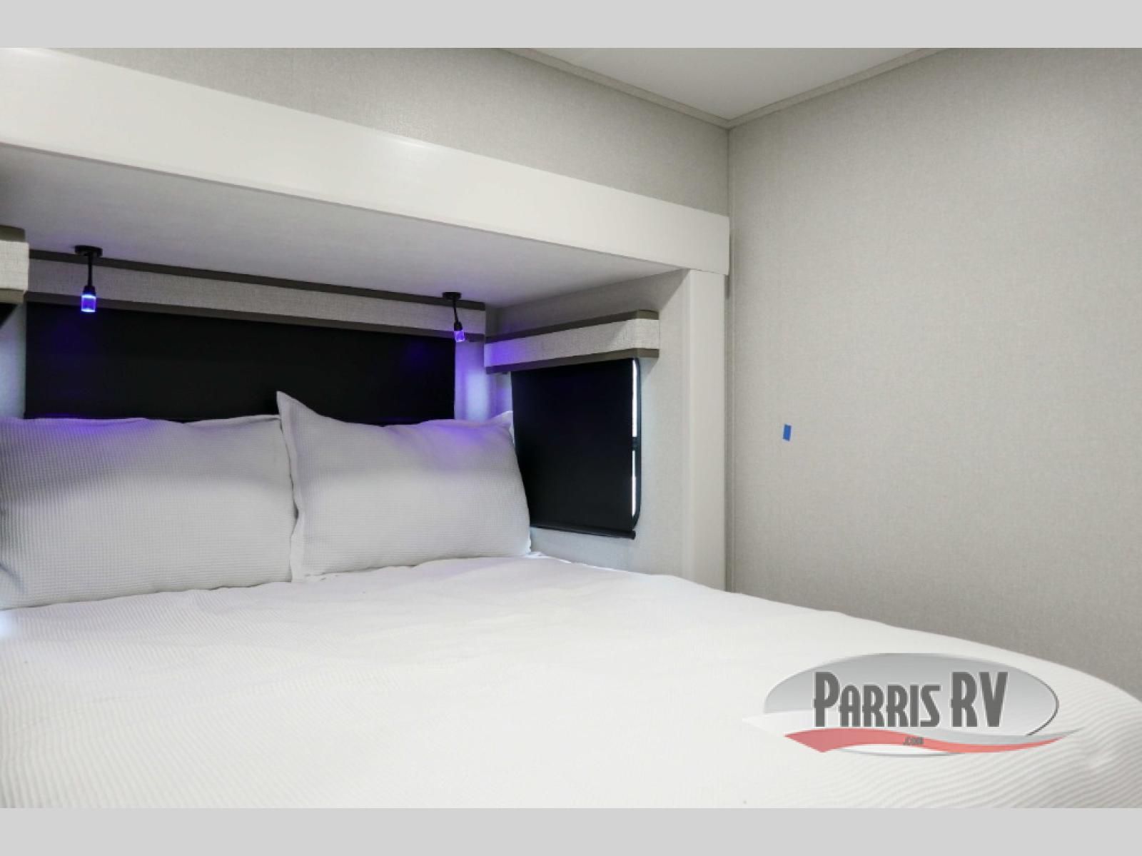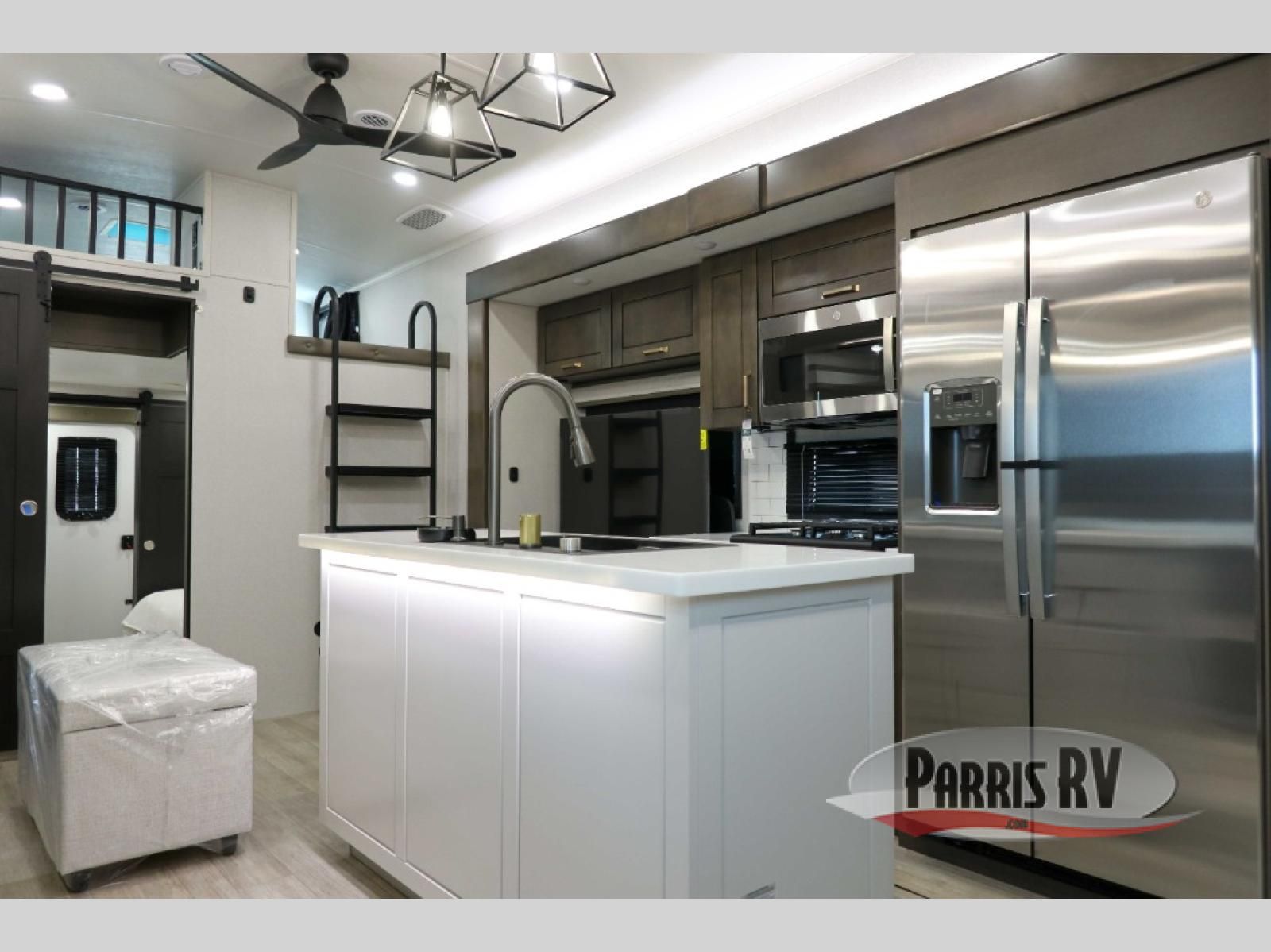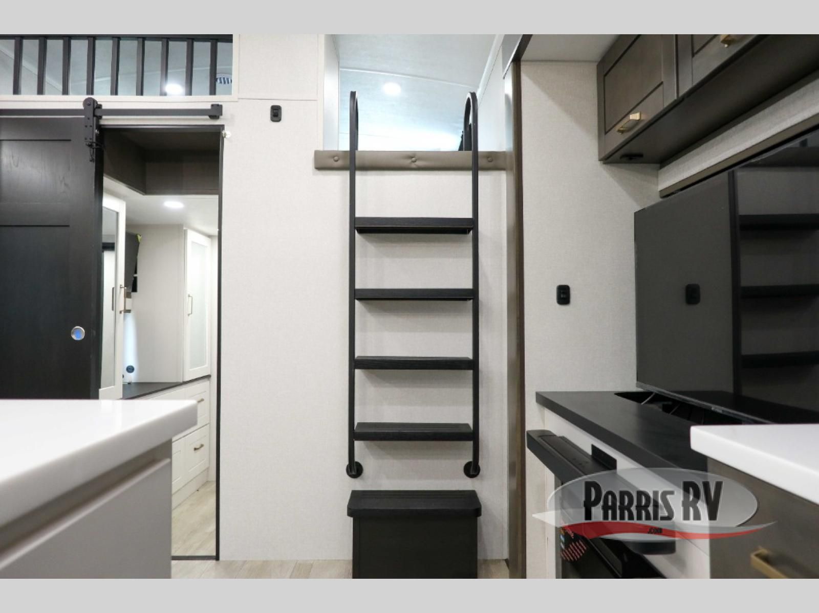 At the front of the 40DB fifth wheel, you'll find the inviting front bedroom featuring a spacious 72" x 80" king bed, perfect for a restful night's sleep. This room also includes a wardrobe and a flip-up dresser with a TV above, providing plenty of storage for clothing and essentials. Moving down the hall, one of two full bathrooms offers a 36" x 48" shower with a built-in seat for added accessibility, along with linen shelves for extra storage. At the center of the trailer, the main living area opens up with dual opposing slides for maximum comfort and room to move. One slide houses a 21-cu. ft. residential refrigerator and a 30" space-saving convection microwave with a built-in air fryer, while the central kitchen island includes a sink and pull-out cutting board, everything you need to prepare meals on the go. Across the way, the opposite slide features a roll-out table and theater seating, creating the perfect space to dine and relax after a long day. At the rear, the second bedroom includes a 60" x 80" queen bed in a slide-out with two wardrobes opposite for ample storage, plus a private full bathroom complete with a tub/shower combo and its own exterior exit for added convenience. Above it all, the loft provides three 30" x 80" bed mats and a loft cabinet, offering extra-sleeping space or additional storage for the whole family's adventures.