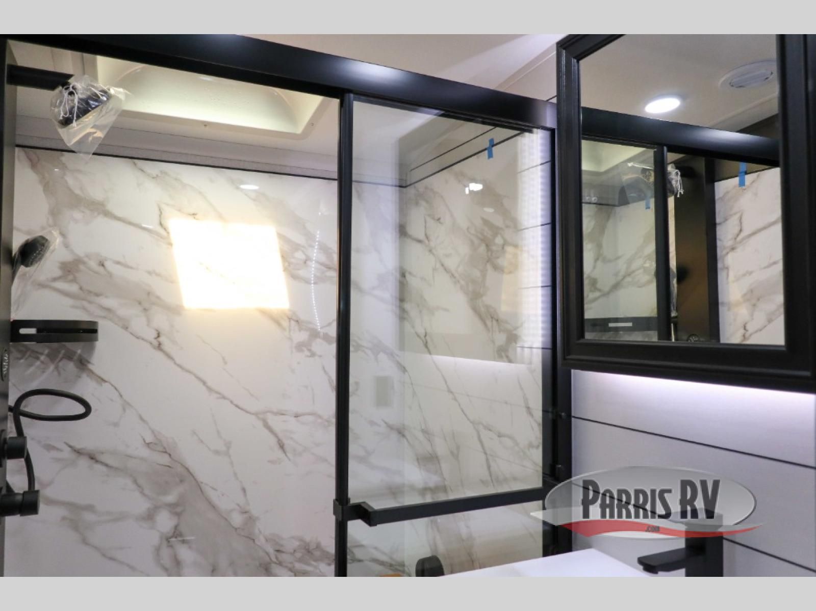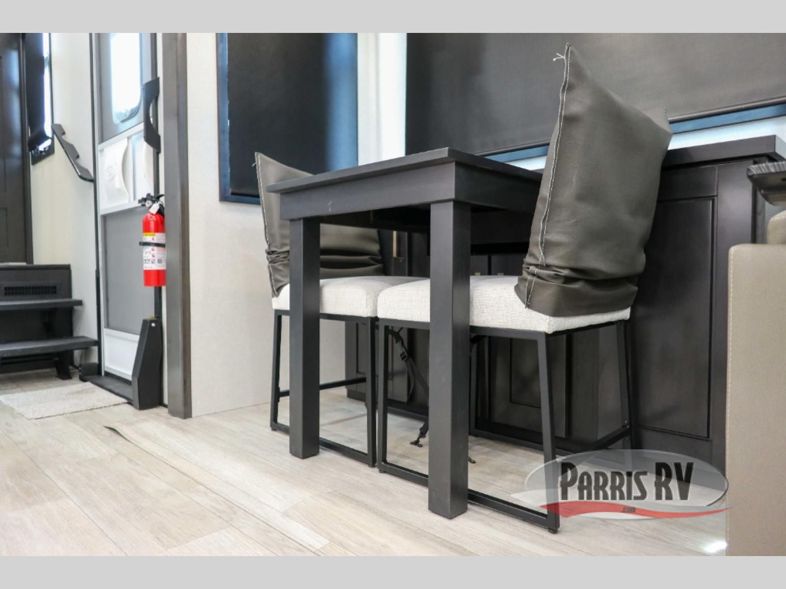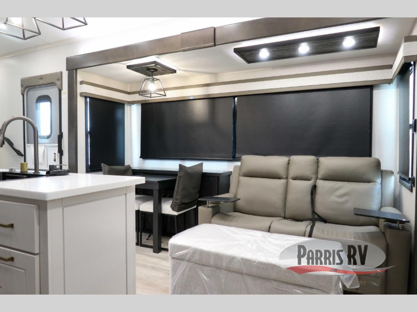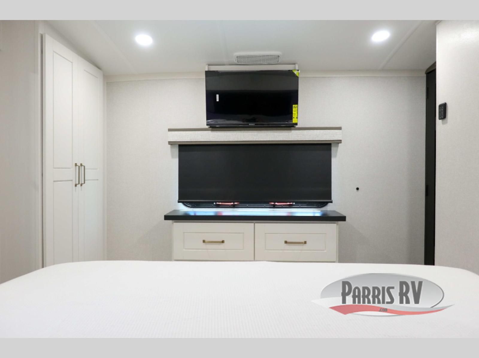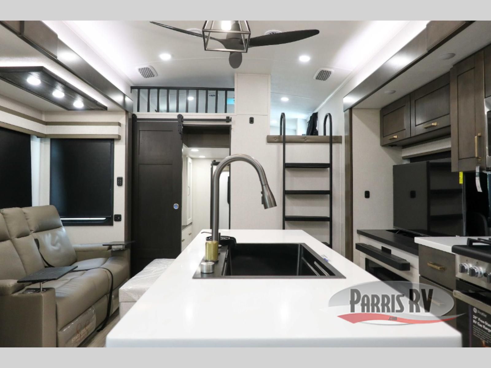 At the front of the 40DB fifth wheel, you'll find the inviting front bedroom featuring a spacious 72" x 80" king bed, perfect for a restful night's sleep. This room also includes a wardrobe and a flip-up dresser with a TV above, providing plenty of storage for clothing and essentials. Moving down the hall, one of two full bathrooms offers a 36" x 48" shower with a built-in seat for added accessibility, along with linen shelves for extra storage. At the center of the trailer, the main living area opens up with dual opposing slides for maximum comfort and room to move. One slide houses a 21-cu. ft. residential refrigerator and a 30" space-saving convection microwave with a built-in air fryer, while the central kitchen island includes a sink and pull-out cutting board, everything you need to prepare meals on the go. Across the way, the opposite slide features a roll-out table and theater seating, creating the perfect space to dine and relax after a long day. At the rear, the second bedroom includes a 60" x 80" queen bed in a slide-out with two wardrobes opposite for ample storage, plus a private full bathroom complete with a tub/shower combo and its own exterior exit for added convenience. Above it all, the loft provides three 30" x 80" bed mats and a loft cabinet, offering extra-sleeping space or additional storage for the whole family's adventures.
