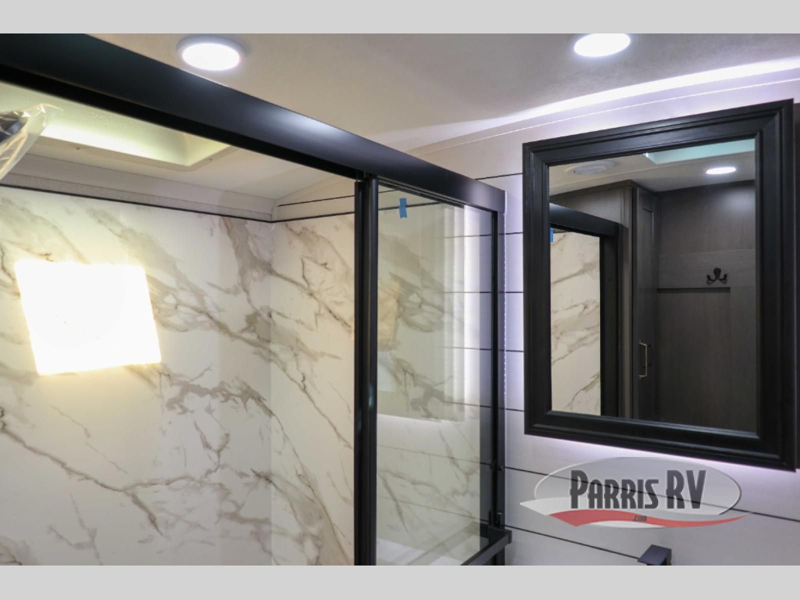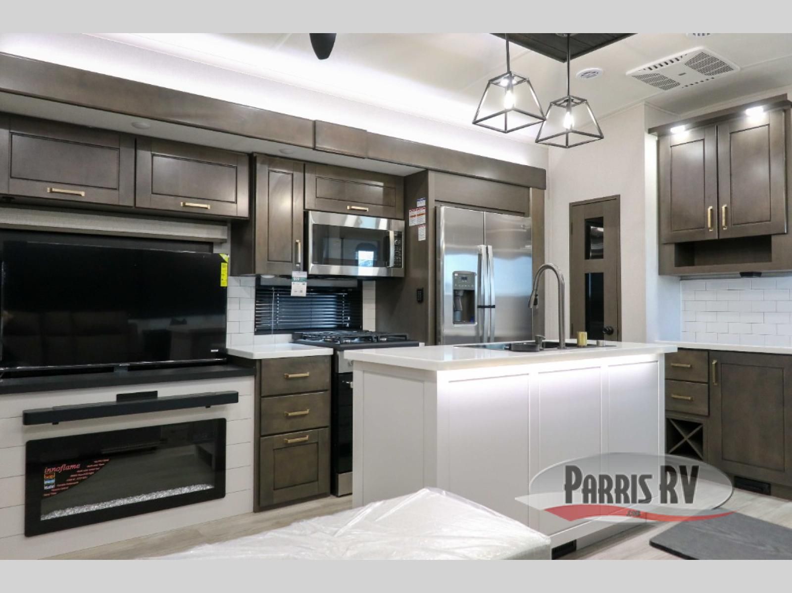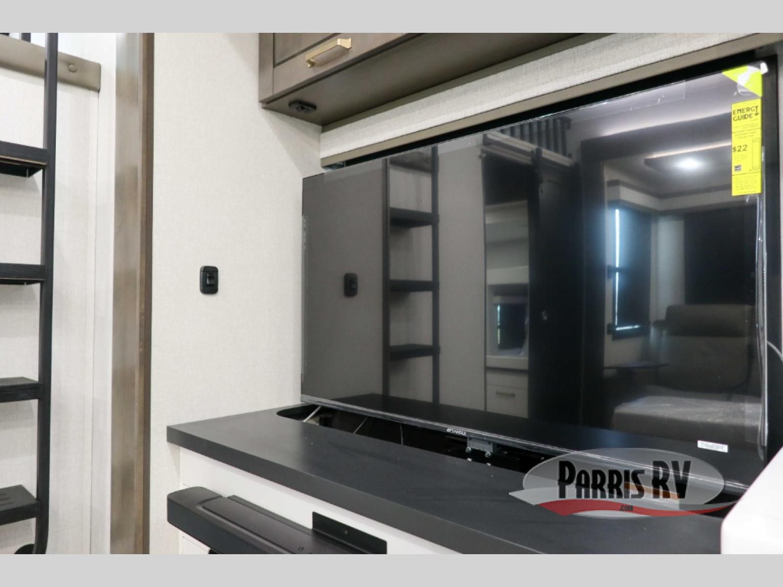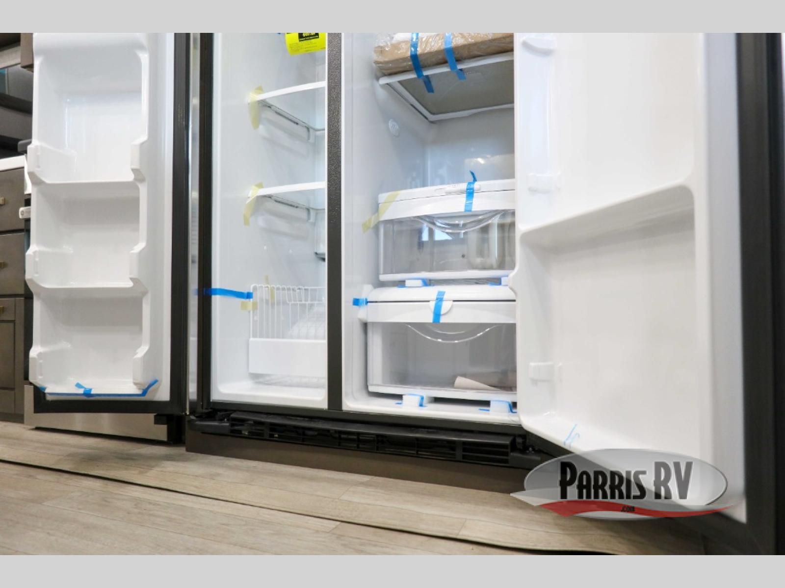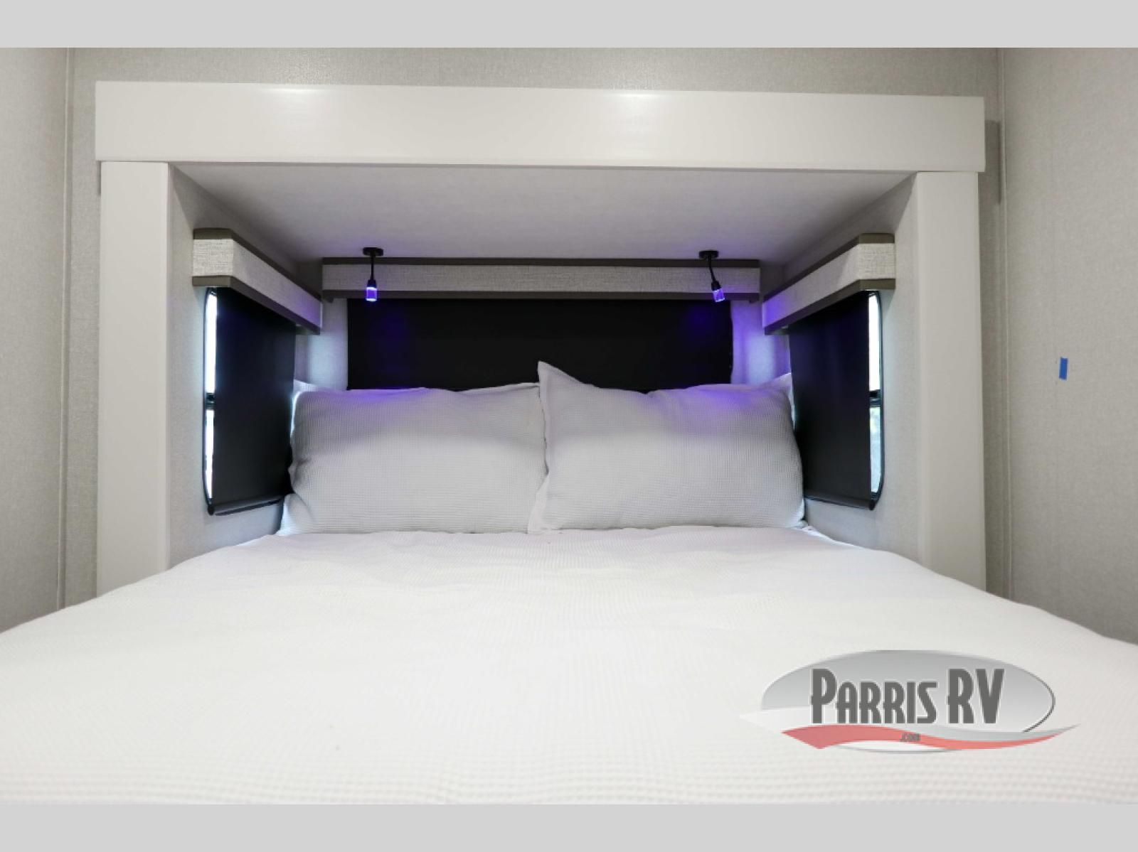 At the front of the 40DB fifth wheel, you'll find the inviting front bedroom featuring a spacious 72" x 80" king bed, perfect for a restful night's sleep. This room also includes a wardrobe and a flip-up dresser with a TV above, providing plenty of storage for clothing and essentials. Moving down the hall, one of two full bathrooms offers a 36" x 48" shower with a built-in seat for added accessibility, along with linen shelves for extra storage. At the center of the trailer, the main living area opens up with dual opposing slides for maximum comfort and room to move. One slide houses a 21-cu. ft. residential refrigerator and a 30" space-saving convection microwave with a built-in air fryer, while the central kitchen island includes a sink and pull-out cutting board, everything you need to prepare meals on the go. Across the way, the opposite slide features a roll-out table and theater seating, creating the perfect space to dine and relax after a long day. At the rear, the second bedroom includes a 60" x 80" queen bed in a slide-out with two wardrobes opposite for ample storage, plus a private full bathroom complete with a tub/shower combo and its own exterior exit for added convenience. Above it all, the loft provides three 30" x 80" bed mats and a loft cabinet, offering extra-sleeping space or additional storage for the whole family's adventures.