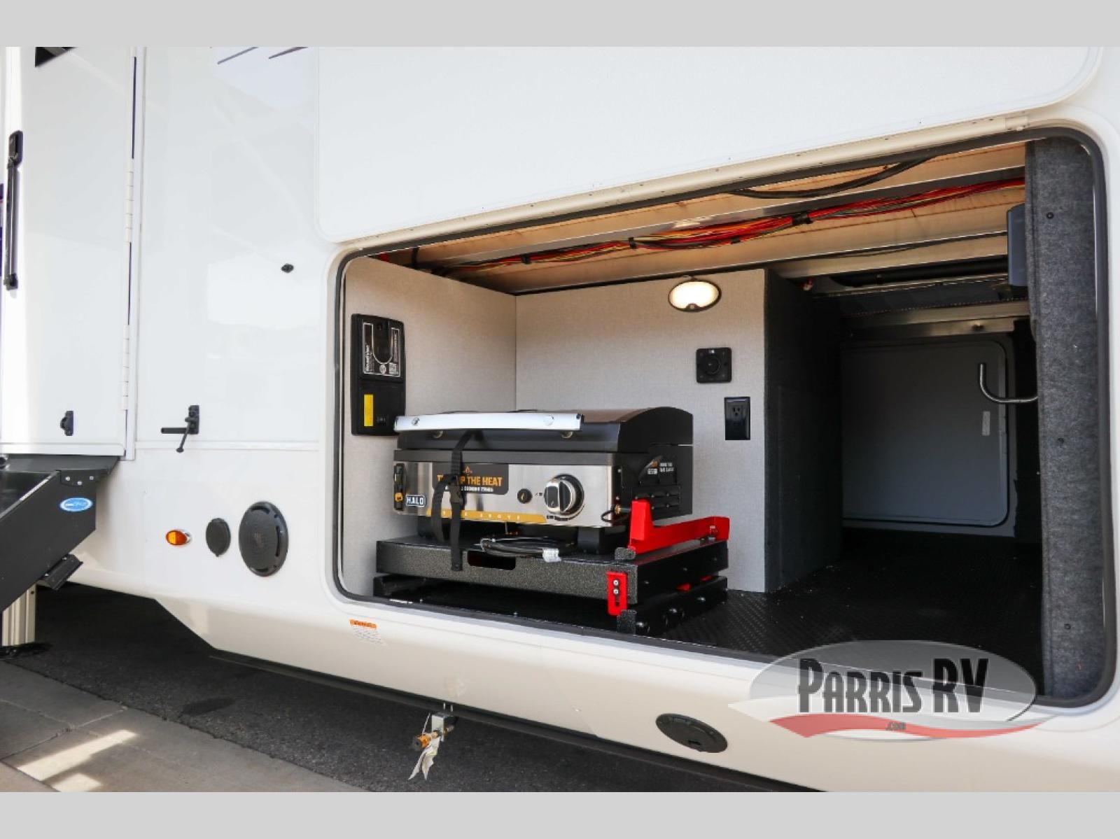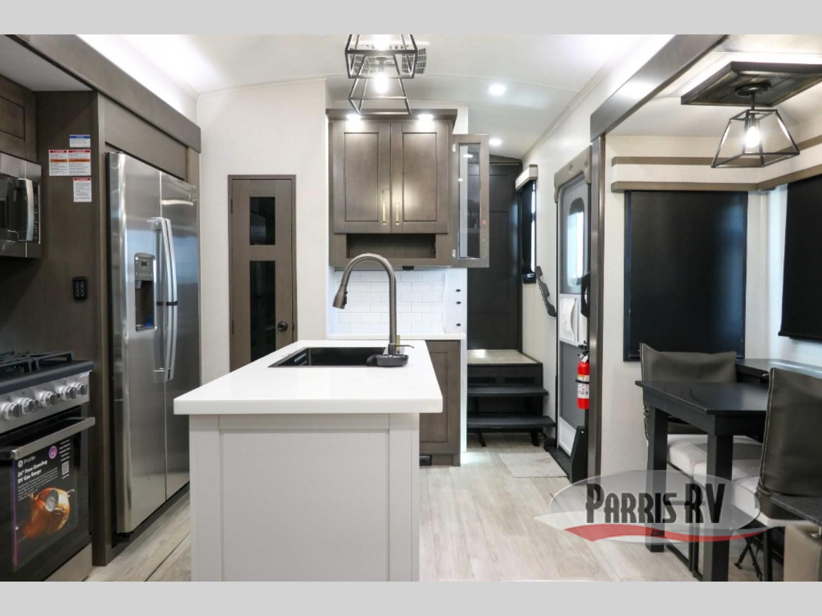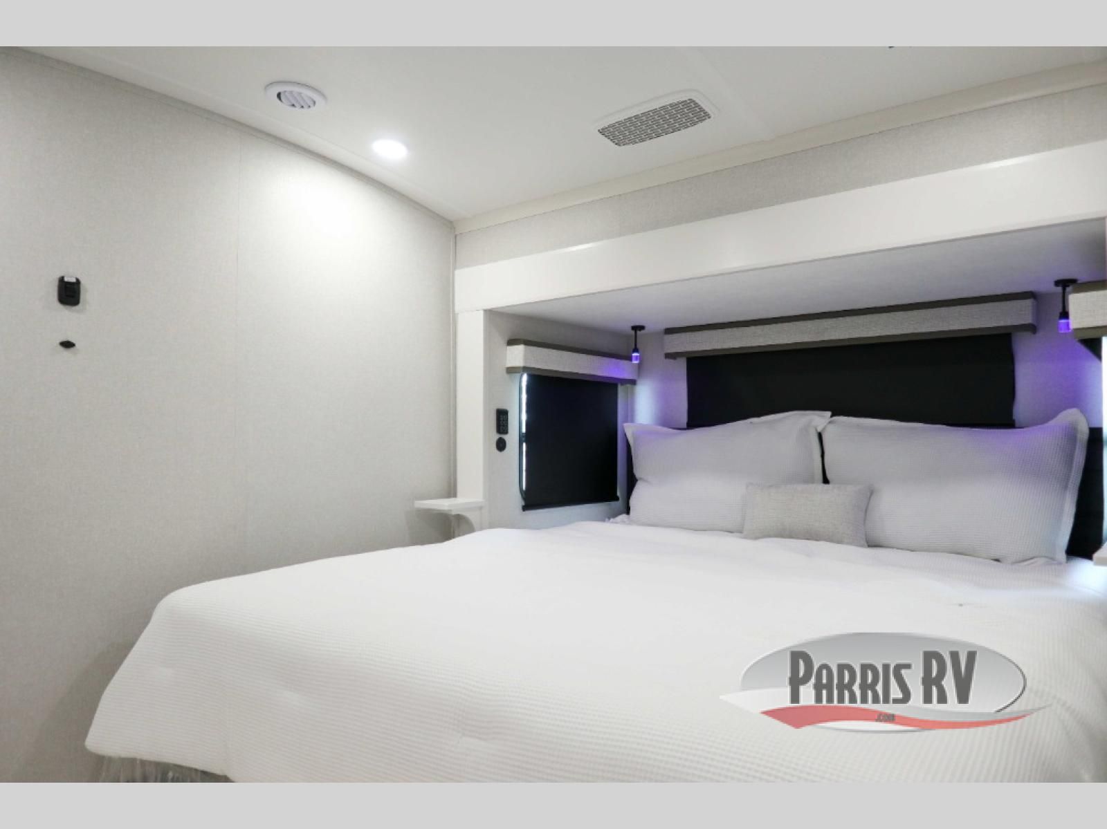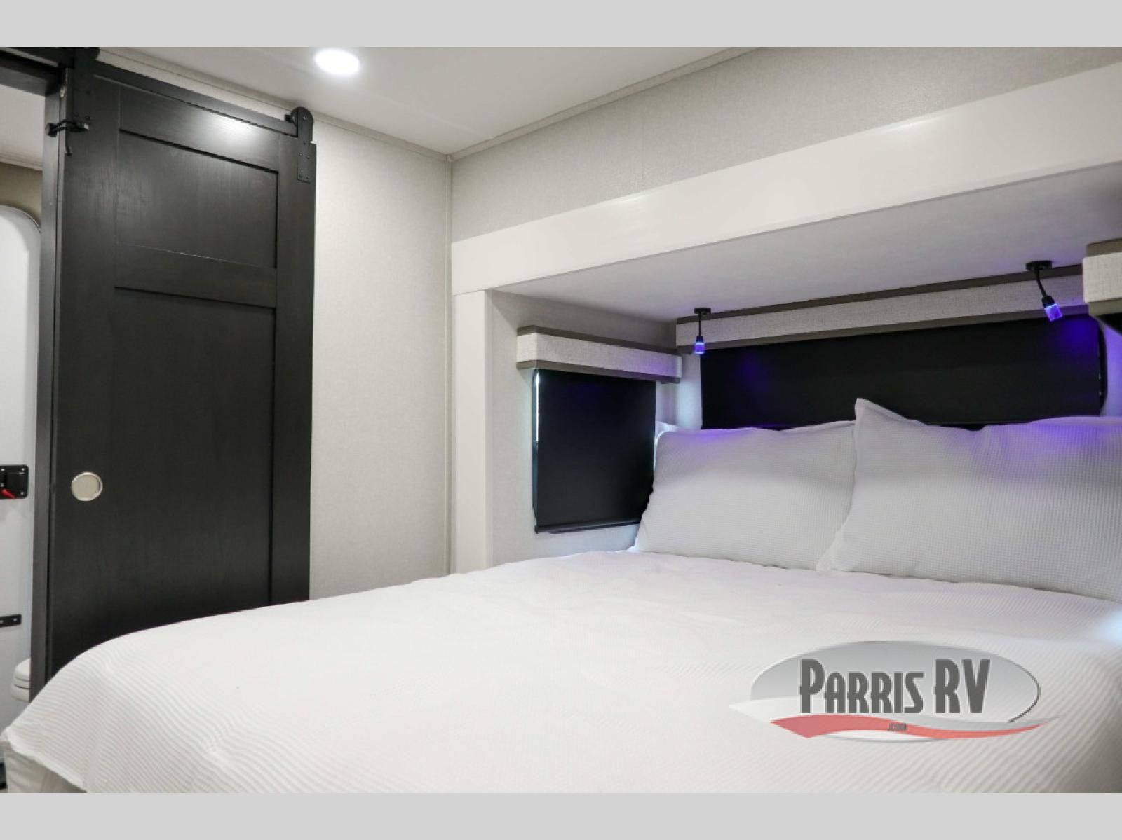 At the front of the 40DB fifth wheel, you'll find the inviting front bedroom featuring a spacious 72" x 80" king bed, perfect for a restful night's sleep. This room also includes a wardrobe and a flip-up dresser with a TV above, providing plenty of storage for clothing and essentials. Moving down the hall, one of two full bathrooms offers a 36" x 48" shower with a built-in seat for added accessibility, along with linen shelves for extra storage. At the center of the trailer, the main living area opens up with dual opposing slides for maximum comfort and room to move. One slide houses a 21-cu. ft. residential refrigerator and a 30" space-saving convection microwave with a built-in air fryer, while the central kitchen island includes a sink and pull-out cutting board, everything you need to prepare meals on the go. Across the way, the opposite slide features a roll-out table and theater seating, creating the perfect space to dine and relax after a long day. At the rear, the second bedroom includes a 60" x 80" queen bed in a slide-out with two wardrobes opposite for ample storage, plus a private full bathroom complete with a tub/shower combo and its own exterior exit for added convenience. Above it all, the loft provides three 30" x 80" bed mats and a loft cabinet, offering extra-sleeping space or additional storage for the whole family's adventures.
