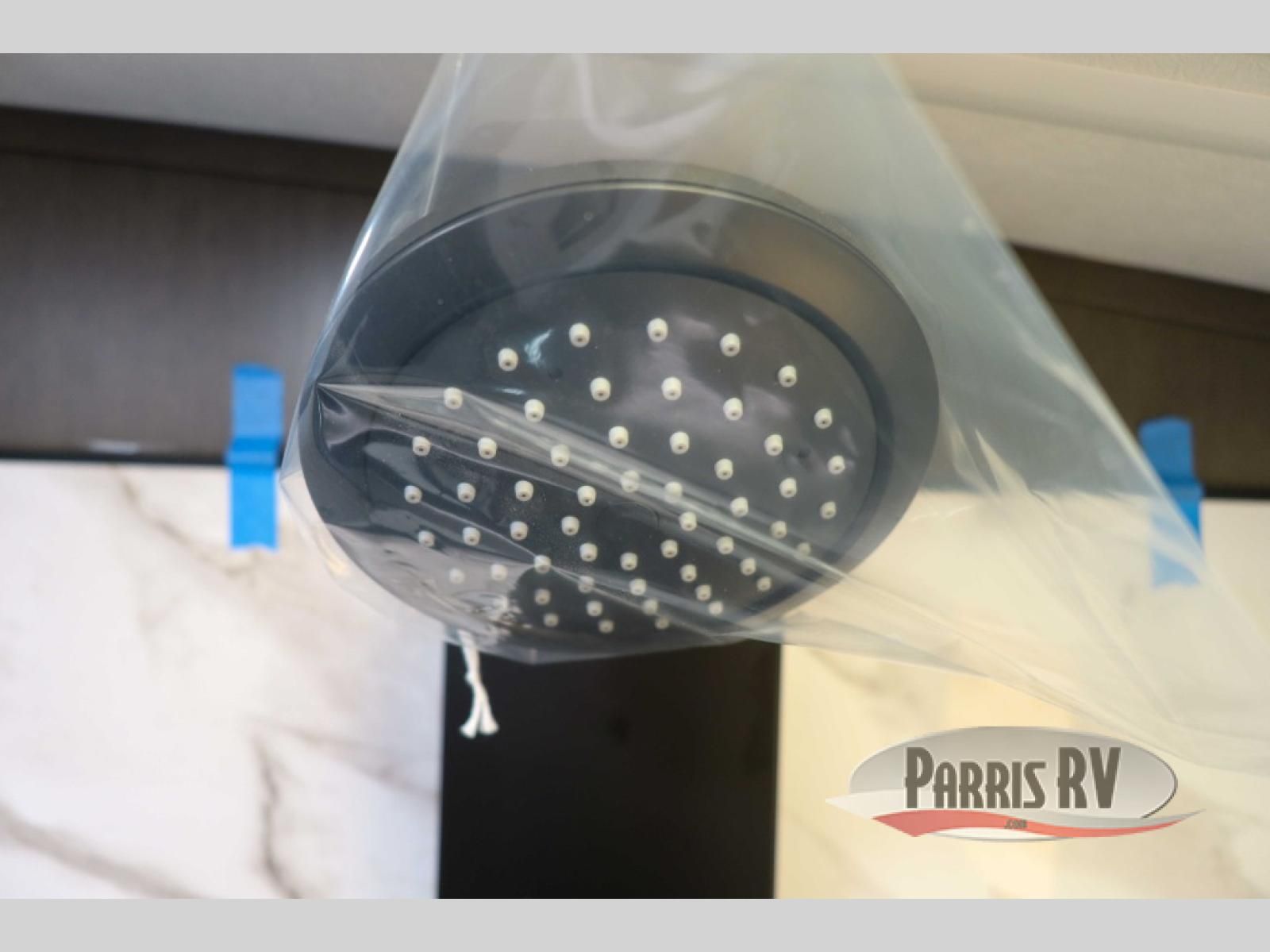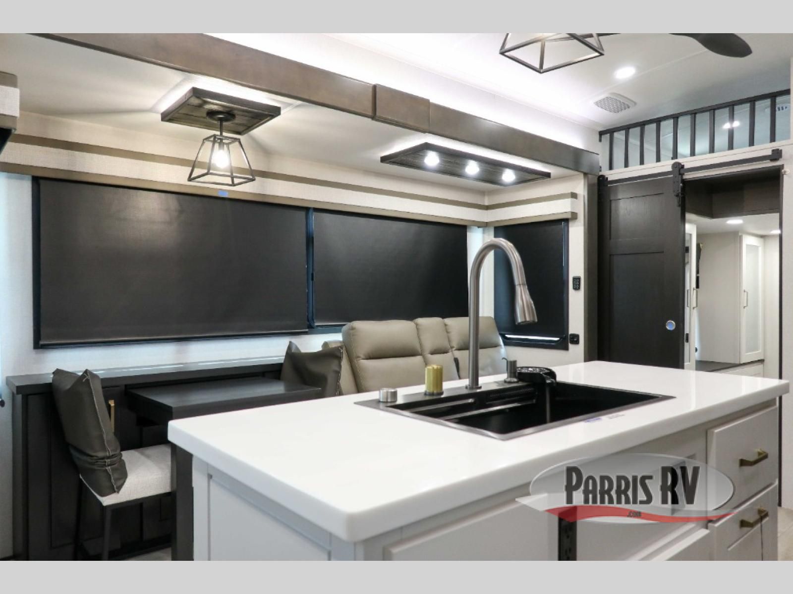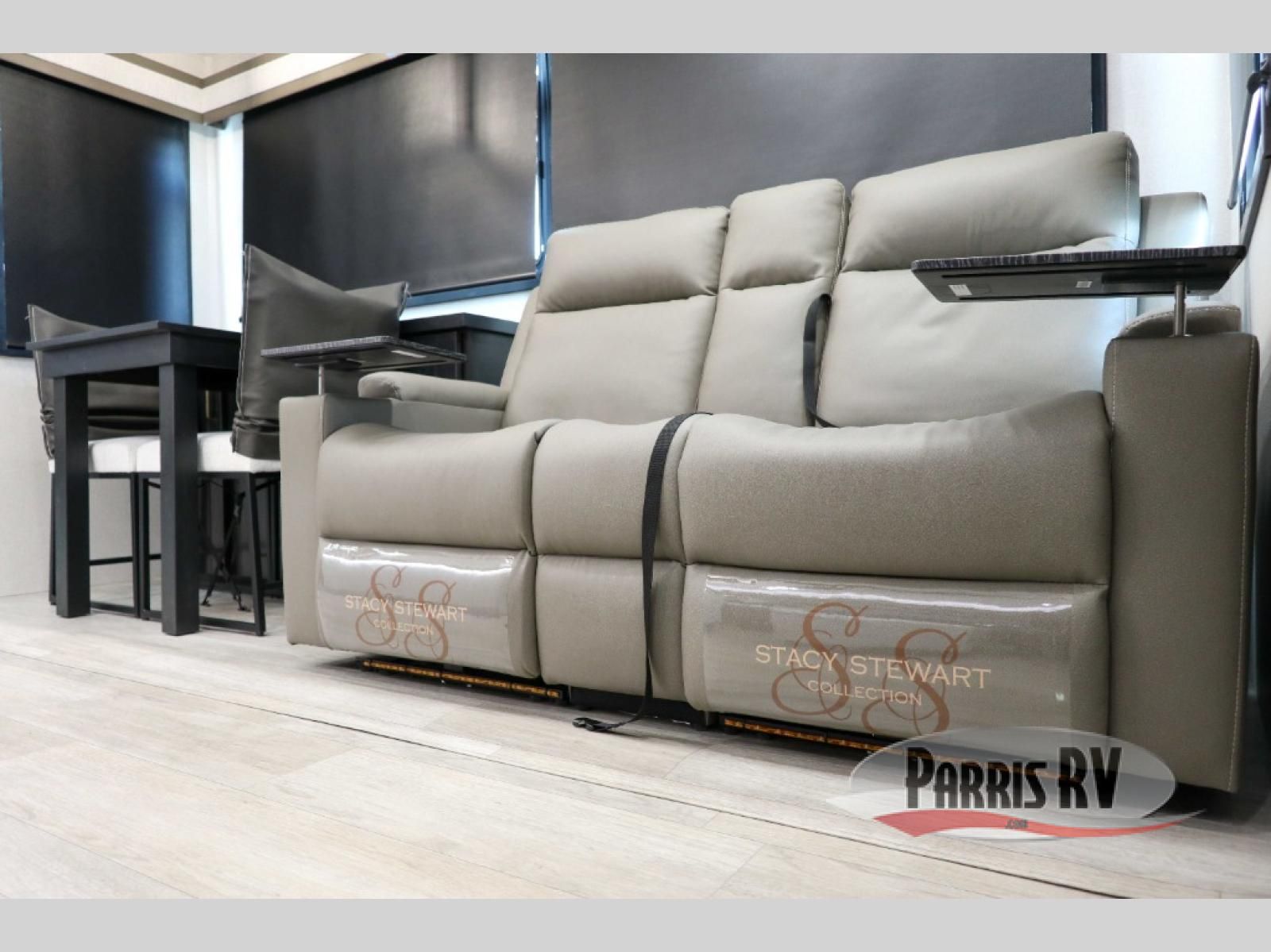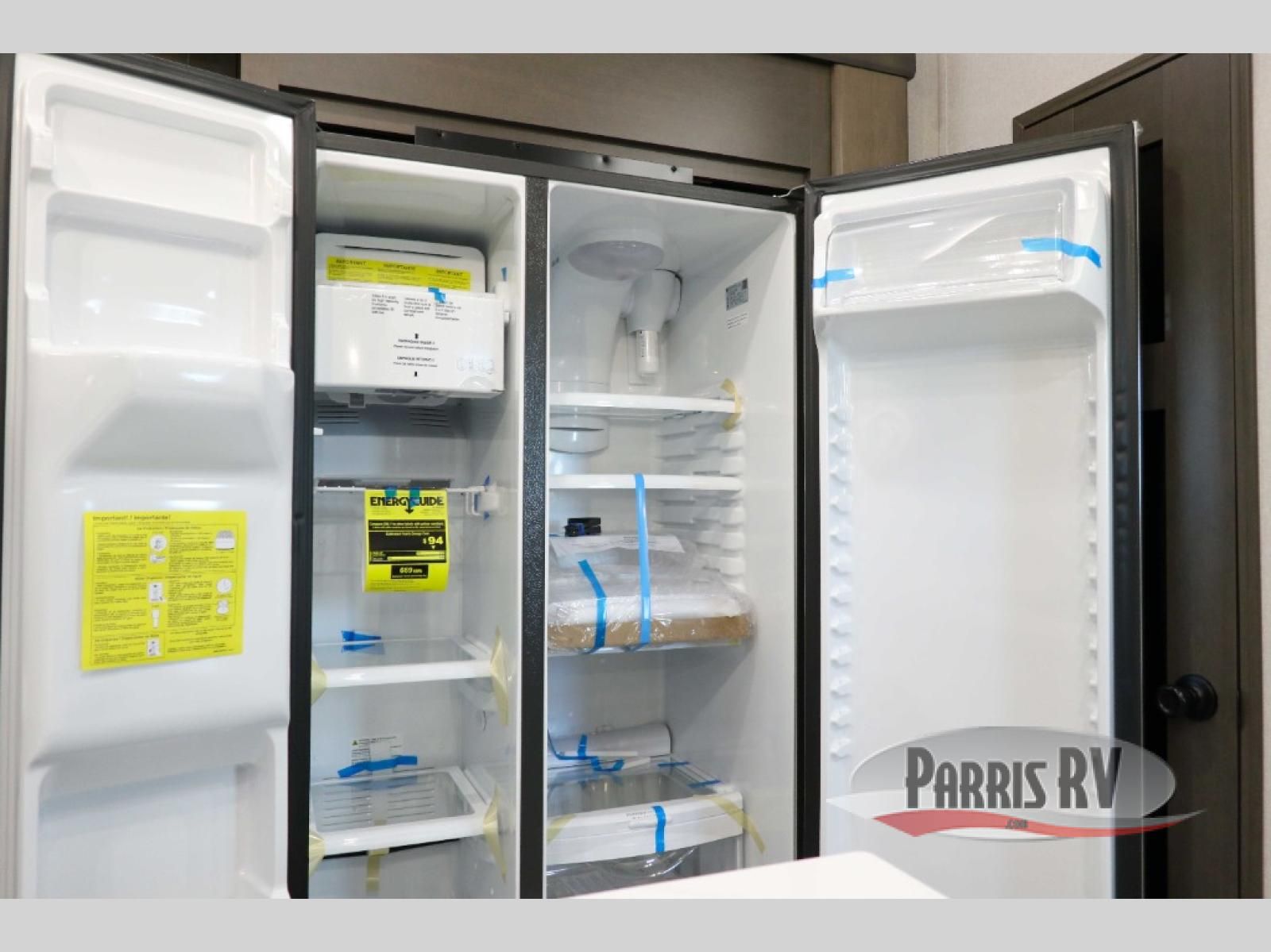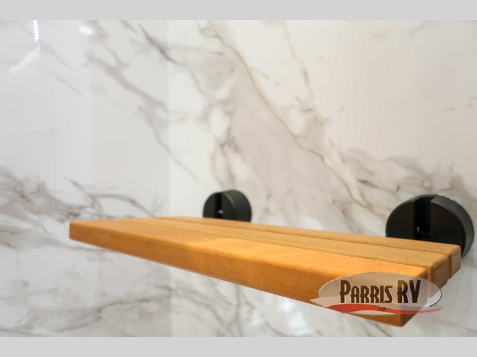 At the front of the 40DB fifth wheel, you'll find the inviting front bedroom featuring a spacious 72" x 80" king bed, perfect for a restful night's sleep. This room also includes a wardrobe and a flip-up dresser with a TV above, providing plenty of storage for clothing and essentials. Moving down the hall, one of two full bathrooms offers a 36" x 48" shower with a built-in seat for added accessibility, along with linen shelves for extra storage. At the center of the trailer, the main living area opens up with dual opposing slides for maximum comfort and room to move. One slide houses a 21-cu. ft. residential refrigerator and a 30" space-saving convection microwave with a built-in air fryer, while the central kitchen island includes a sink and pull-out cutting board, everything you need to prepare meals on the go. Across the way, the opposite slide features a roll-out table and theater seating, creating the perfect space to dine and relax after a long day. At the rear, the second bedroom includes a 60" x 80" queen bed in a slide-out with two wardrobes opposite for ample storage, plus a private full bathroom complete with a tub/shower combo and its own exterior exit for added convenience. Above it all, the loft provides three 30" x 80" bed mats and a loft cabinet, offering extra-sleeping space or additional storage for the whole family's adventures.