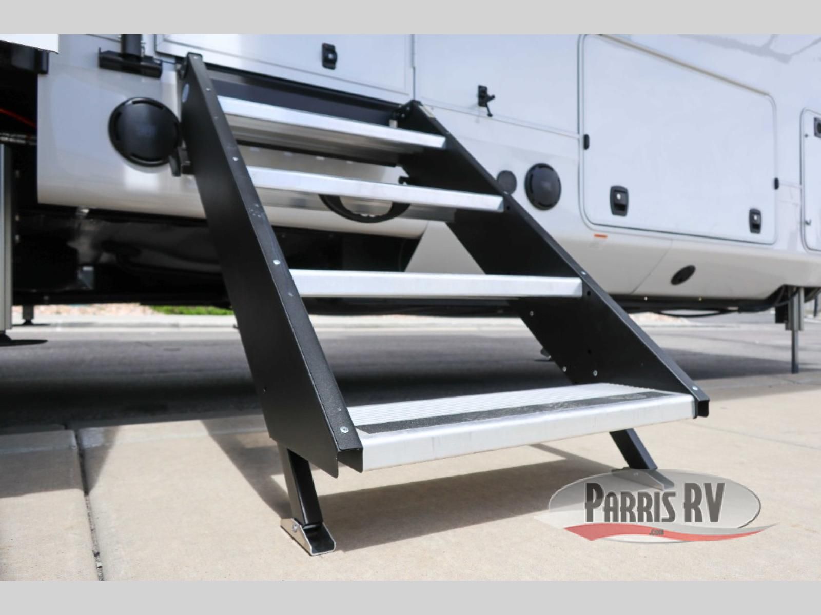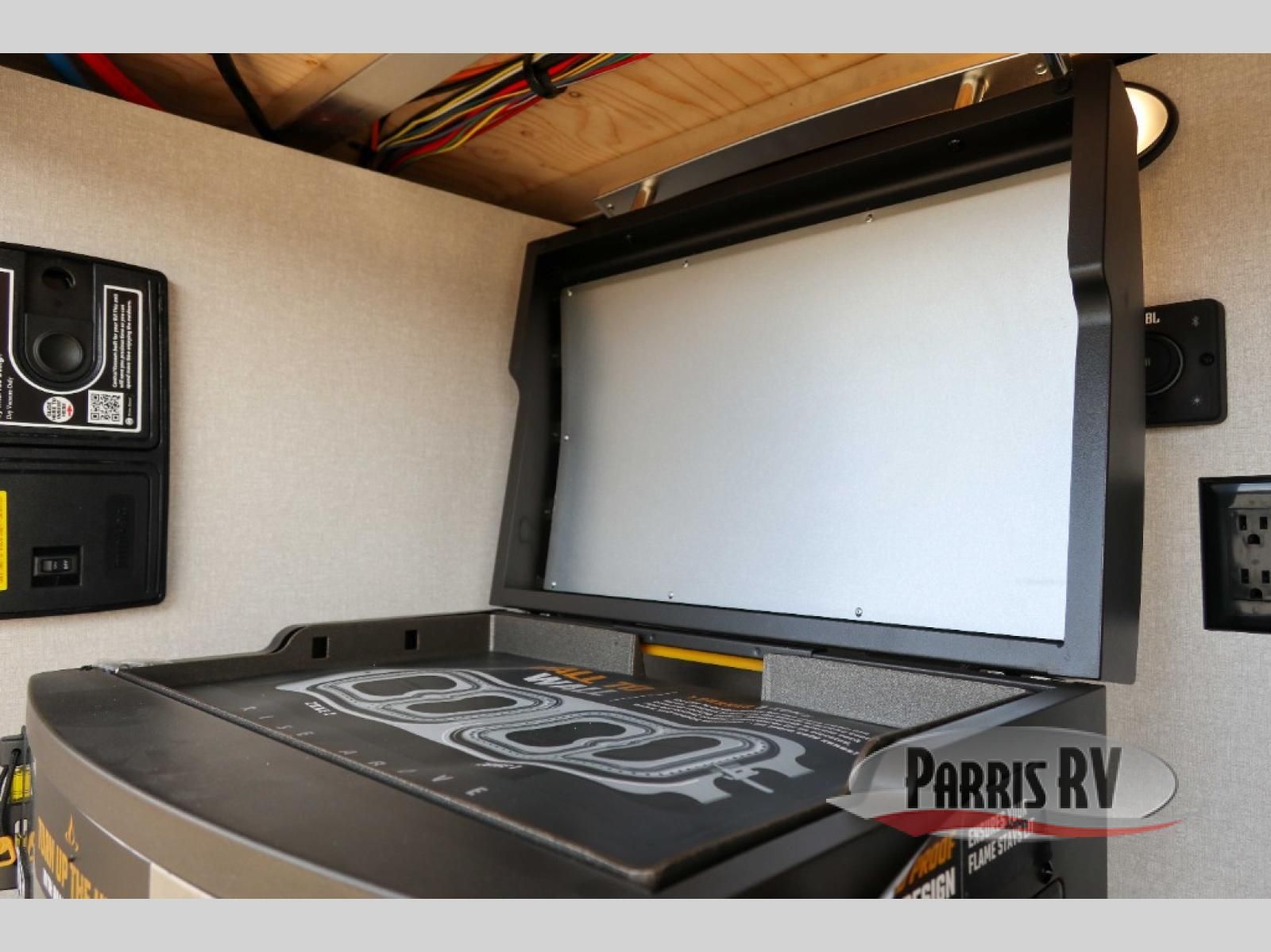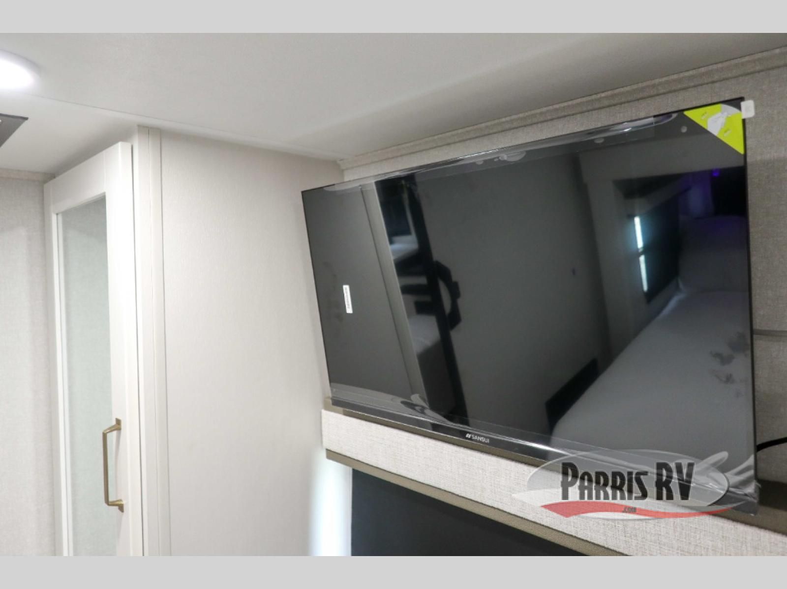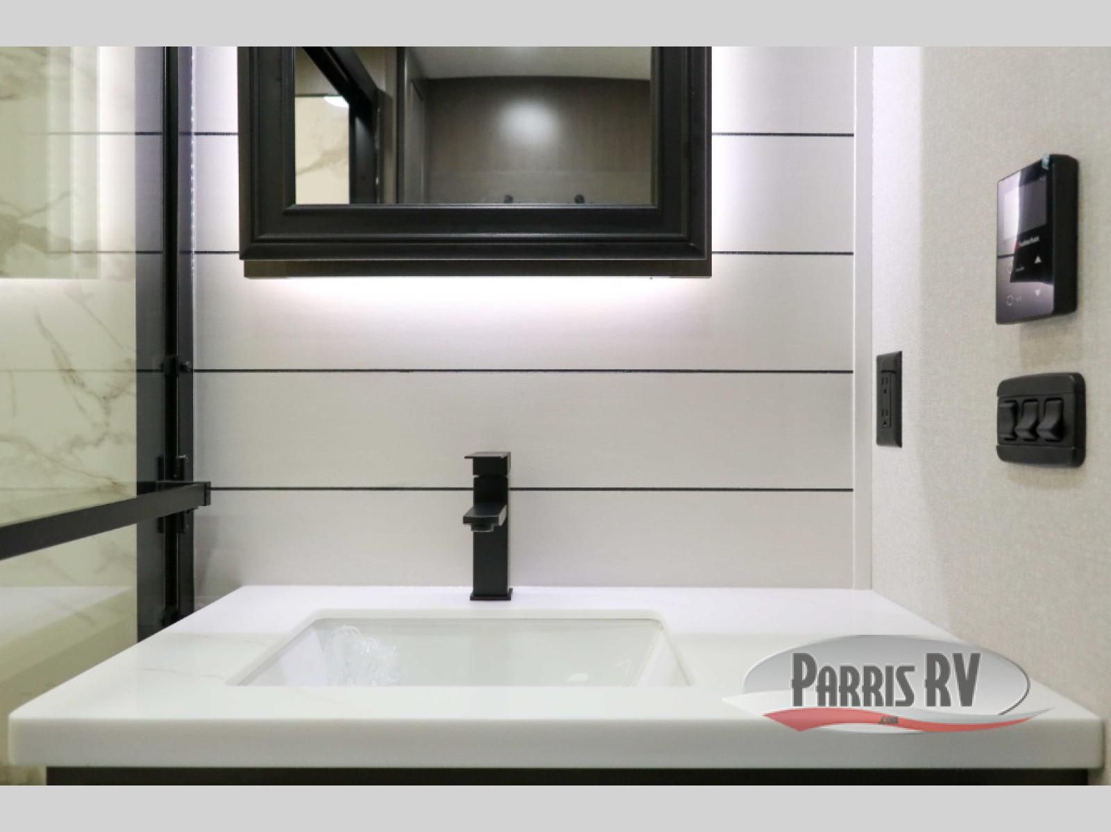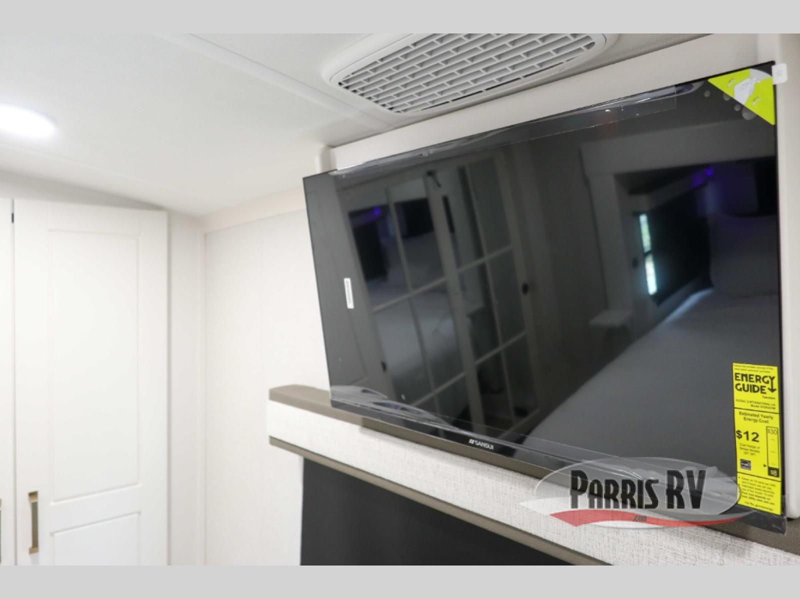 At the front of the 40DB fifth wheel, you'll find the inviting front bedroom featuring a spacious 72" x 80" king bed, perfect for a restful night's sleep. This room also includes a wardrobe and a flip-up dresser with a TV above, providing plenty of storage for clothing and essentials. Moving down the hall, one of two full bathrooms offers a 36" x 48" shower with a built-in seat for added accessibility, along with linen shelves for extra storage. At the center of the trailer, the main living area opens up with dual opposing slides for maximum comfort and room to move. One slide houses a 21-cu. ft. residential refrigerator and a 30" space-saving convection microwave with a built-in air fryer, while the central kitchen island includes a sink and pull-out cutting board, everything you need to prepare meals on the go. Across the way, the opposite slide features a roll-out table and theater seating, creating the perfect space to dine and relax after a long day. At the rear, the second bedroom includes a 60" x 80" queen bed in a slide-out with two wardrobes opposite for ample storage, plus a private full bathroom complete with a tub/shower combo and its own exterior exit for added convenience. Above it all, the loft provides three 30" x 80" bed mats and a loft cabinet, offering extra-sleeping space or additional storage for the whole family's adventures.