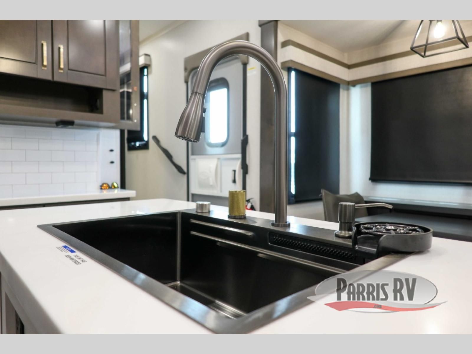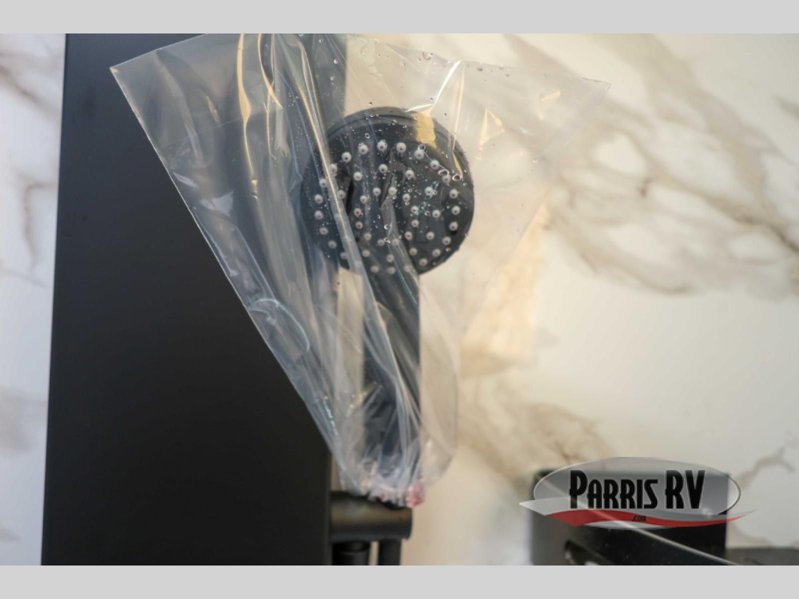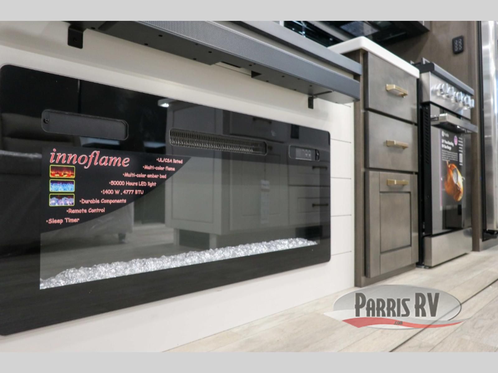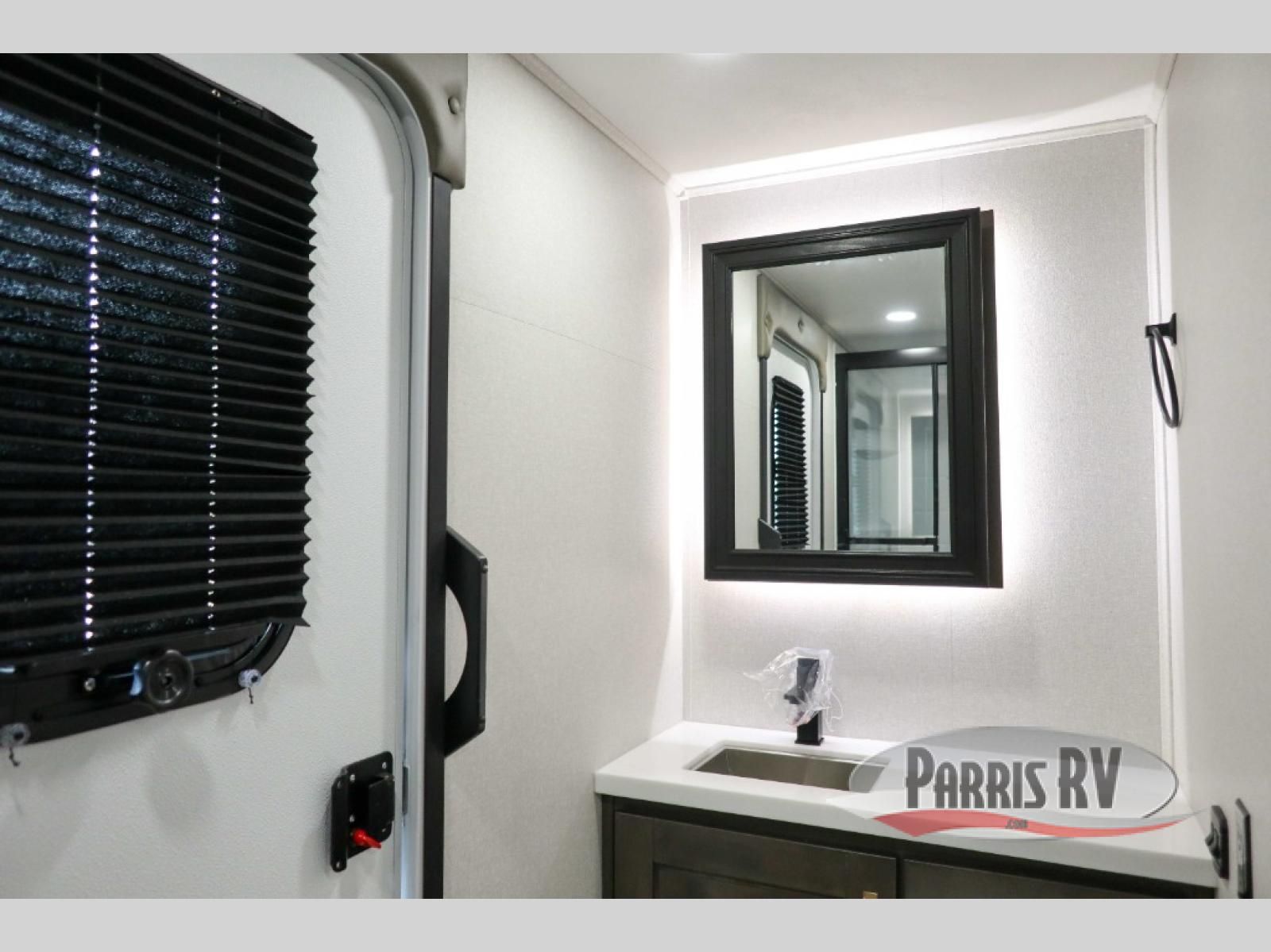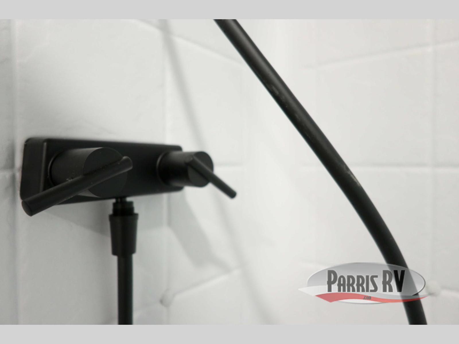 At the front of the 40DB fifth wheel, you'll find the inviting front bedroom featuring a spacious 72" x 80" king bed, perfect for a restful night's sleep. This room also includes a wardrobe and a flip-up dresser with a TV above, providing plenty of storage for clothing and essentials. Moving down the hall, one of two full bathrooms offers a 36" x 48" shower with a built-in seat for added accessibility, along with linen shelves for extra storage. At the center of the trailer, the main living area opens up with dual opposing slides for maximum comfort and room to move. One slide houses a 21-cu. ft. residential refrigerator and a 30" space-saving convection microwave with a built-in air fryer, while the central kitchen island includes a sink and pull-out cutting board, everything you need to prepare meals on the go. Across the way, the opposite slide features a roll-out table and theater seating, creating the perfect space to dine and relax after a long day. At the rear, the second bedroom includes a 60" x 80" queen bed in a slide-out with two wardrobes opposite for ample storage, plus a private full bathroom complete with a tub/shower combo and its own exterior exit for added convenience. Above it all, the loft provides three 30" x 80" bed mats and a loft cabinet, offering extra-sleeping space or additional storage for the whole family's adventures.