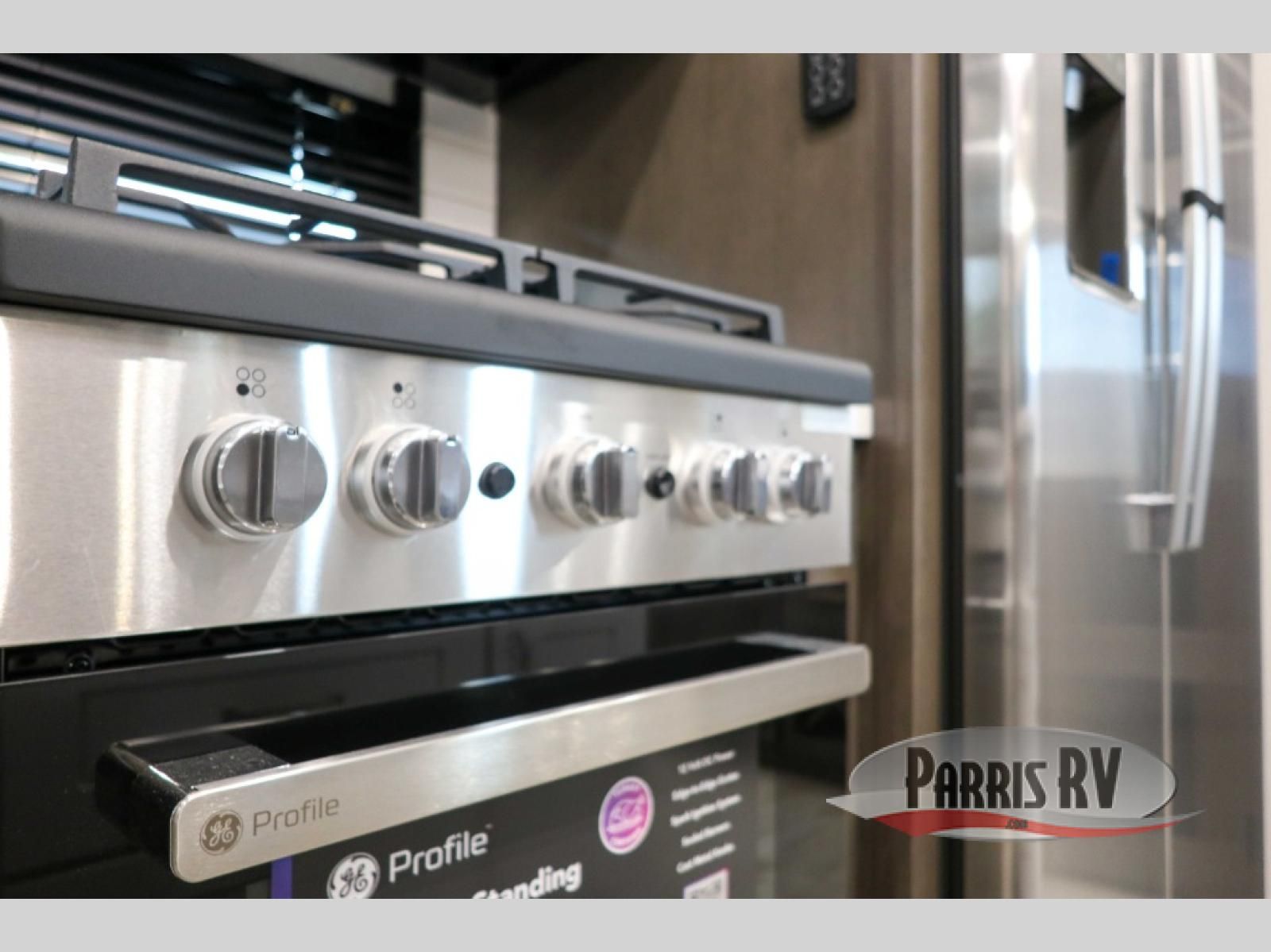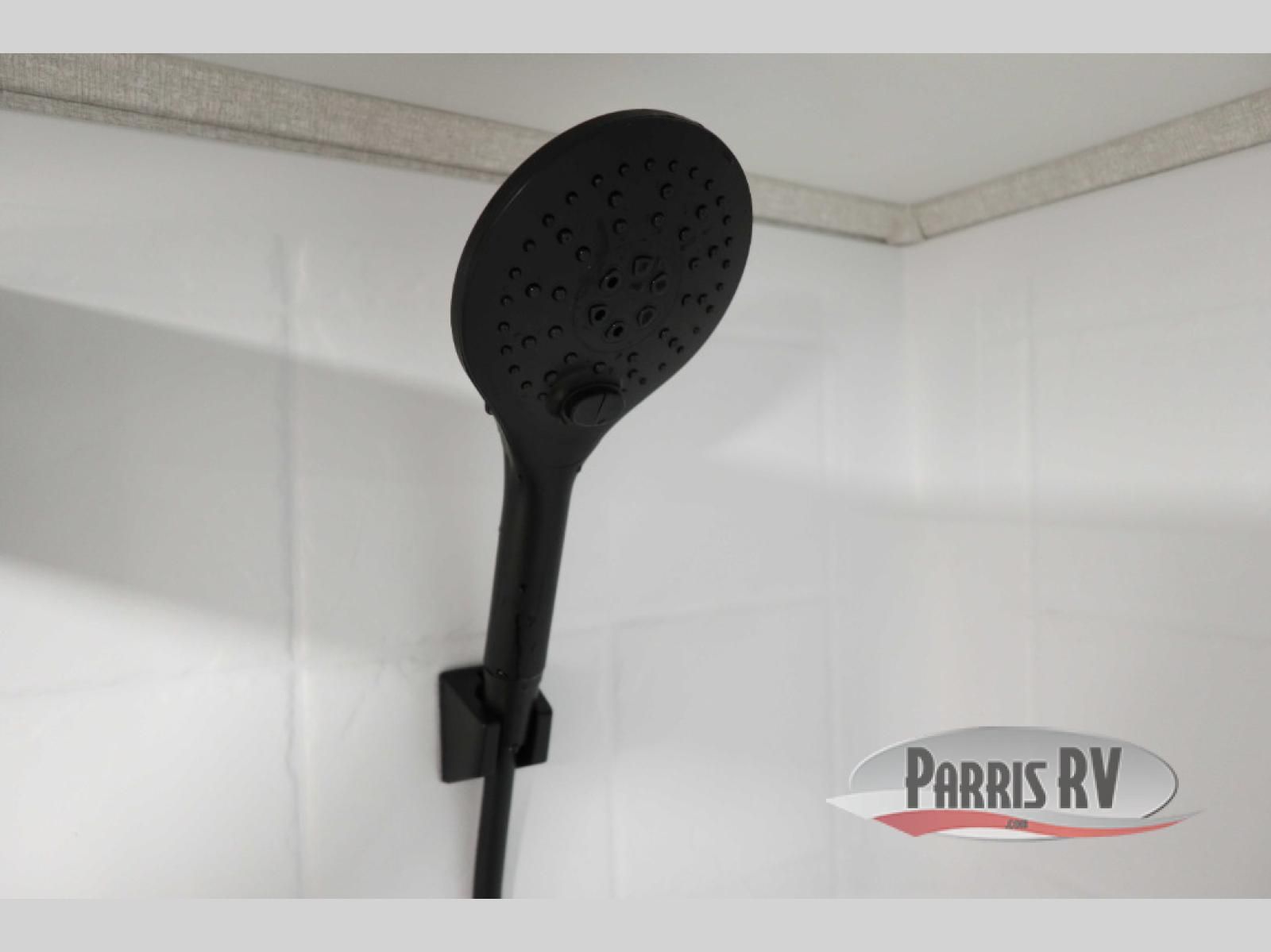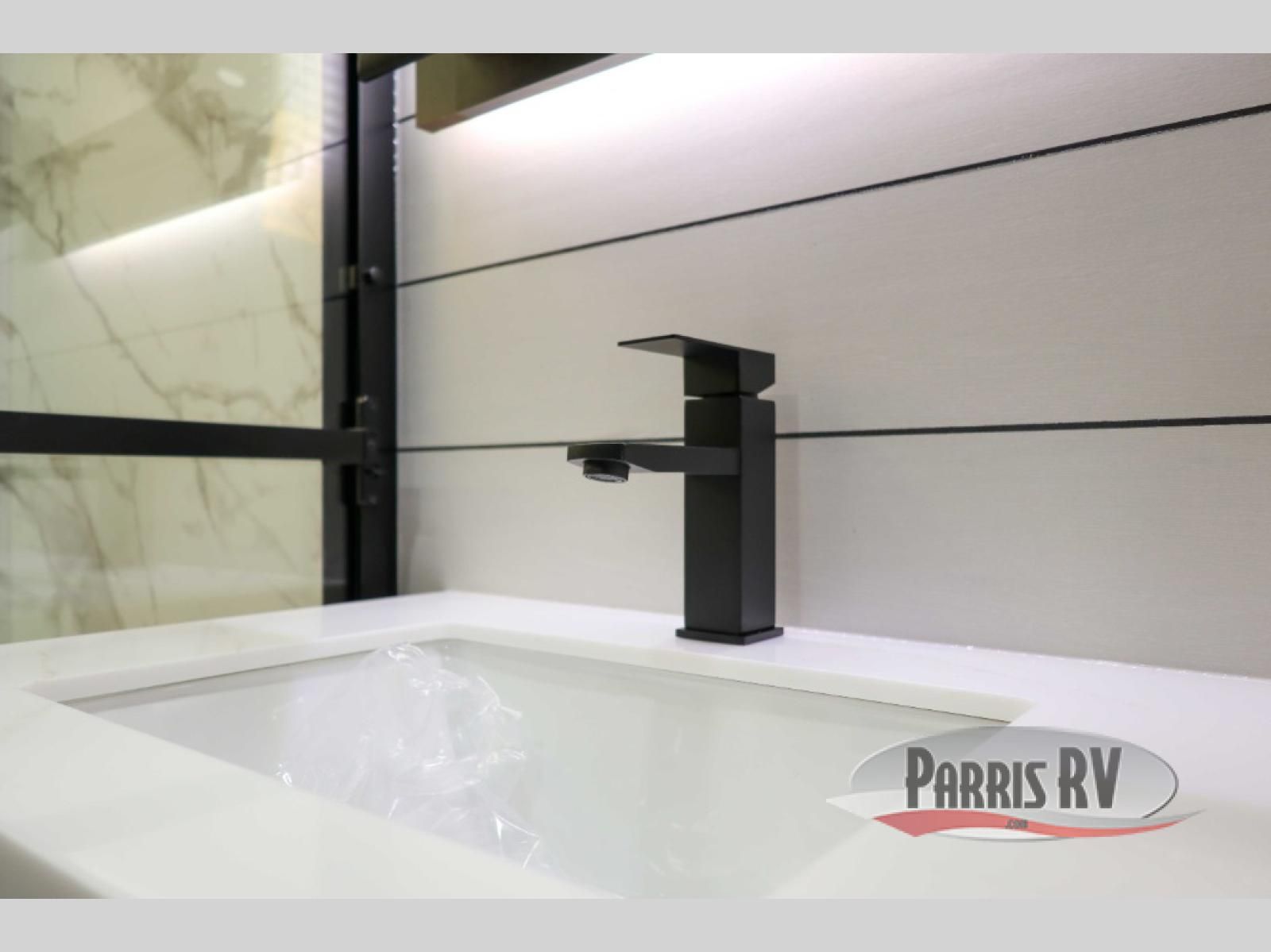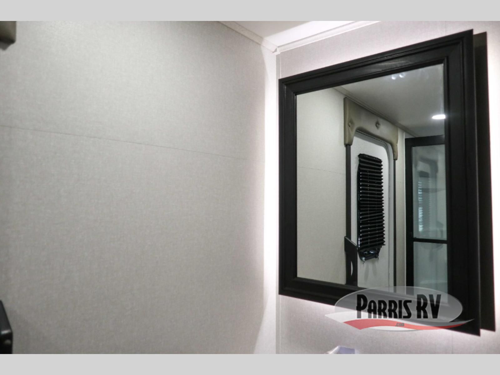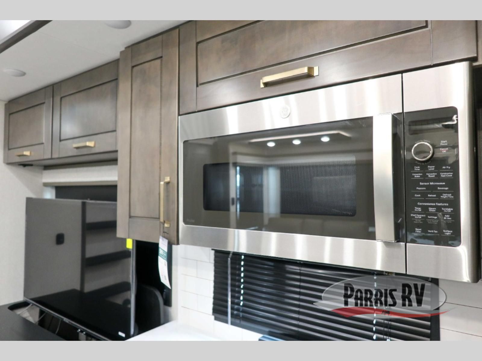 At the front of the 40DB fifth wheel, you'll find the inviting front bedroom featuring a spacious 72" x 80" king bed, perfect for a restful night's sleep. This room also includes a wardrobe and a flip-up dresser with a TV above, providing plenty of storage for clothing and essentials. Moving down the hall, one of two full bathrooms offers a 36" x 48" shower with a built-in seat for added accessibility, along with linen shelves for extra storage. At the center of the trailer, the main living area opens up with dual opposing slides for maximum comfort and room to move. One slide houses a 21-cu. ft. residential refrigerator and a 30" space-saving convection microwave with a built-in air fryer, while the central kitchen island includes a sink and pull-out cutting board, everything you need to prepare meals on the go. Across the way, the opposite slide features a roll-out table and theater seating, creating the perfect space to dine and relax after a long day. At the rear, the second bedroom includes a 60" x 80" queen bed in a slide-out with two wardrobes opposite for ample storage, plus a private full bathroom complete with a tub/shower combo and its own exterior exit for added convenience. Above it all, the loft provides three 30" x 80" bed mats and a loft cabinet, offering extra-sleeping space or additional storage for the whole family's adventures.