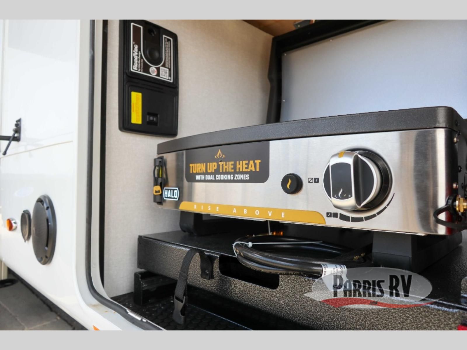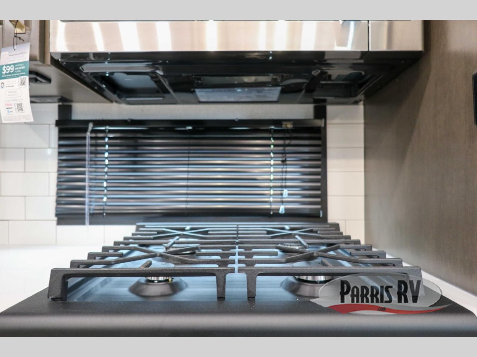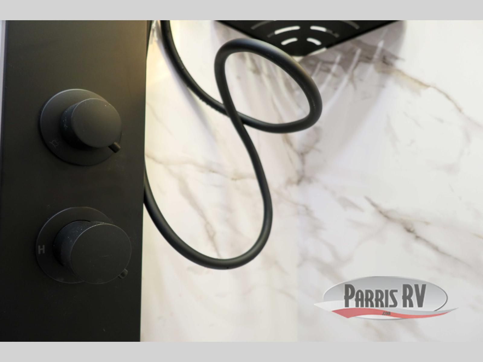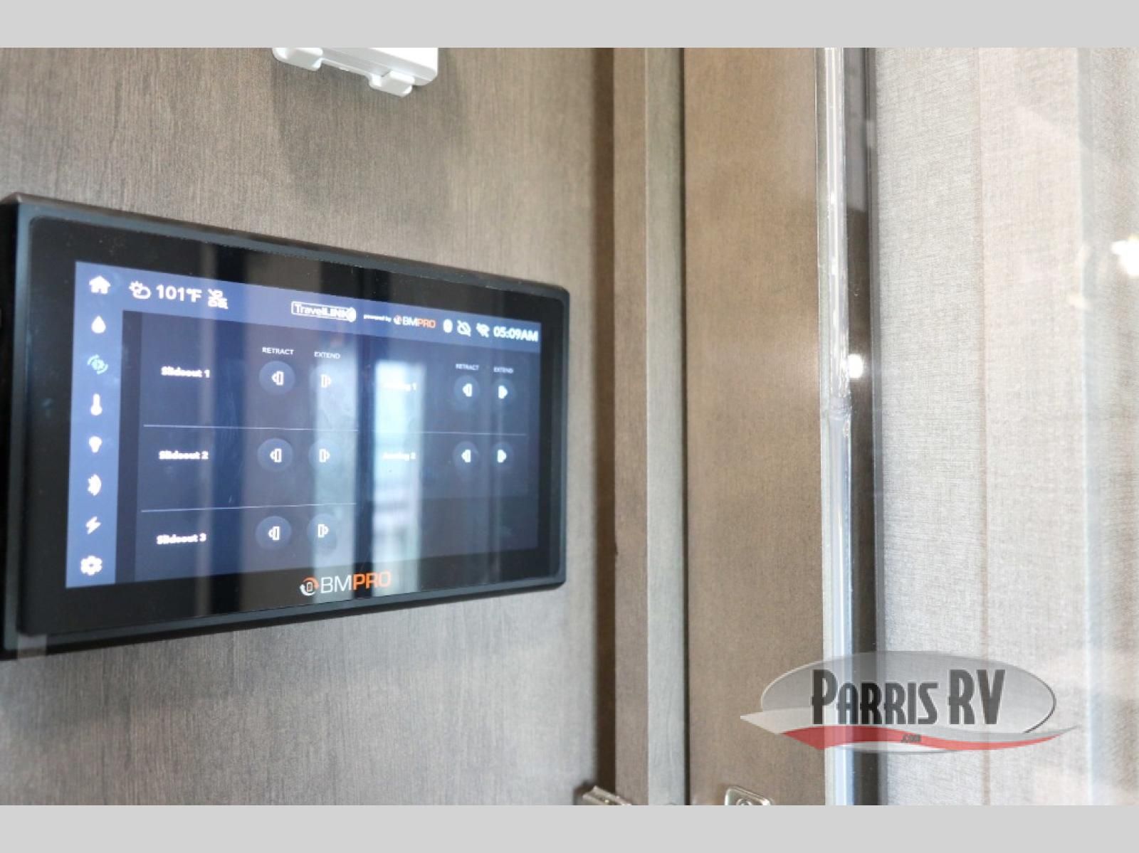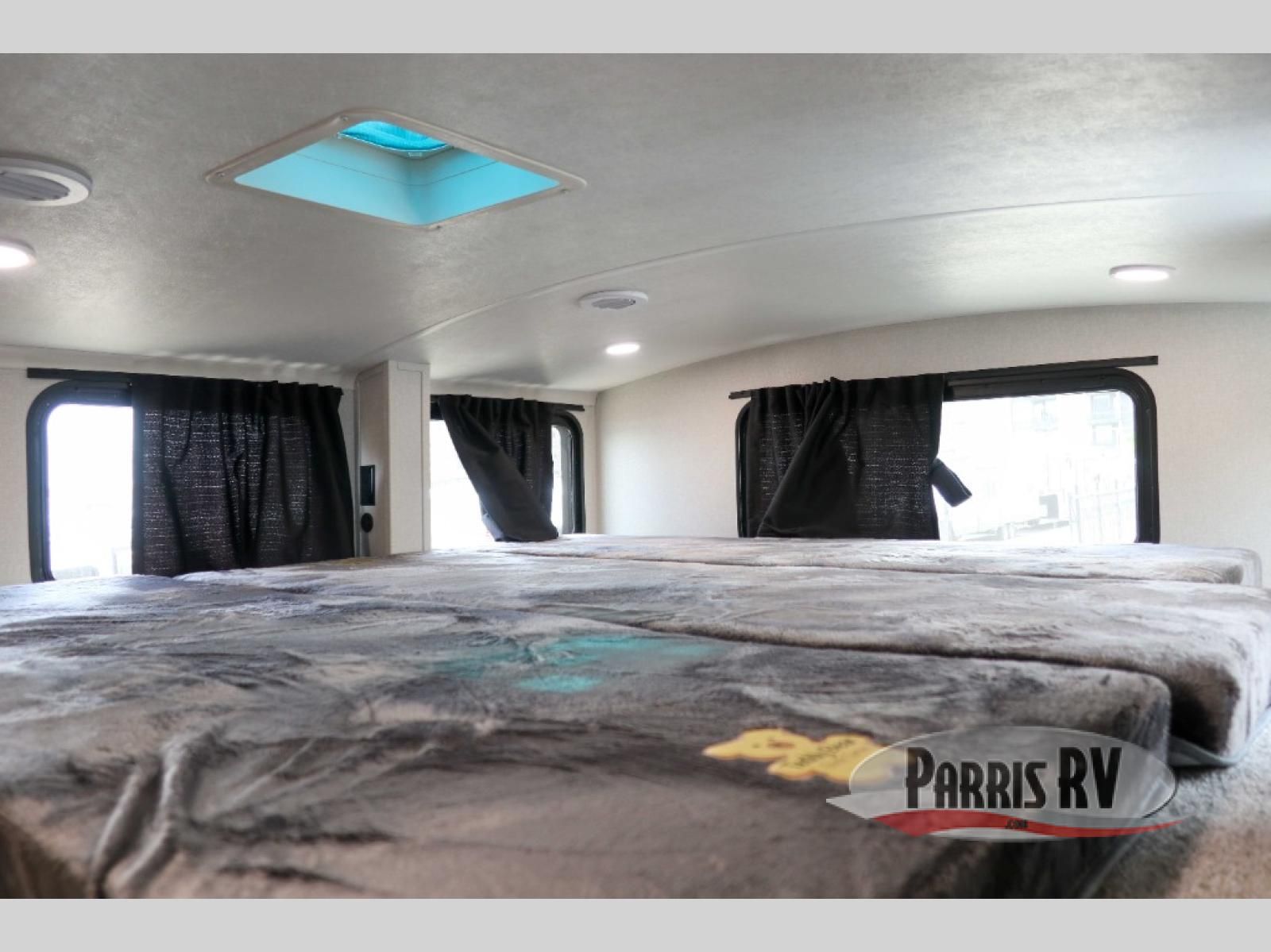 At the front of the 40DB fifth wheel, you'll find the inviting front bedroom featuring a spacious 72" x 80" king bed, perfect for a restful night's sleep. This room also includes a wardrobe and a flip-up dresser with a TV above, providing plenty of storage for clothing and essentials. Moving down the hall, one of two full bathrooms offers a 36" x 48" shower with a built-in seat for added accessibility, along with linen shelves for extra storage. At the center of the trailer, the main living area opens up with dual opposing slides for maximum comfort and room to move. One slide houses a 21-cu. ft. residential refrigerator and a 30" space-saving convection microwave with a built-in air fryer, while the central kitchen island includes a sink and pull-out cutting board, everything you need to prepare meals on the go. Across the way, the opposite slide features a roll-out table and theater seating, creating the perfect space to dine and relax after a long day. At the rear, the second bedroom includes a 60" x 80" queen bed in a slide-out with two wardrobes opposite for ample storage, plus a private full bathroom complete with a tub/shower combo and its own exterior exit for added convenience. Above it all, the loft provides three 30" x 80" bed mats and a loft cabinet, offering extra-sleeping space or additional storage for the whole family's adventures.