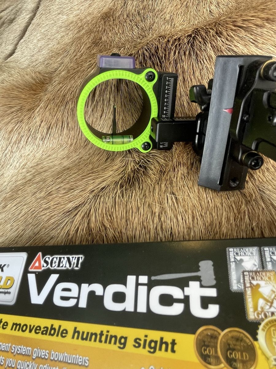 VenmoMBG Ascent Verdict sight. Has single .10 pin, has the shorter mountain light frame, 3rd axis, ordered custom from SS Archery, never used.