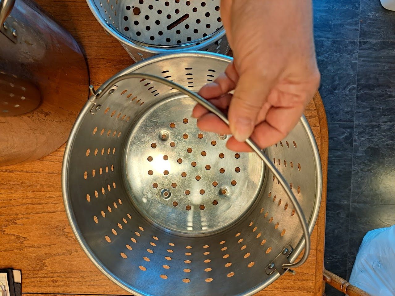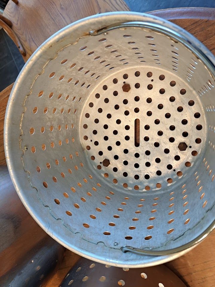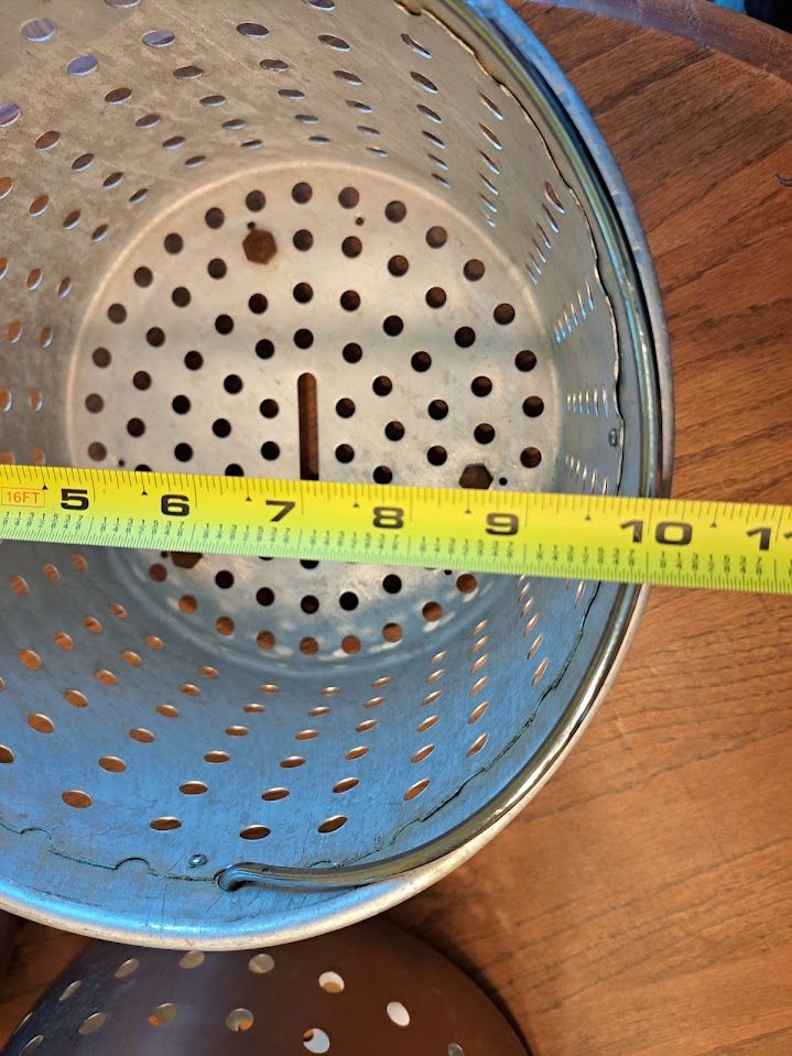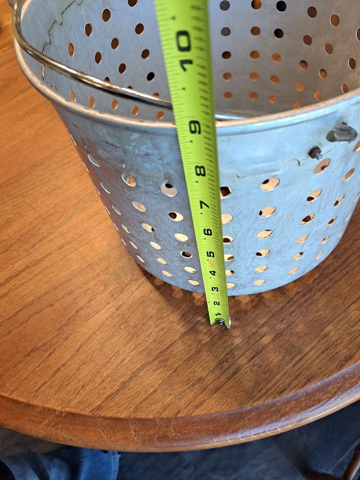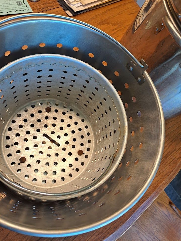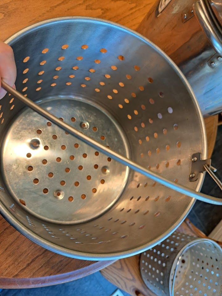 On the bottom of the smaller basket, we added bolts that serve as feet. This keeps the smaller basket off the bottom so oil or water will flow beneath it. It cooks better that way.