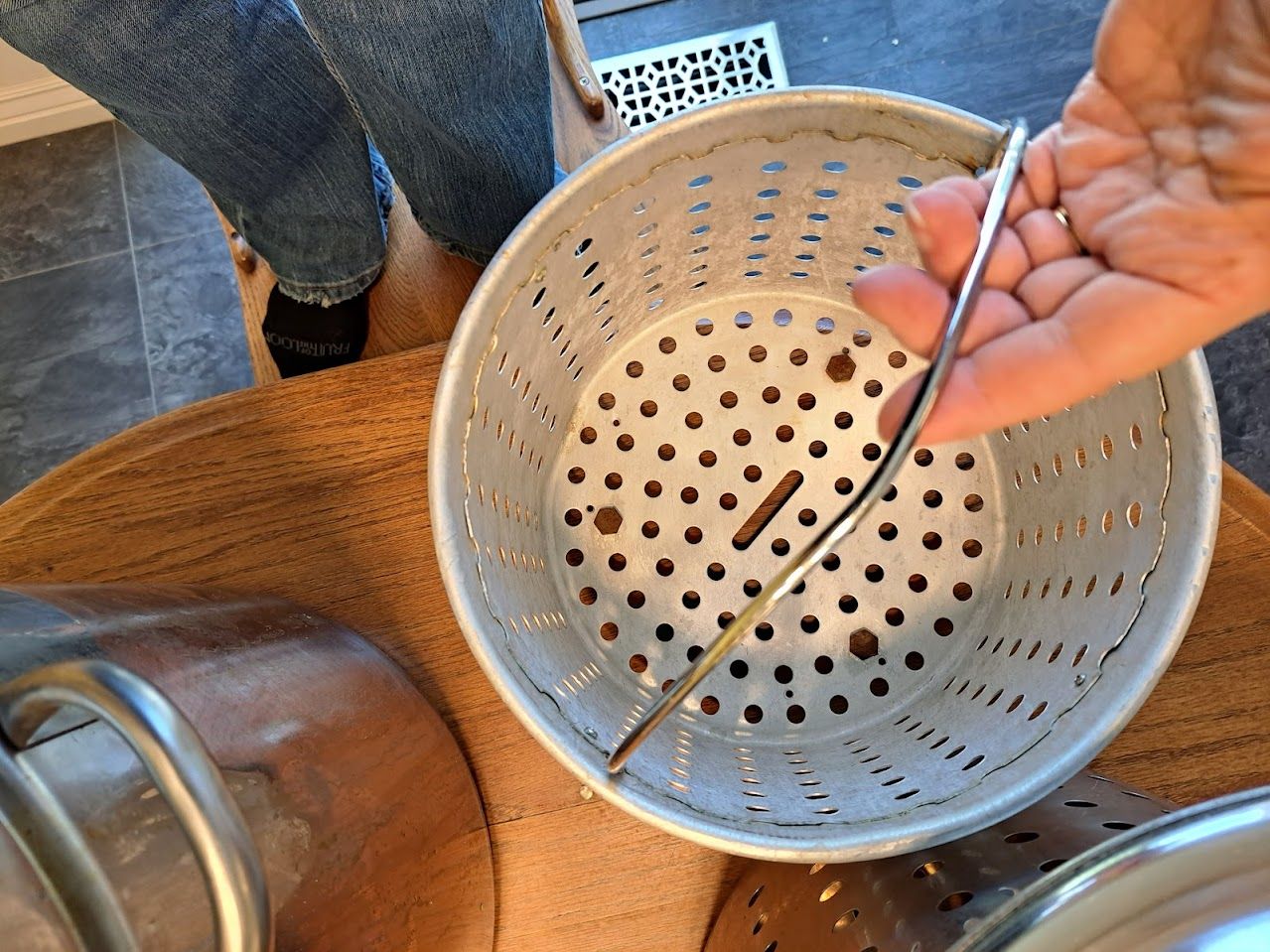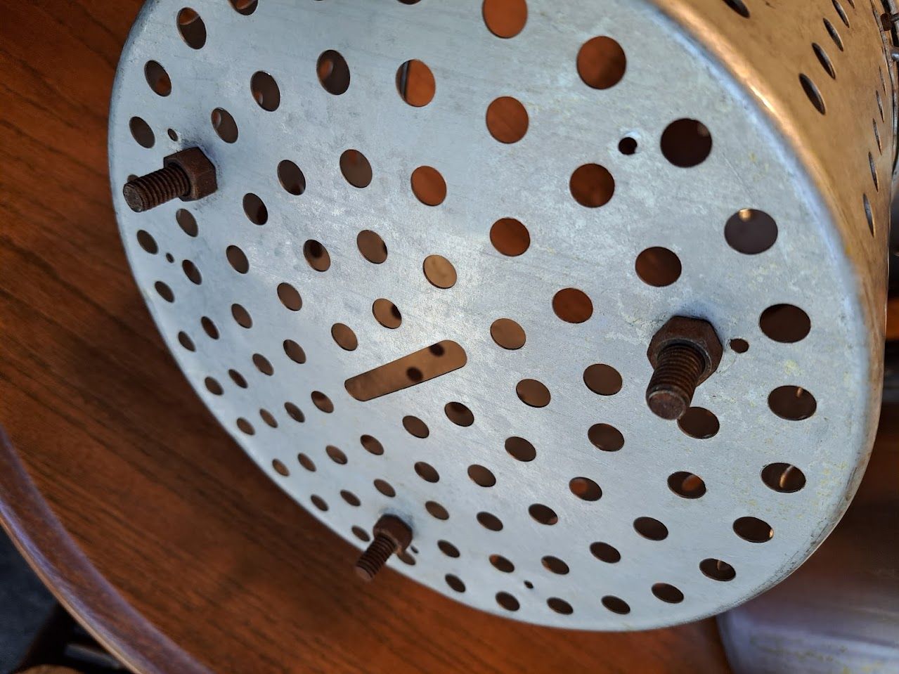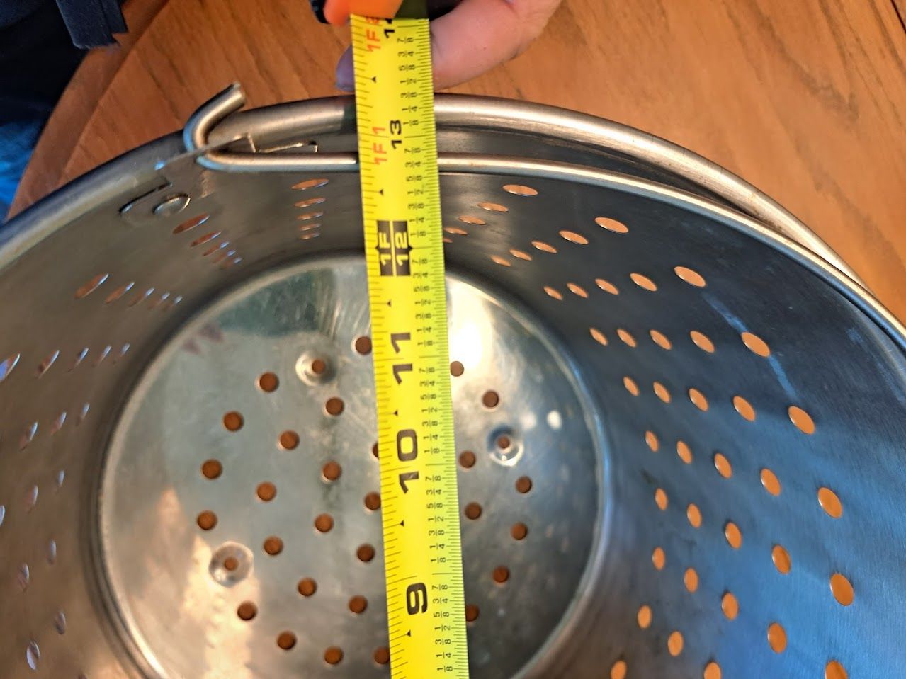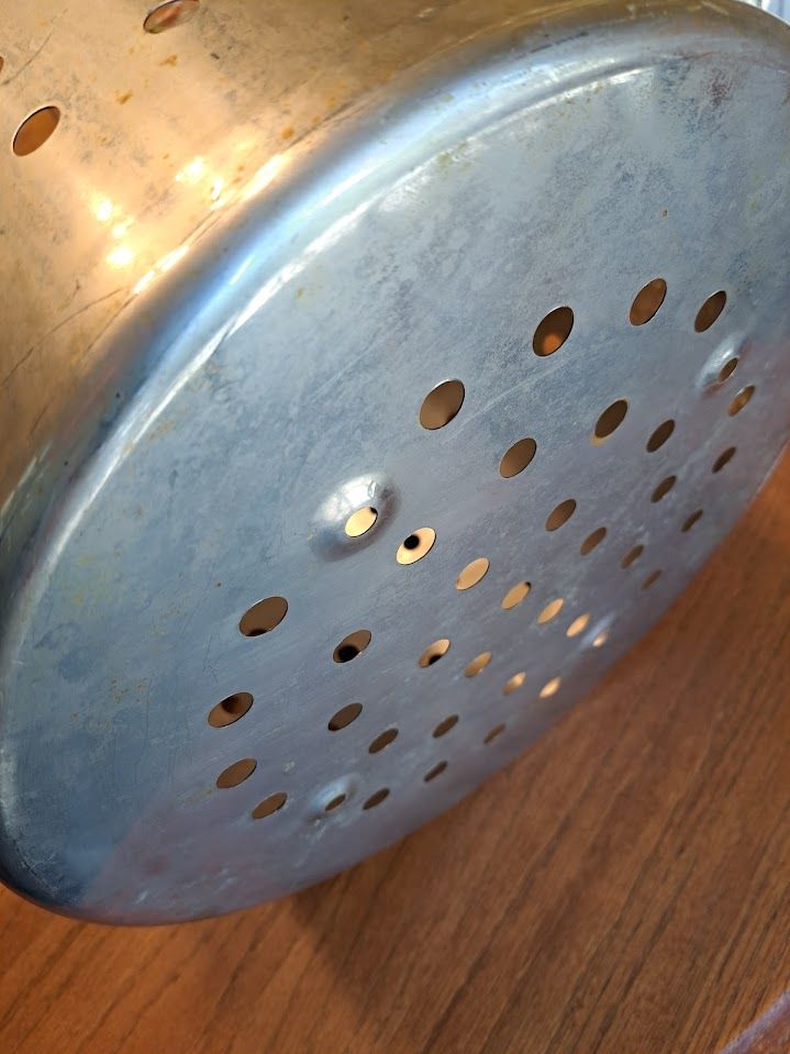 On the bottom of the smaller basket, we added bolts that serve as feet. This keeps the smaller basket off the bottom so oil or water will flow beneath it. It cooks better that way.