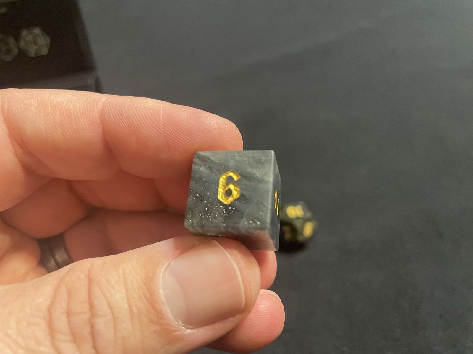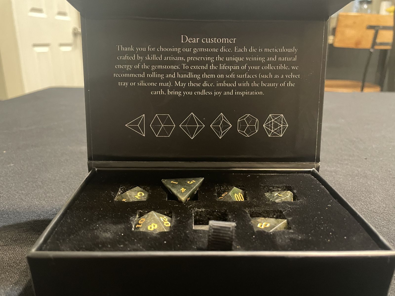ApplePayBeautiful set of dice. Gemstone Labrodite comes in a nice case that can double as a rolling tray. Prismatic in light.