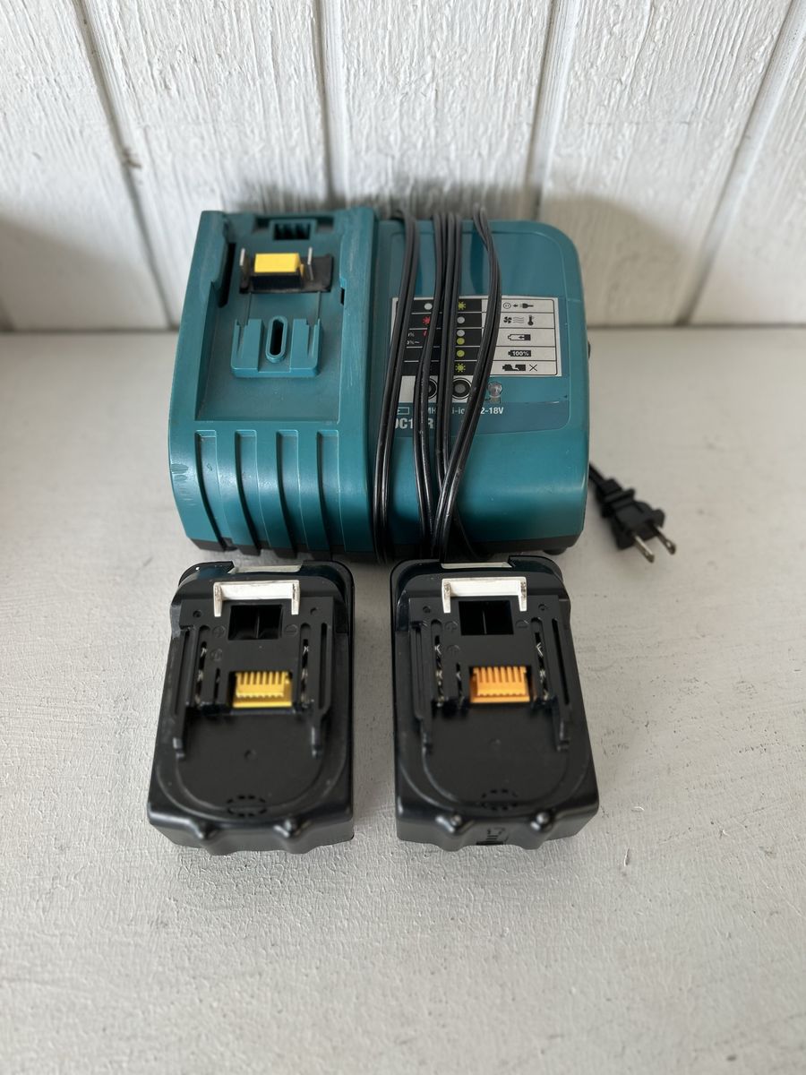 3 inch 18 V hand grinder with extra cutoff wheels and blades. 2 18 V batteries and charger.