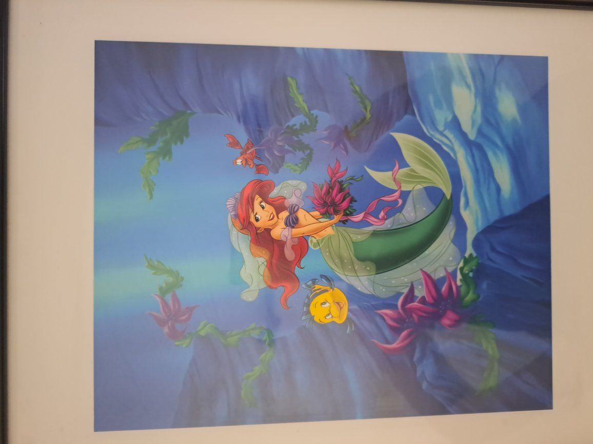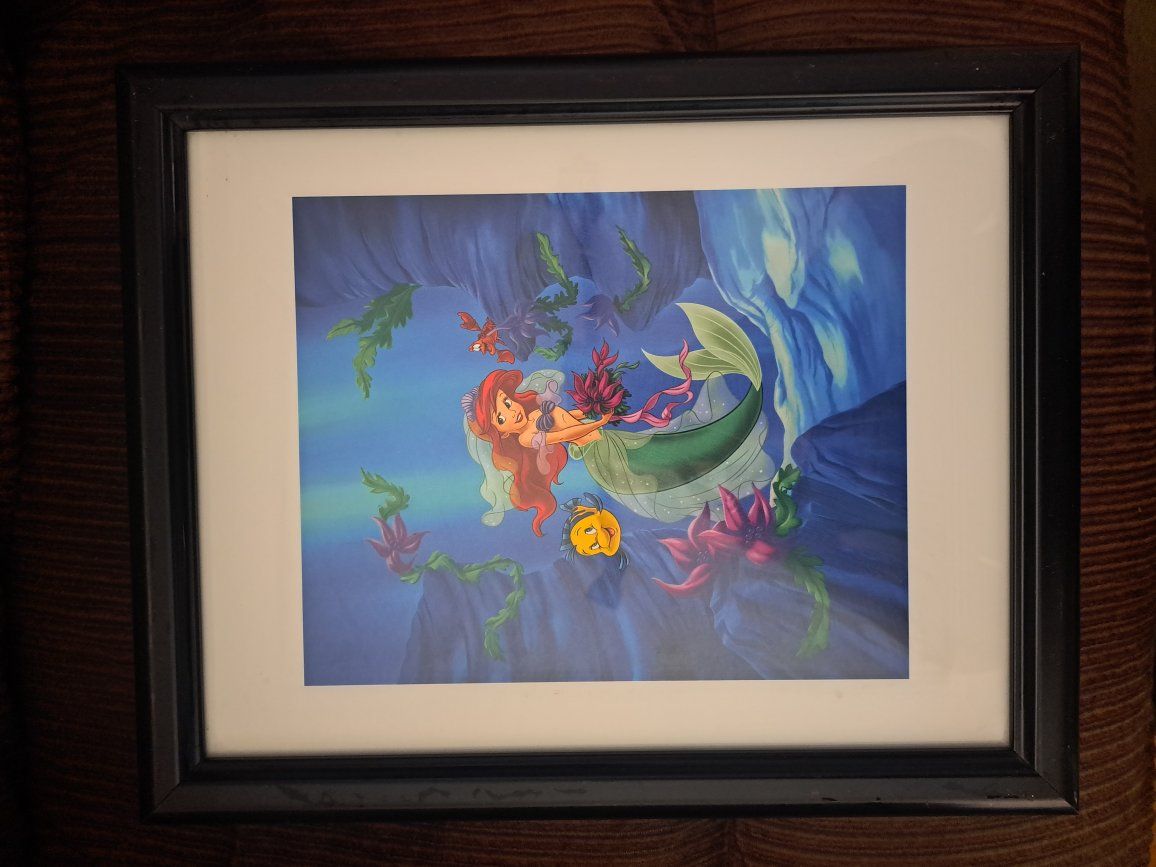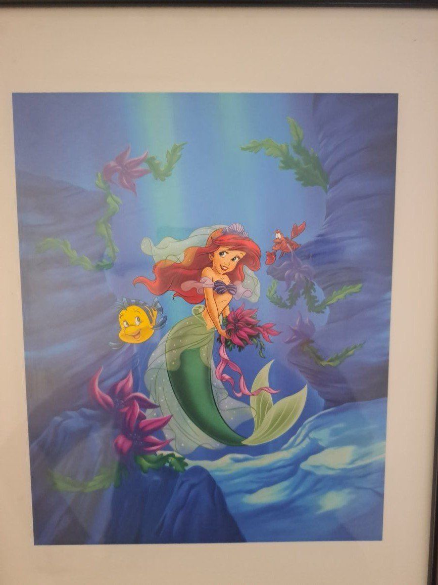 Cute Disney Little Mermaid picture. In good condition. Measures almost 13 inches across and almost 16 inches down. The frame is black. This item comes from a smoke free home. Please contact me by text.