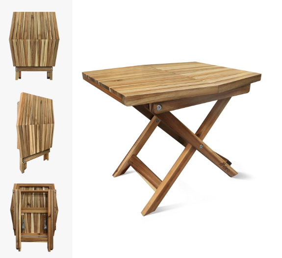 Solid Acacia Wood with a beautiful teak finish! This high-quality solid wood table makes a great addition to your patio, pool, or living room. You could even use it in your bedroom as a unique side table or night stand. The table is made of high-quality solid acacia hardwood, which is characterized by excellent weather-resistance and durability. This table is suitable for both outdoor or indoor use. It can be easily folded away for storage or transportation. NO assembly is necessary! The Melino table simply unfolds right from the box, so you can enjoy it right away! Although this versatile table was designed to complement your Melino chairs, it can also complement different styles of chairs, benches, and other seating, so you can create a gathering space that best fits your living area.