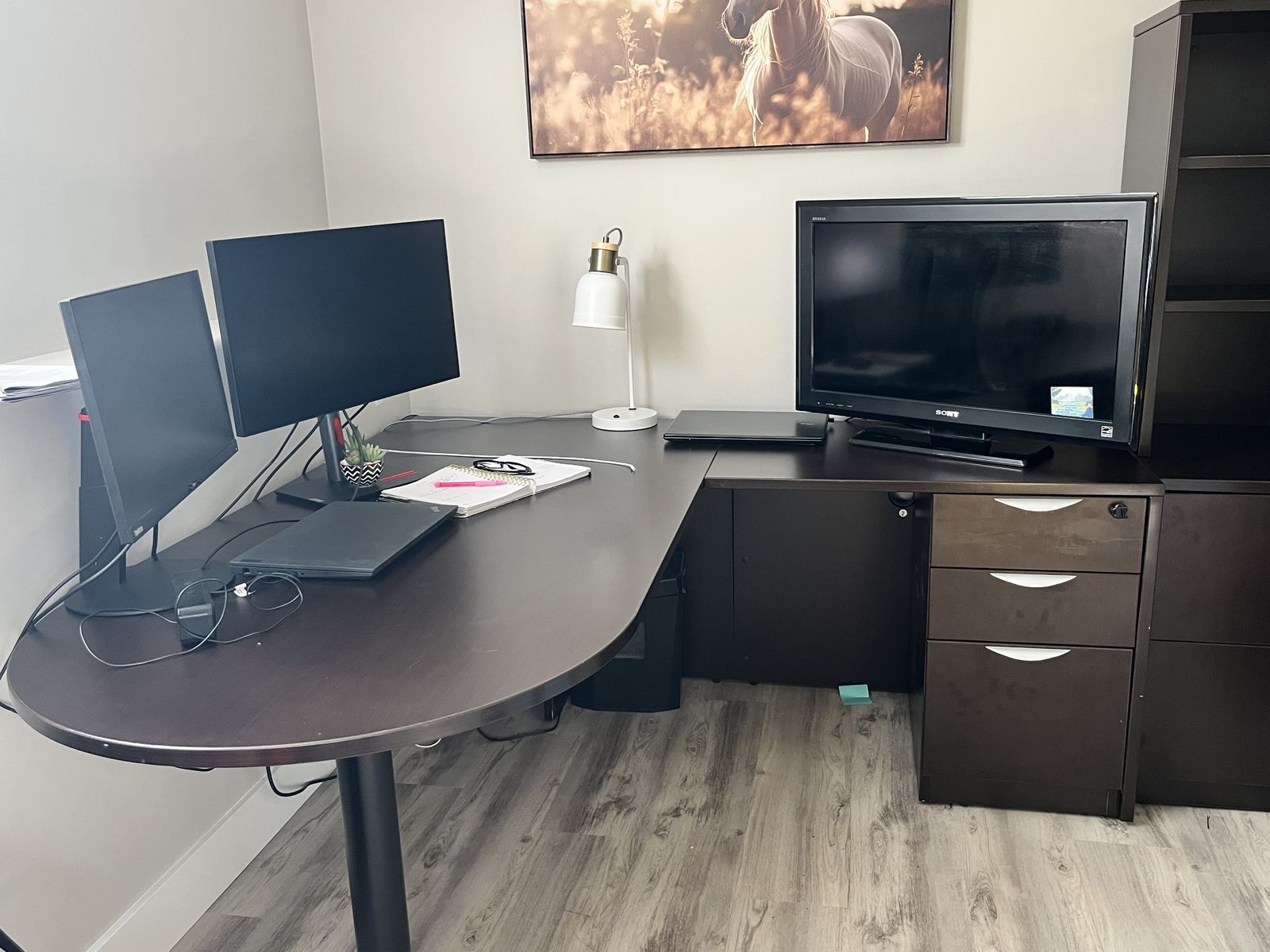 VenmoHeavy large corner desk. Came from professional office setting. TV and computers NOT included. Has matching credenza listed seperate but will sell together if asked . Will need to have help and truck to move .