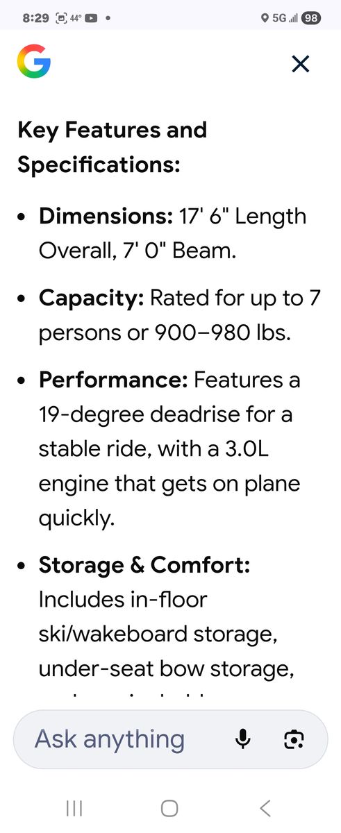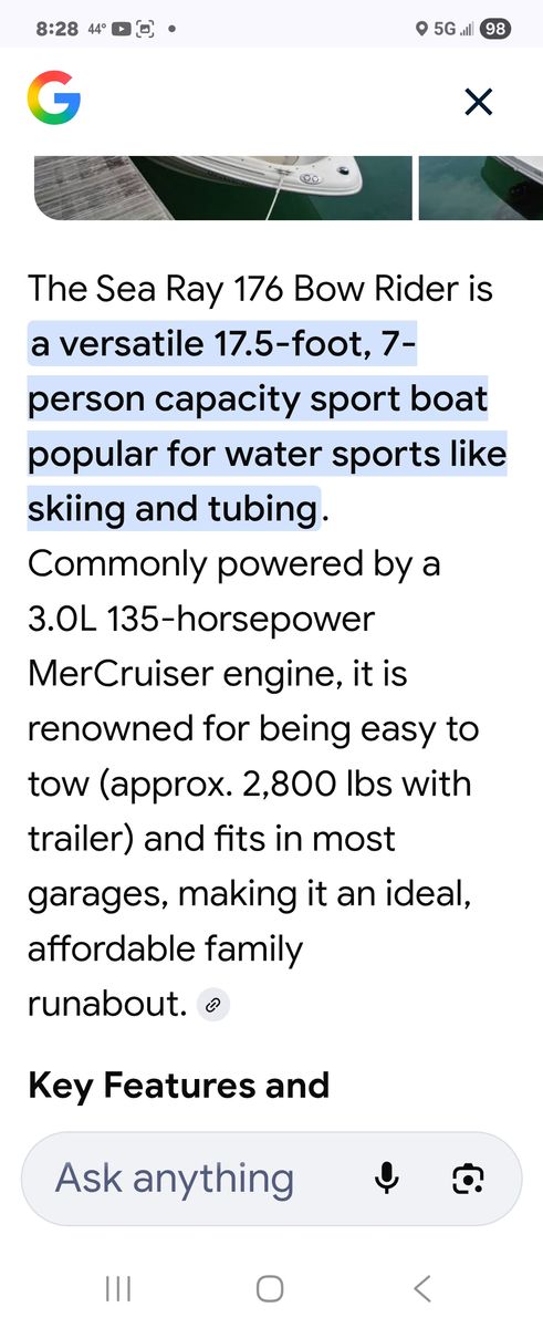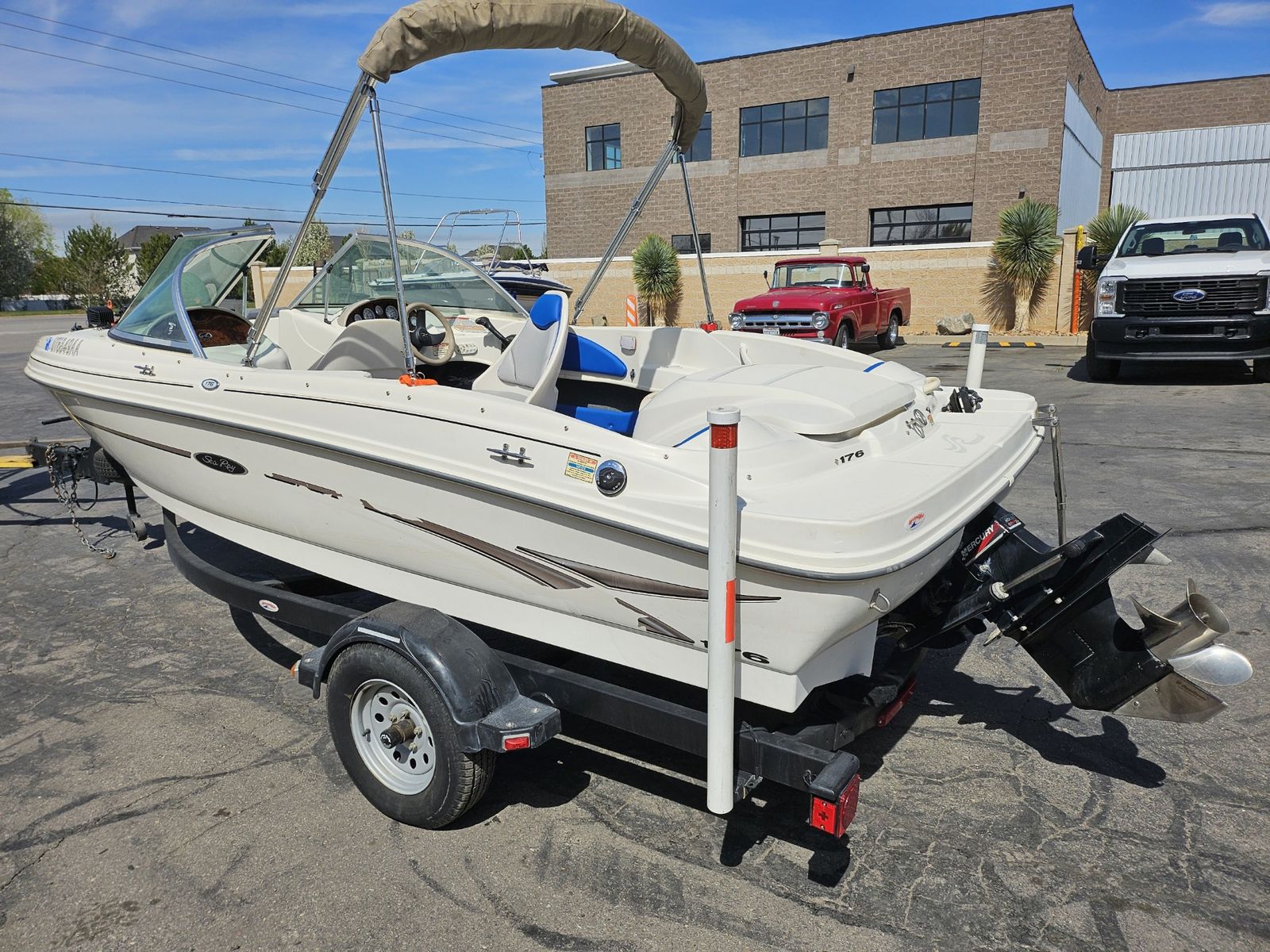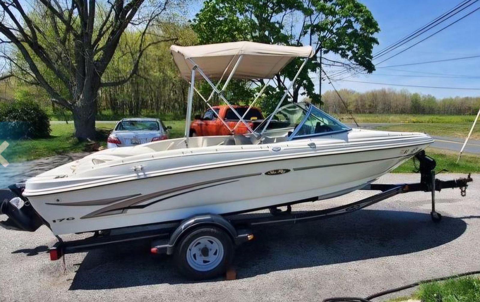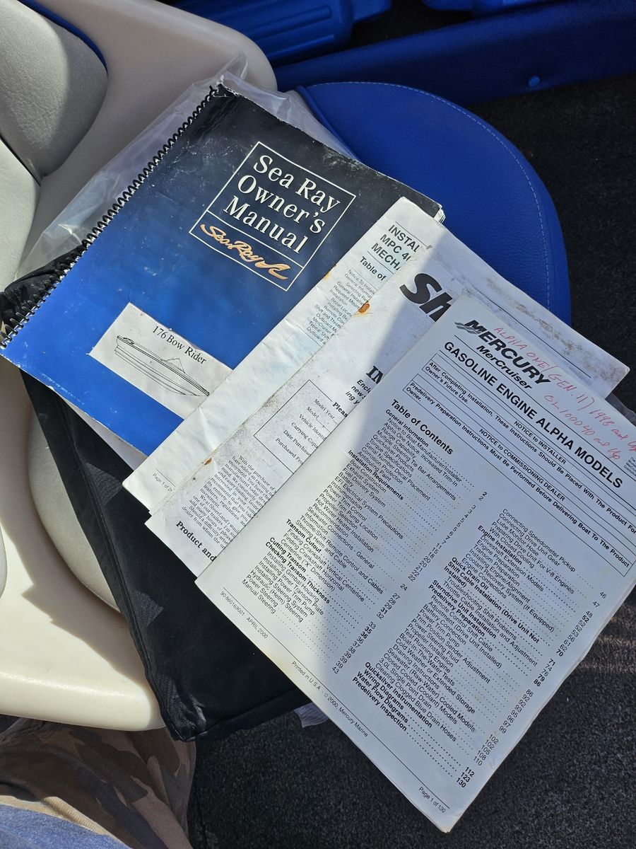 Sea Ray 176 Boat Excellent Condition Runs Great!! Good on gas, all new upholstery and carpet low hours only 199.4, New trailer tires, new stero and speakers, rated for 7 people, one stanless steel prop and one alumunum prop both new,New oil and filters and tune up, New water pump and carburator, come with ropes, anchors, fenders, Readu to go have fun on the water.