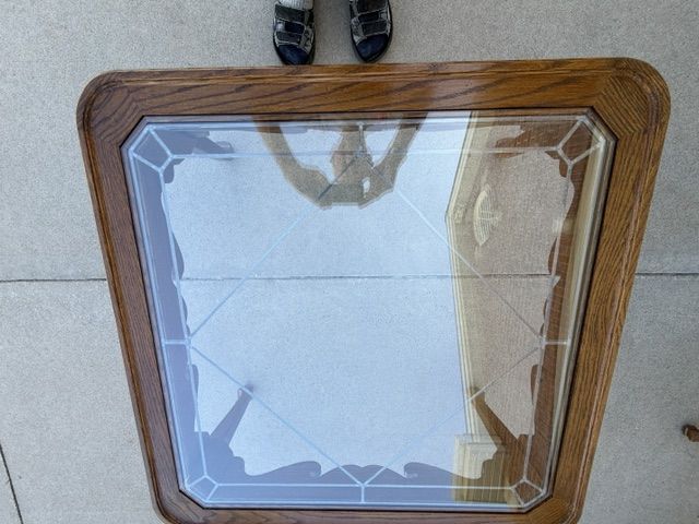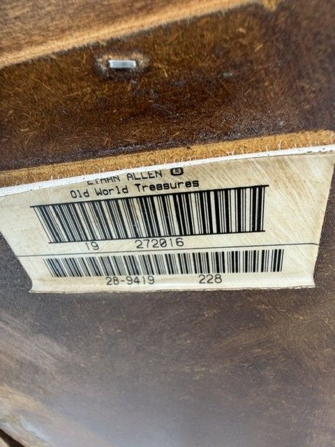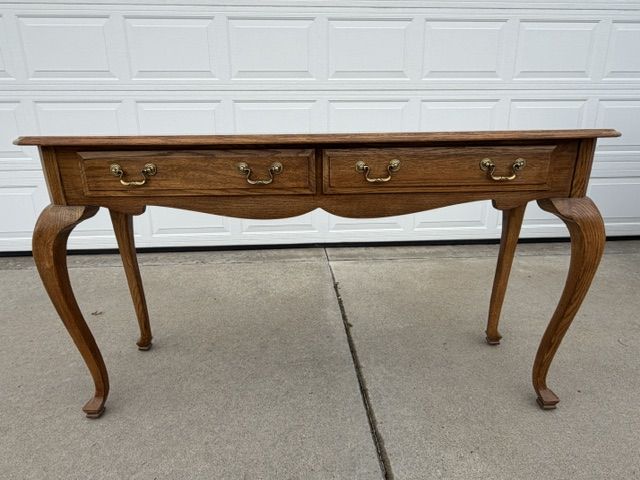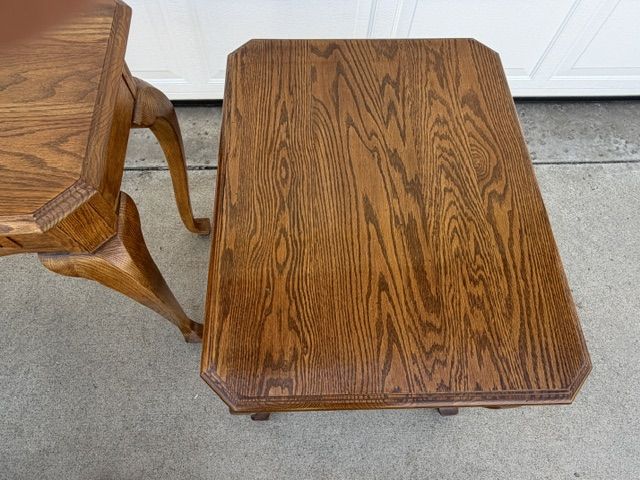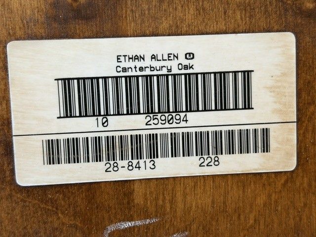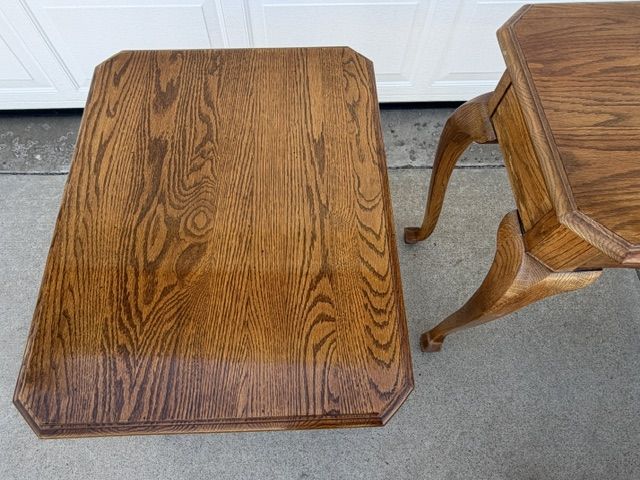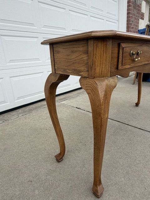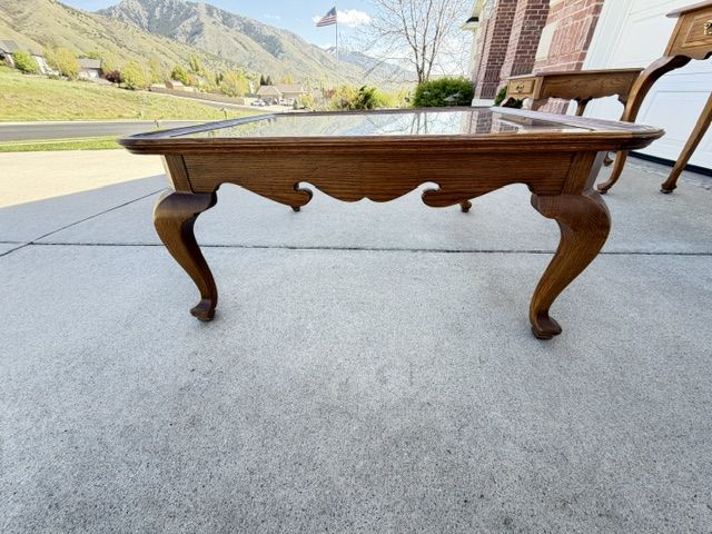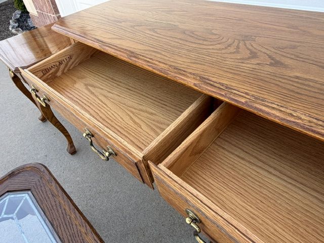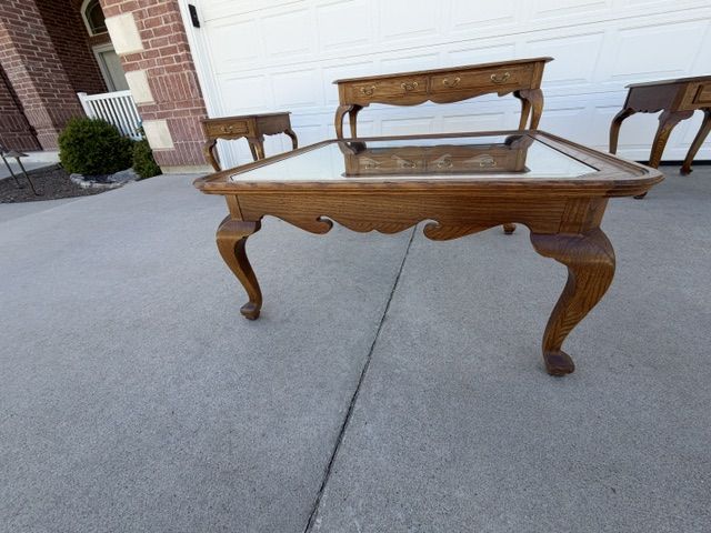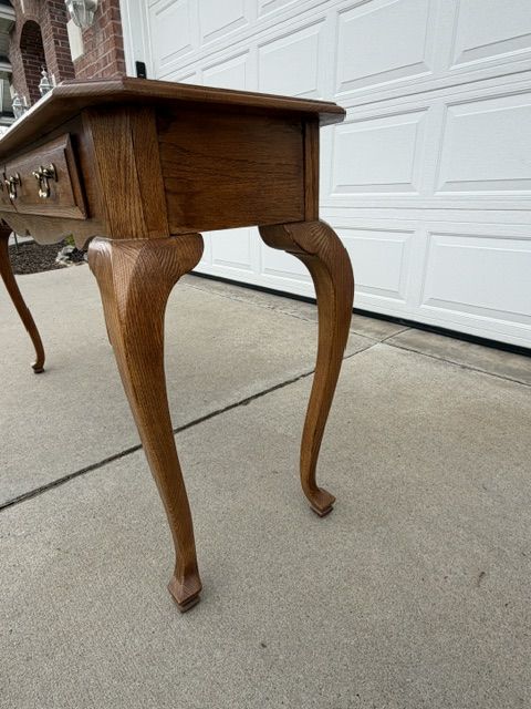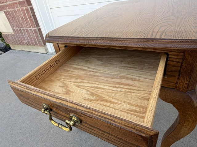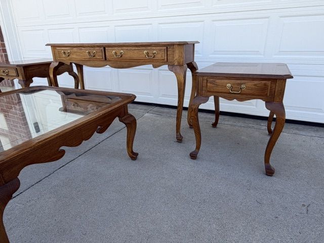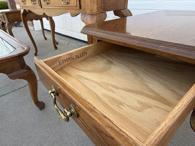 ZelleEthan Allen Canterbury Oak Vintage furniture for sale including 2 end tables, a square coffee table (with a leaded glass top), and a sofa / console table. All of the pieces have Queen Ann legs and the medium brown Ethan Allen oak finish. A more detailed description of each piece is listed below: