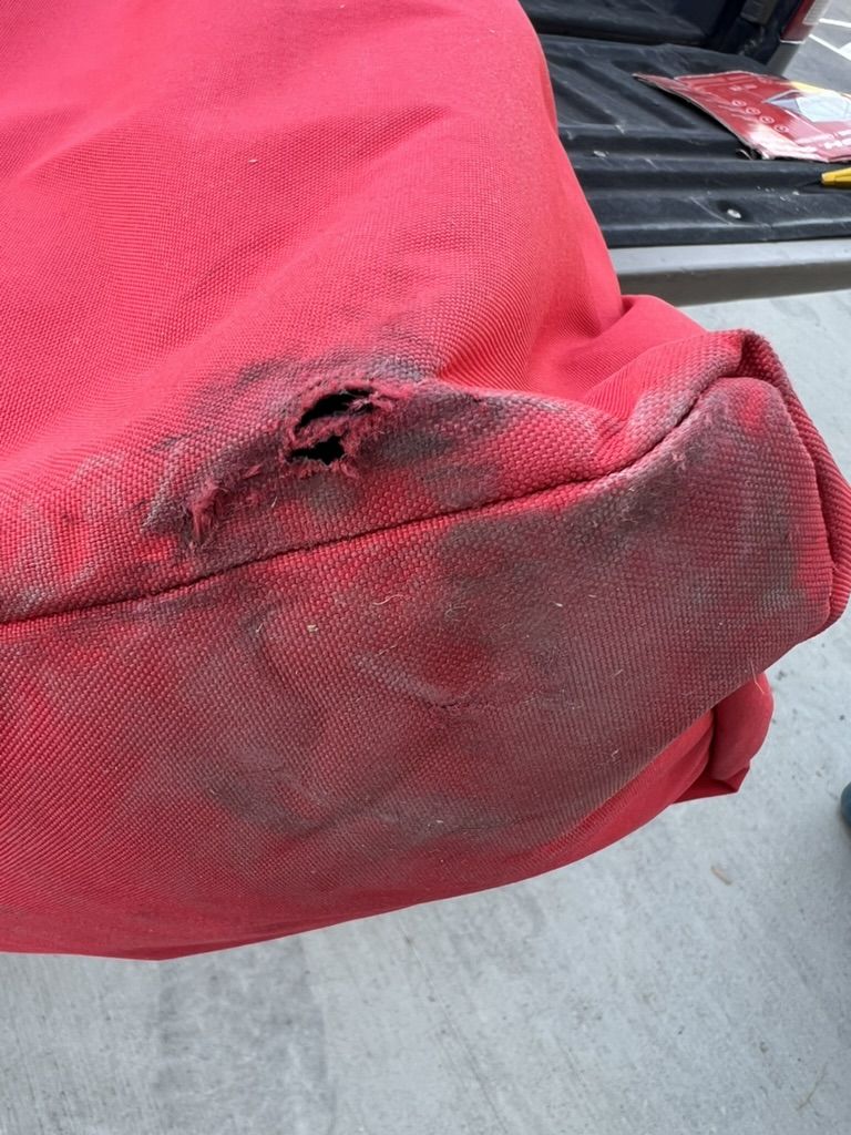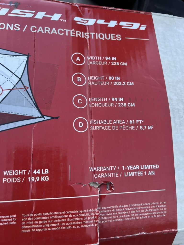 Box shows wear with taped repairs. Carry bag bottom has visible scuffs and a small tear. Measurements: Width = 94", Height = 80".