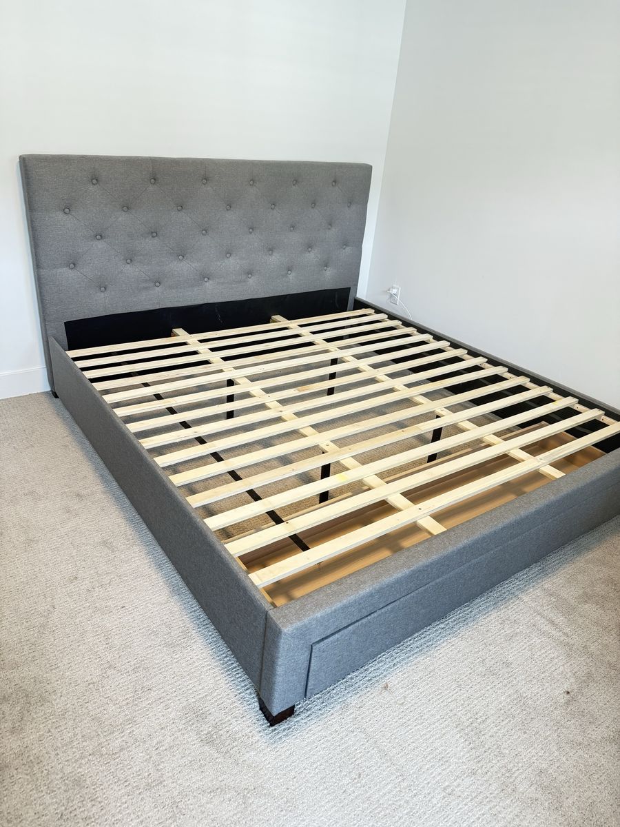 VenmoGray upholstered king bed frame with a tufted headboard. Clean look and built-in side drawers. Easy to assemble. OBO