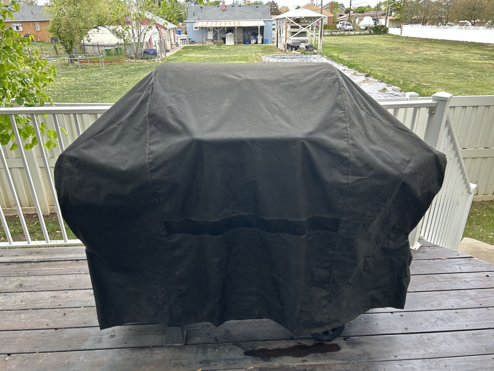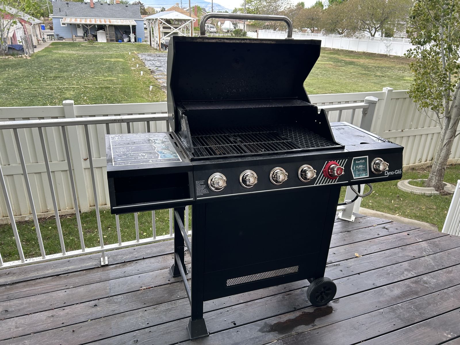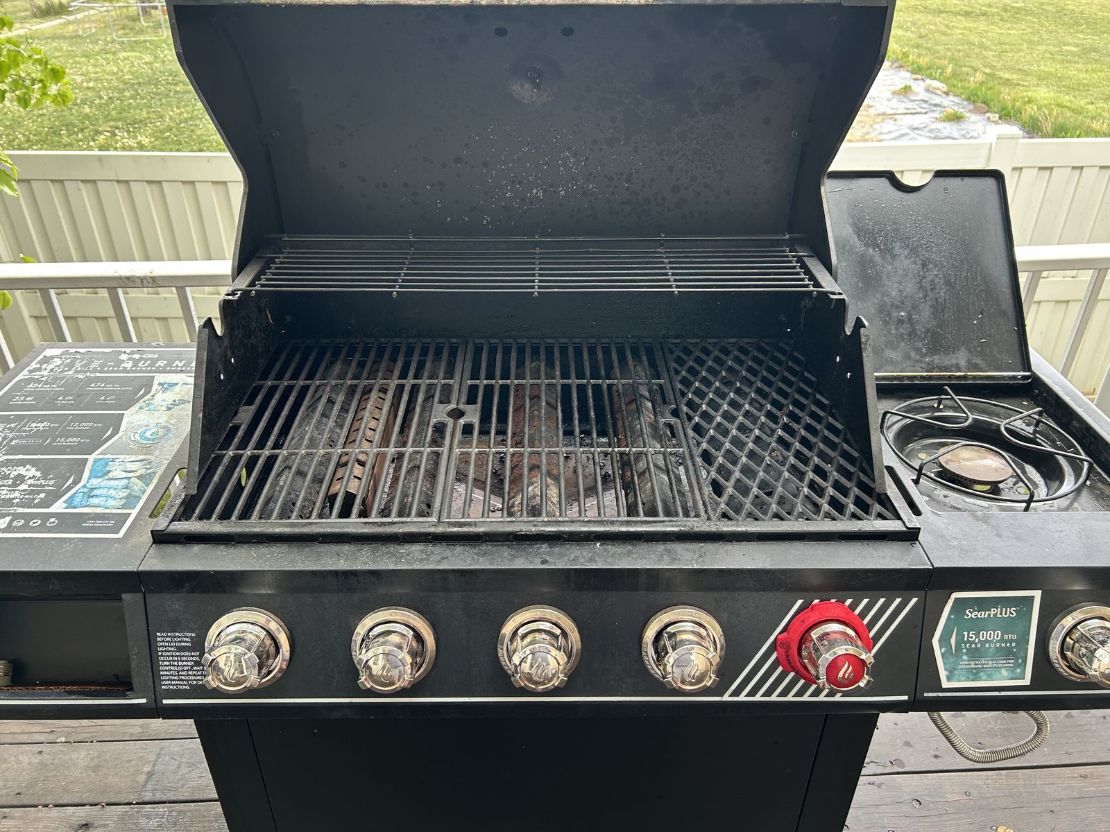 Venmo4 burner gas grill with a 15,000 BTU sear burner and side burner. Used less that 2 years. Comes with a cover.