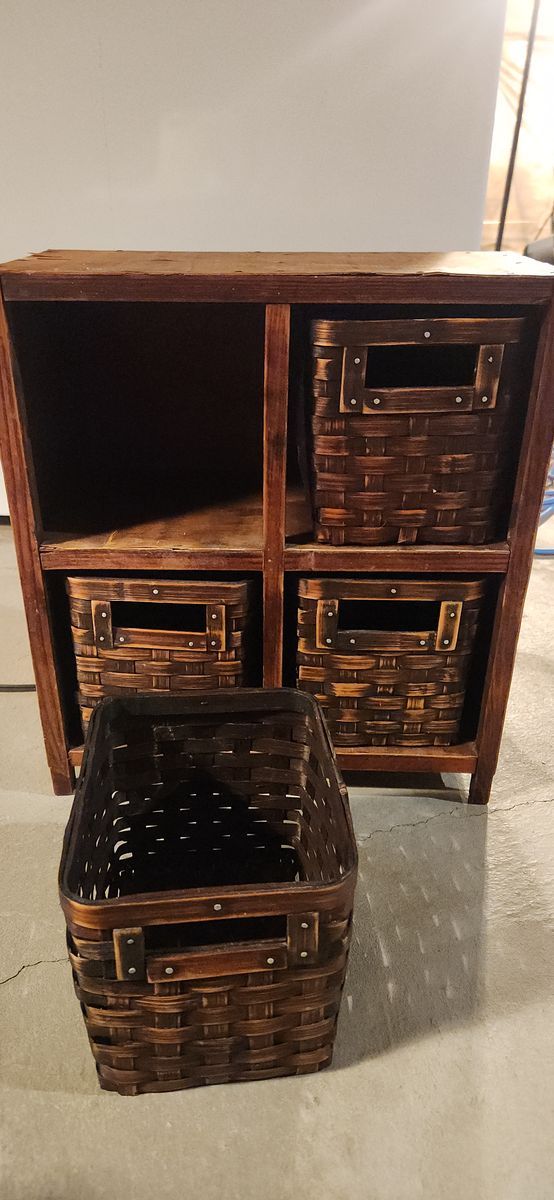 VenmoSmall wooden divider. 4 wicked baskets can be removeduse without. Shelves is 20" size, 7" deep. All in great condition. Great for anything to storage in the kitchen, bathroom, bedroom.... FCFS X-POSTING Smoke-free home