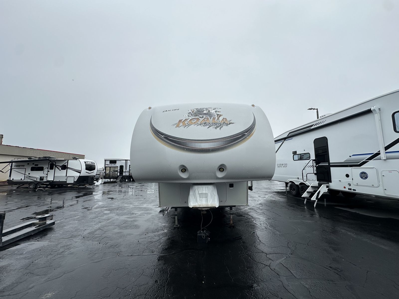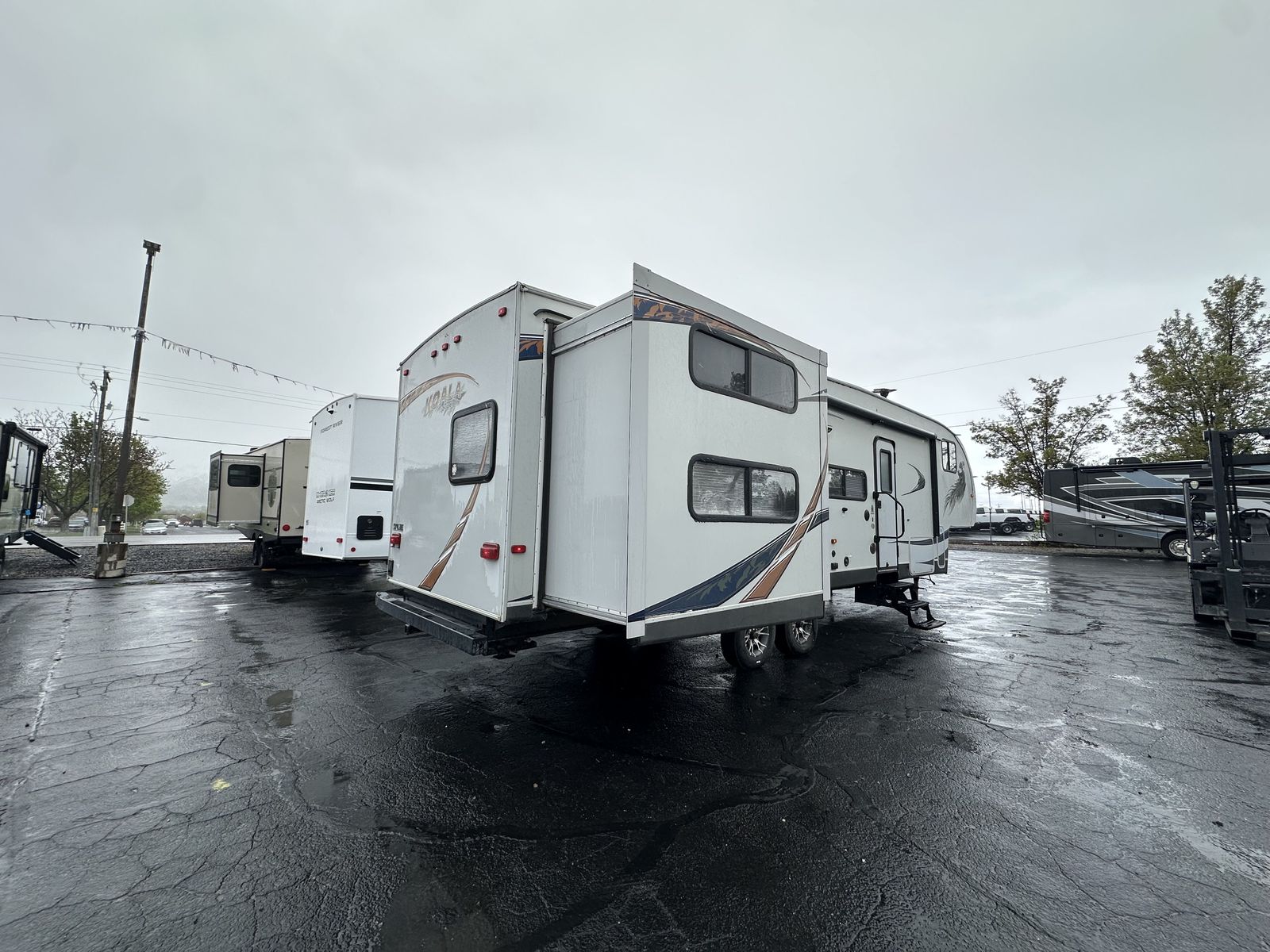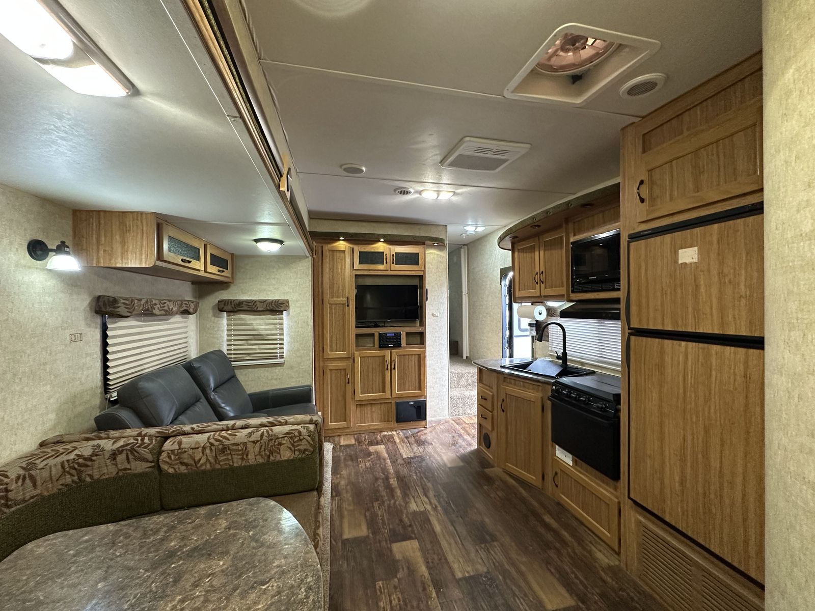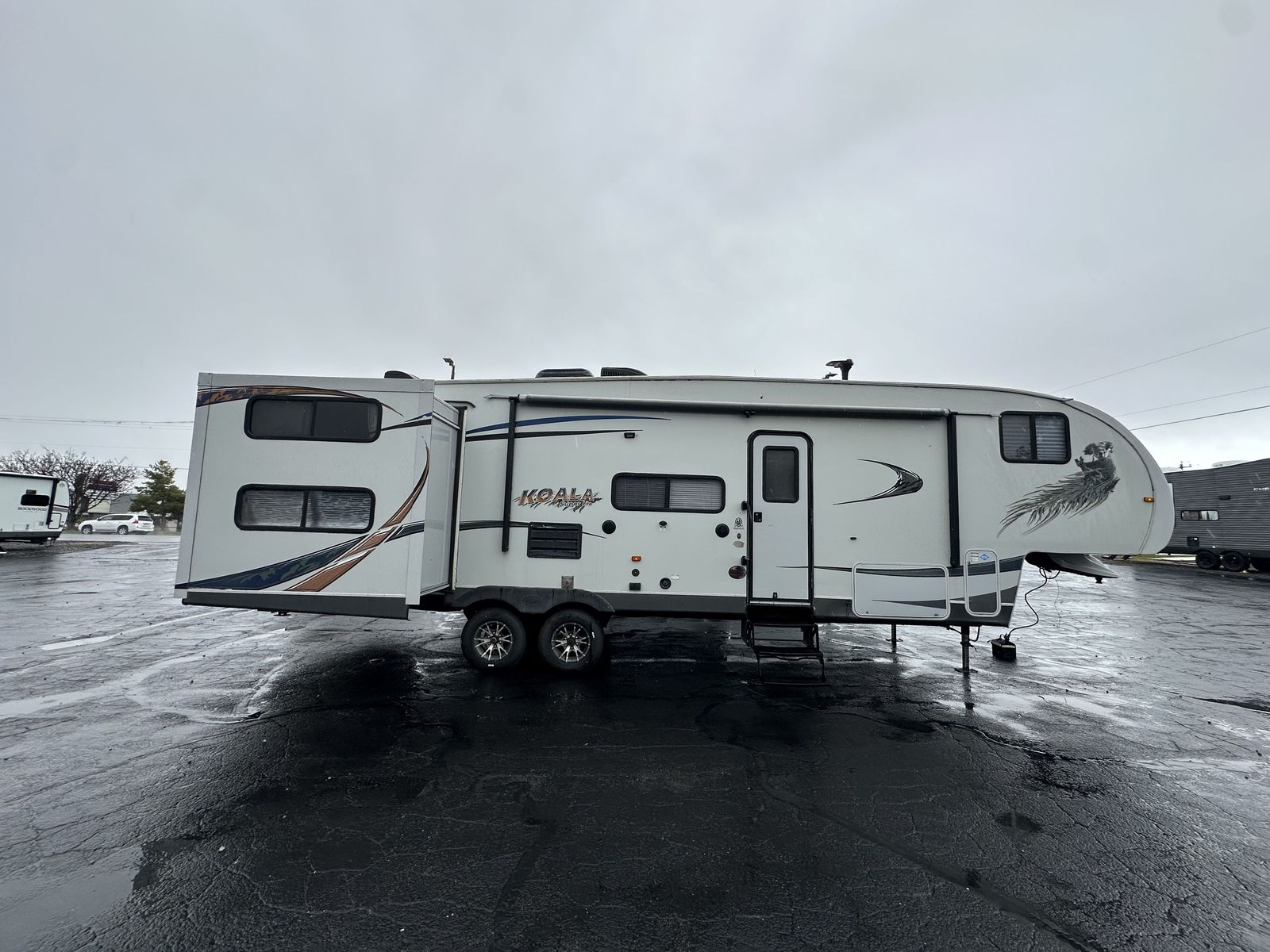 The 2013 Koala 34BH is a bunkhouse fifth wheel designed with a center living area and sleeping spaces on both ends. Up front is a queen bed with surrounding storage, while the main living space includes a U-shaped dinette. The kitchen is centrally located and features a three-burner cooktop, oven, microwave, and mid-size refrigerator.