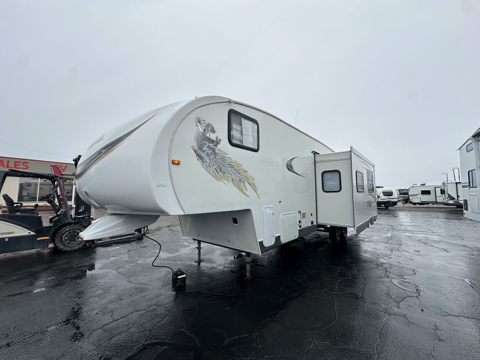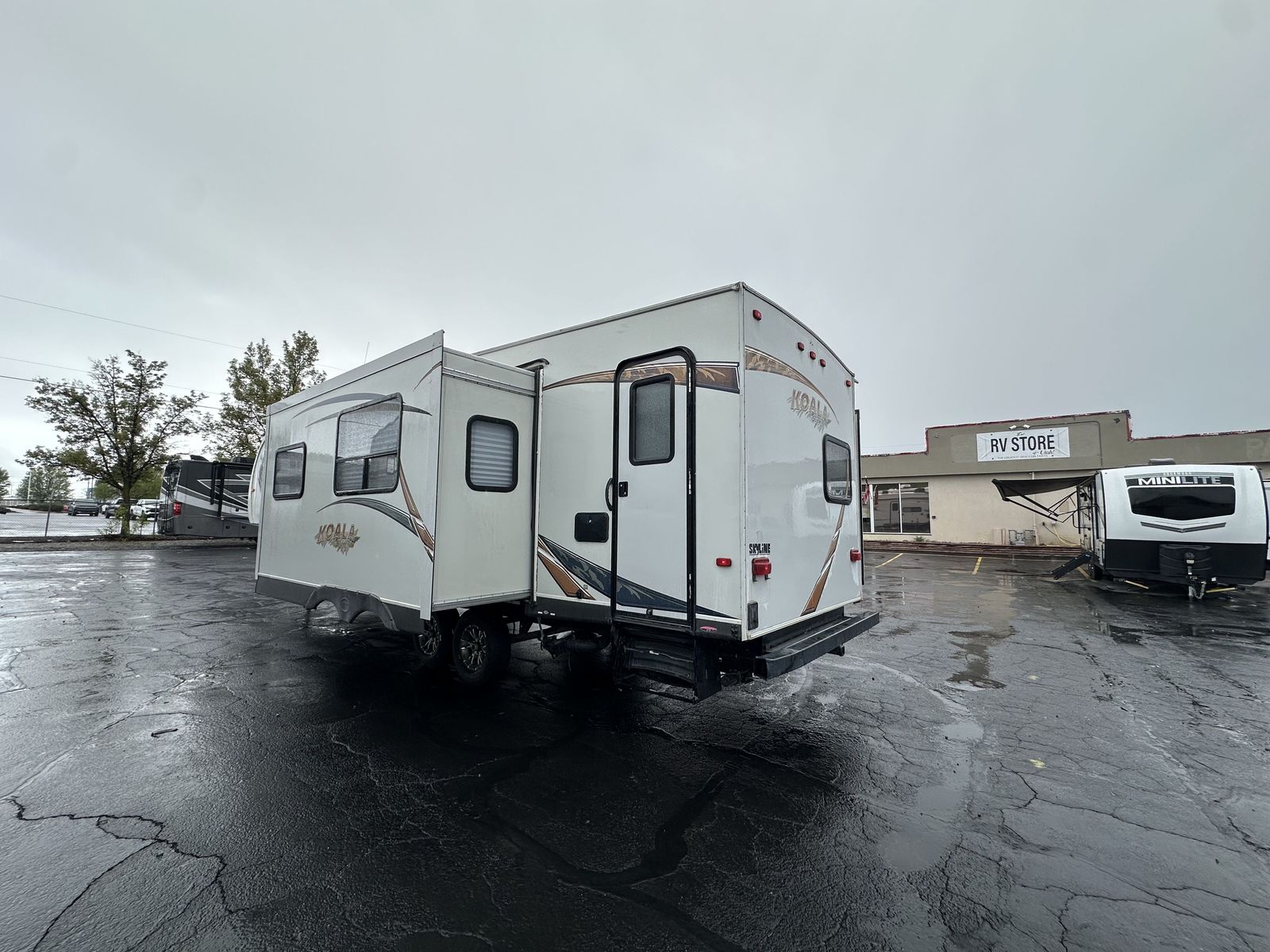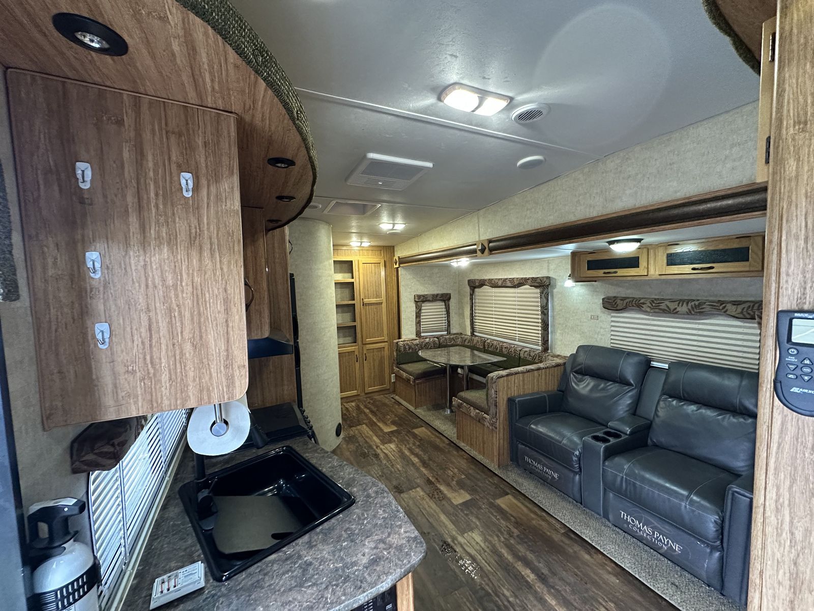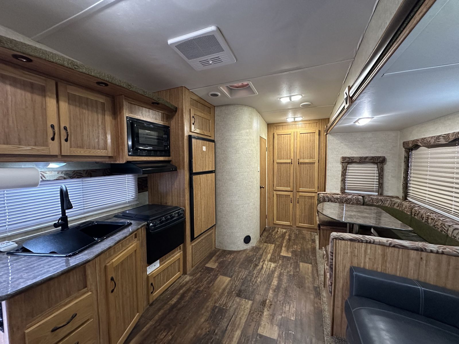 The 2013 Koala 34BH is a bunkhouse fifth wheel designed with a center living area and sleeping spaces on both ends. Up front is a queen bed with surrounding storage, while the main living space includes a U-shaped dinette. The kitchen is centrally located and features a three-burner cooktop, oven, microwave, and mid-size refrigerator.