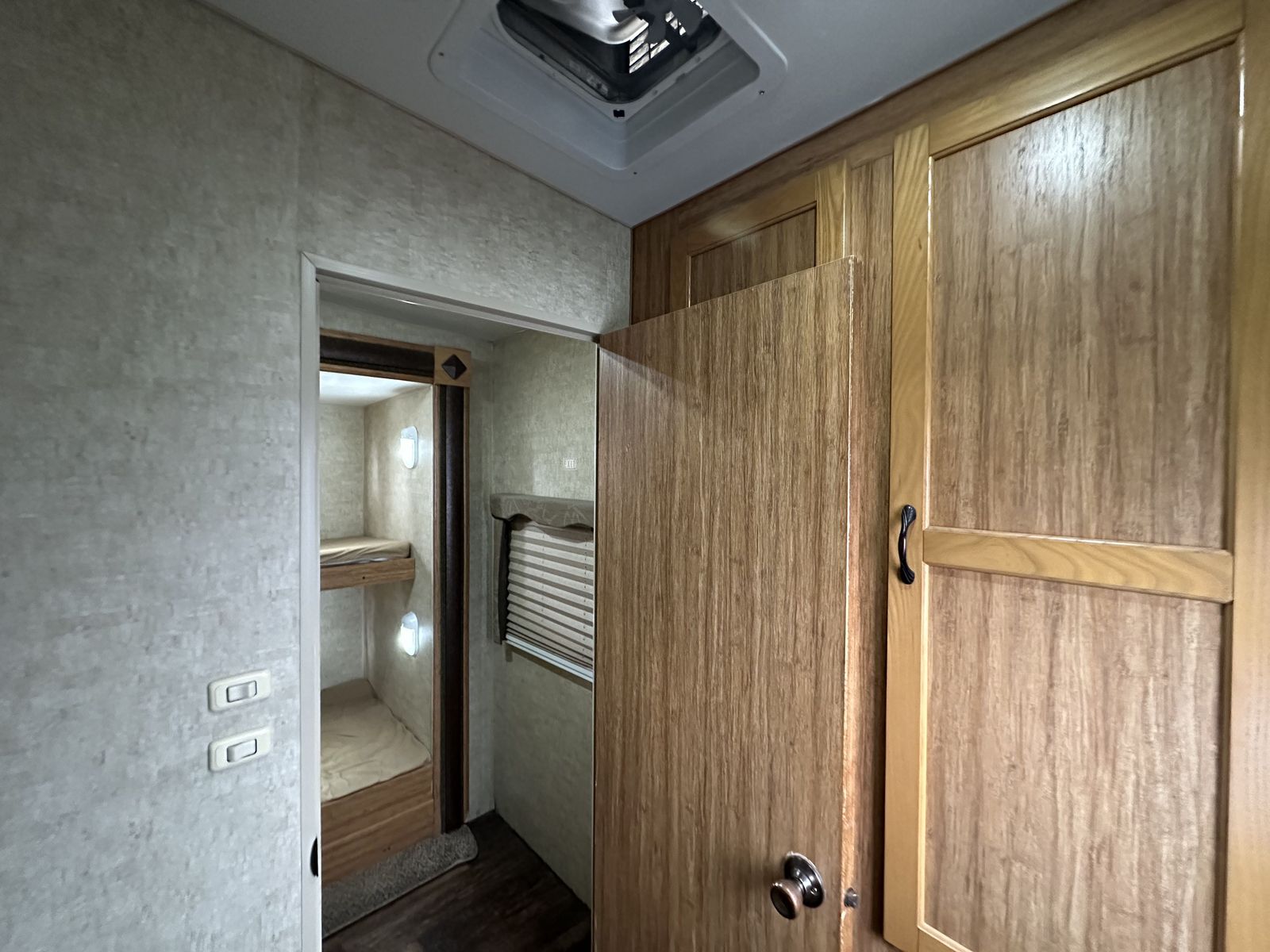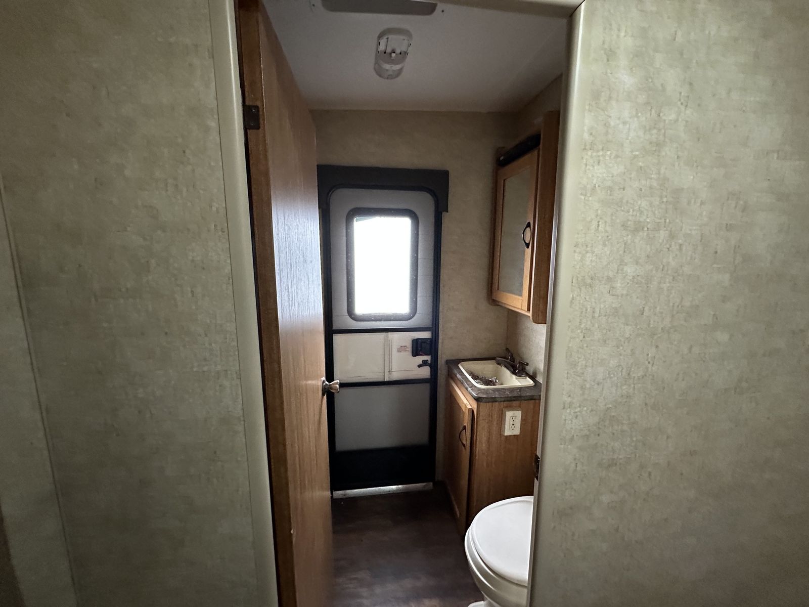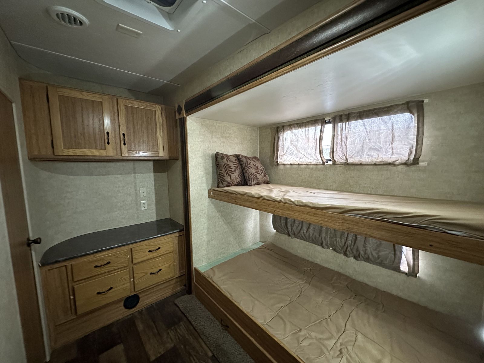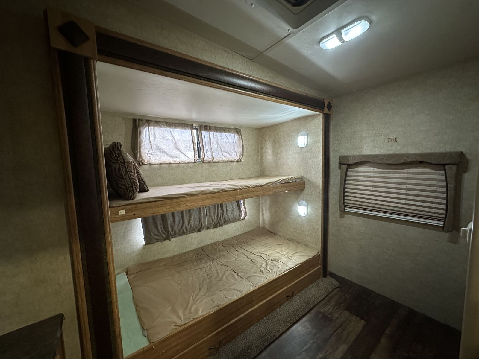 In the rear, the bunkhouse includes bunk beds with a trundle underneath, making it a flexible setup for additional sleeping space. This unit also includes two bathrooms, with the half bath connected to the rear bedroom and featuring its own exterior entry door for convenient access from outside. The second bathroom is positioned closer to the main living space.