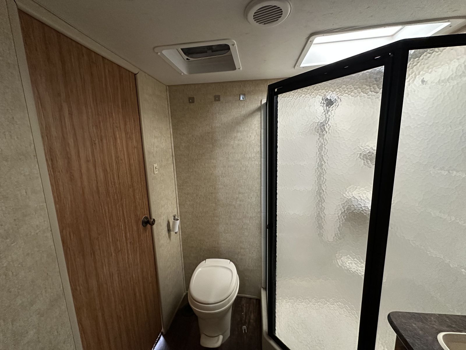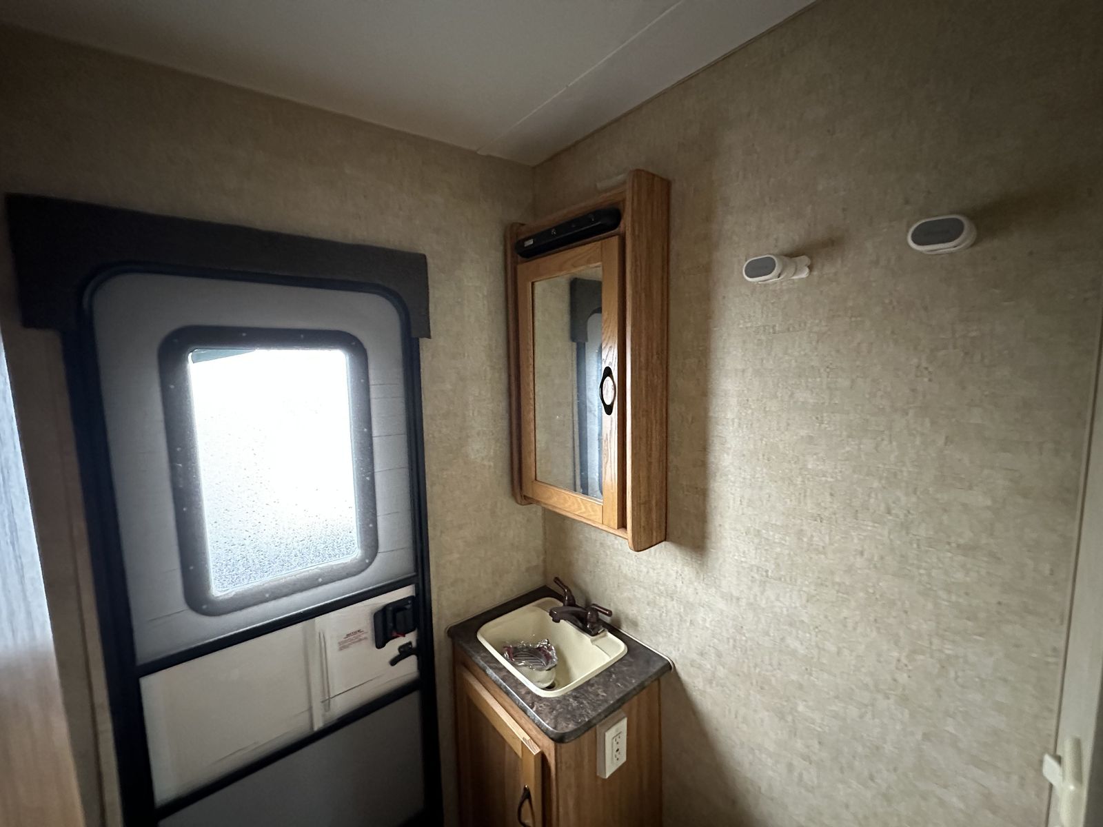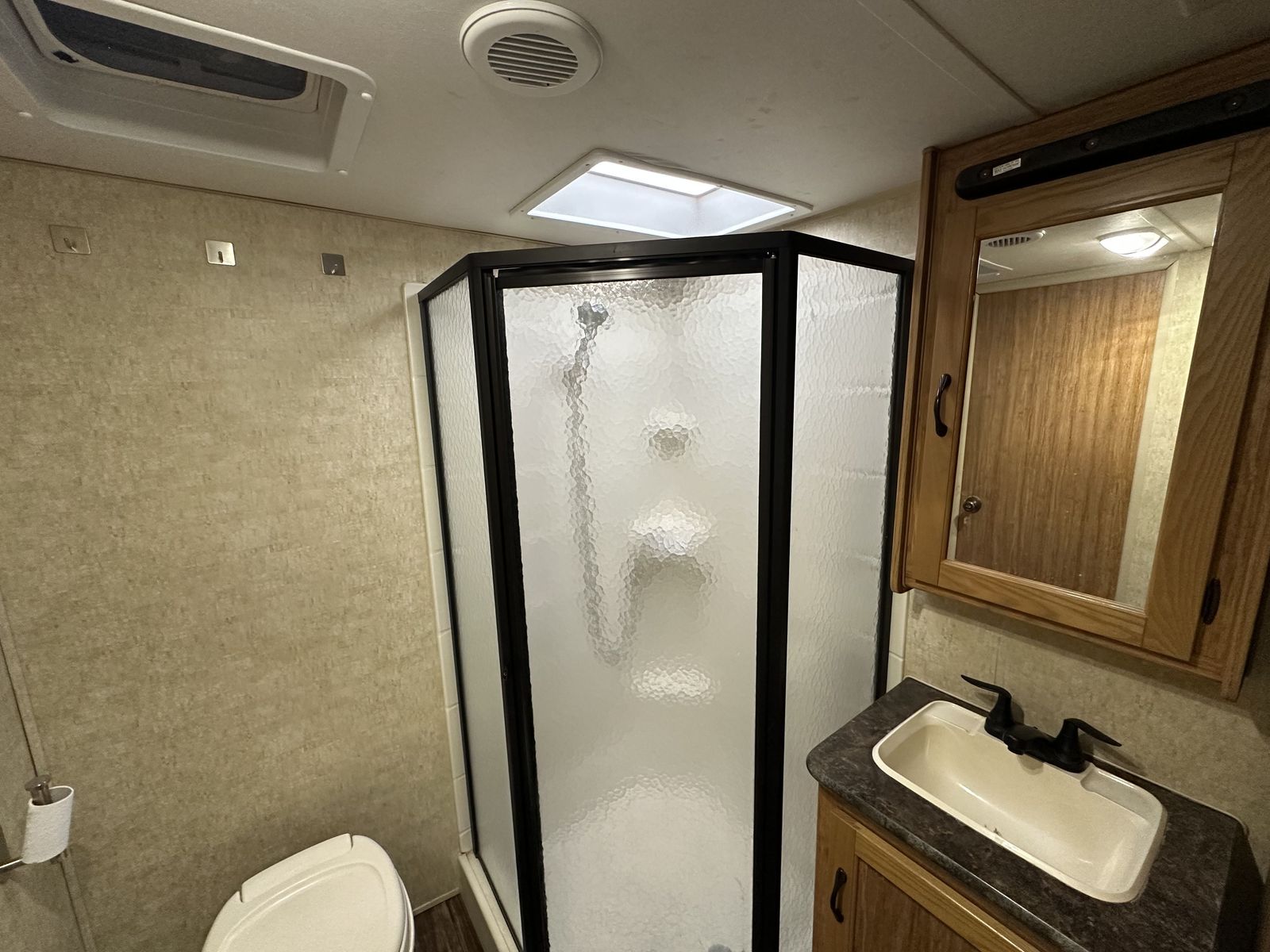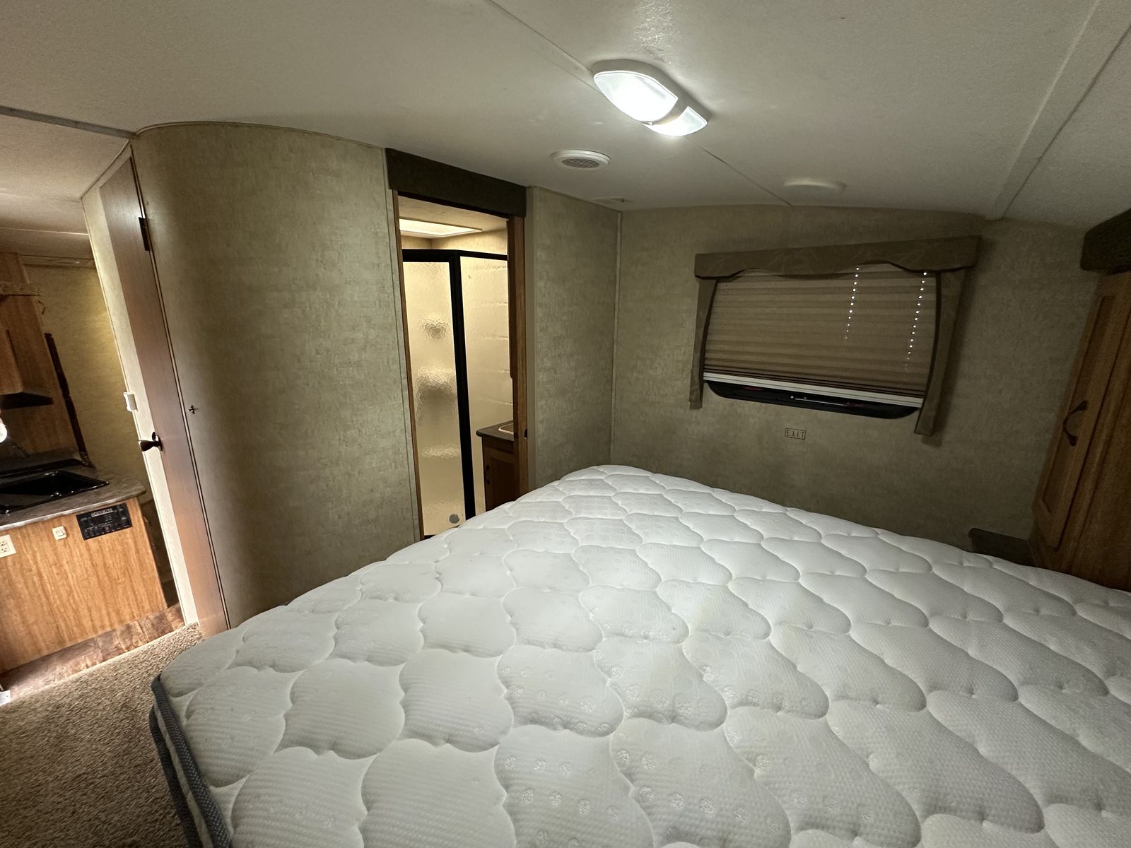 In the rear, the bunkhouse includes bunk beds with a trundle underneath, making it a flexible setup for additional sleeping space. This unit also includes two bathrooms, with the half bath connected to the rear bedroom and featuring its own exterior entry door for convenient access from outside. The second bathroom is positioned closer to the main living space.