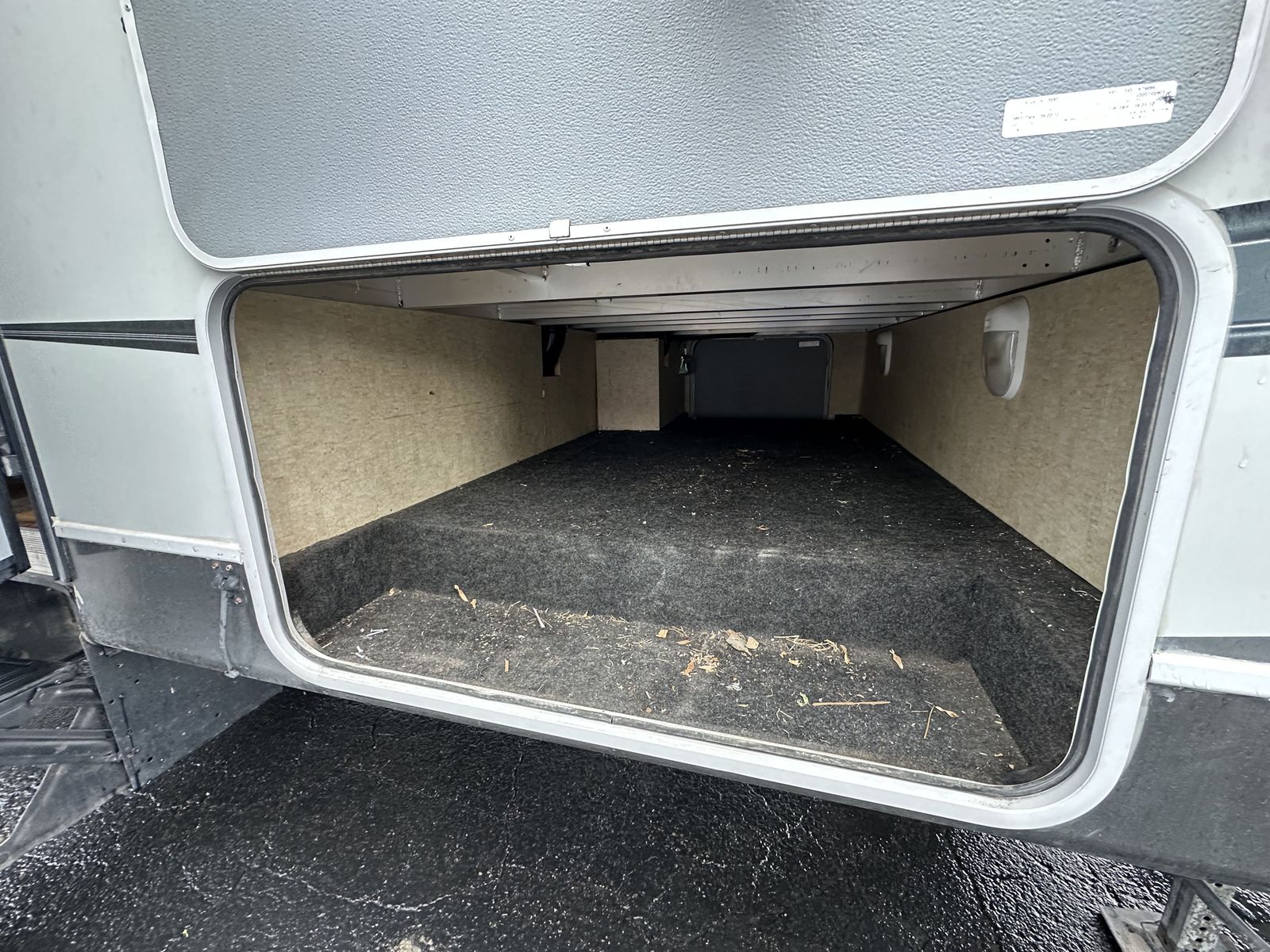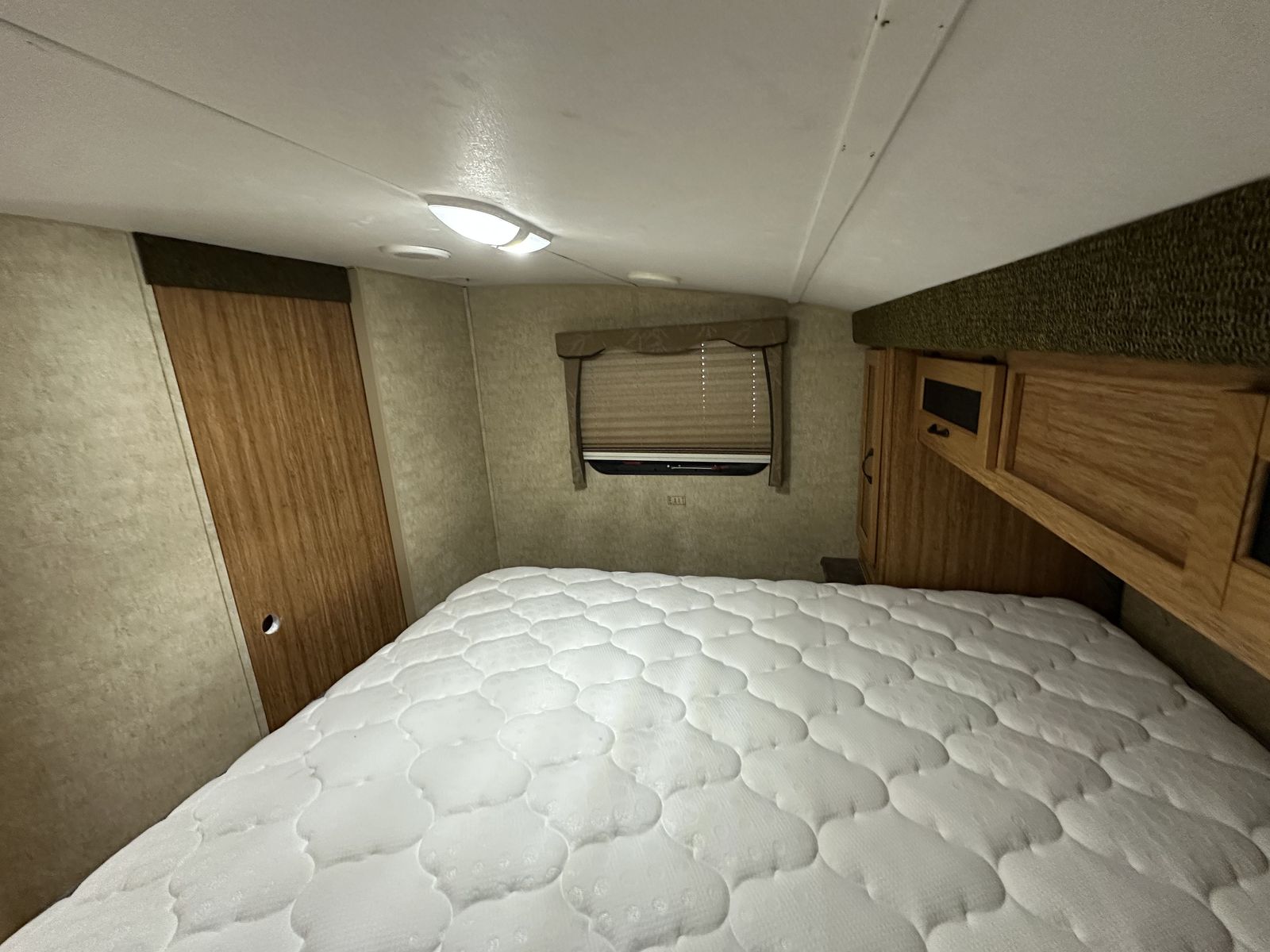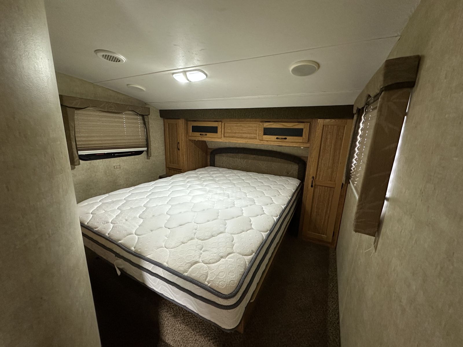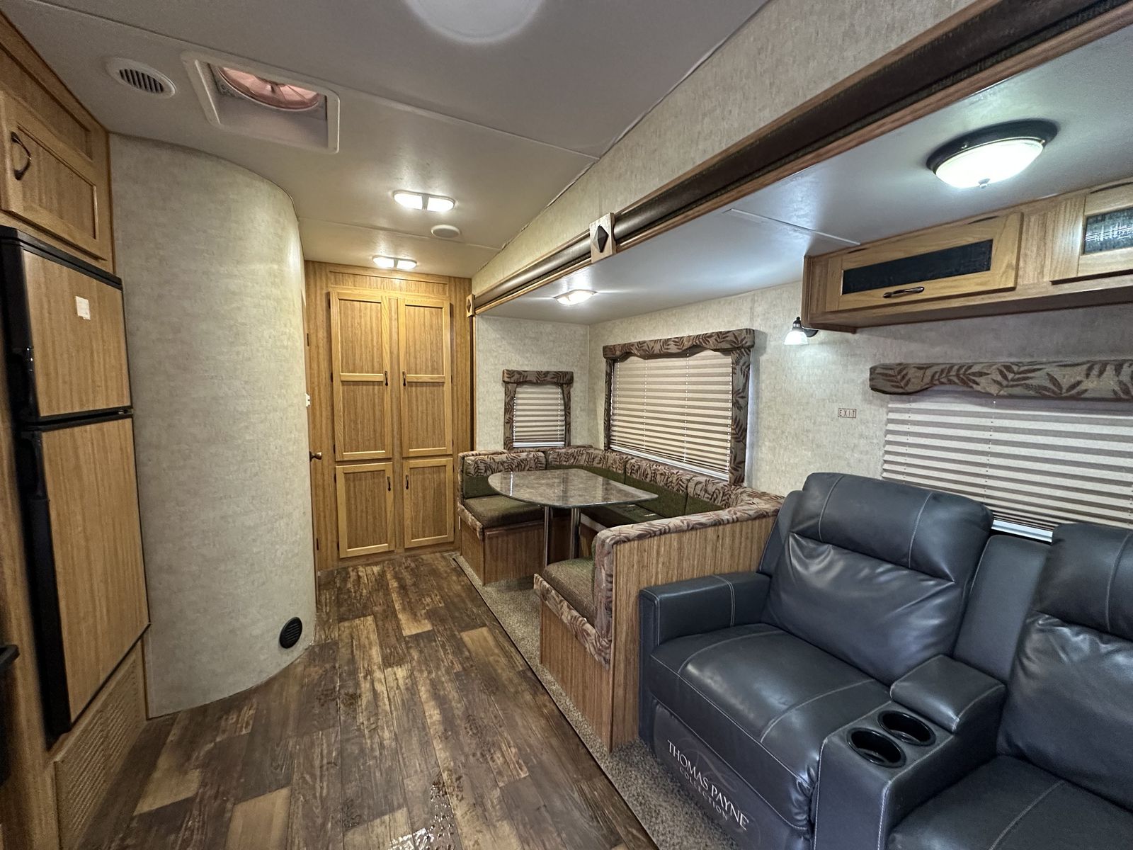 The trailer is just under 35 feet in length with two slide-outs, a dry weight around 7,200 lbs, and a sleeping capacity of up to nine. Overall, the layout focuses on maximizing sleeping space while keeping the kitchen and living area functional and easy to use.