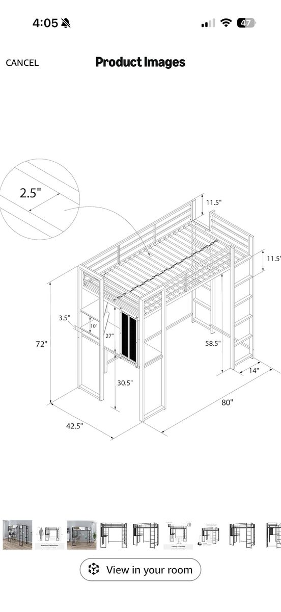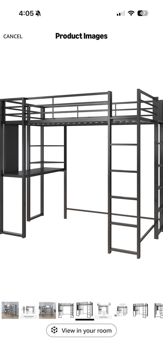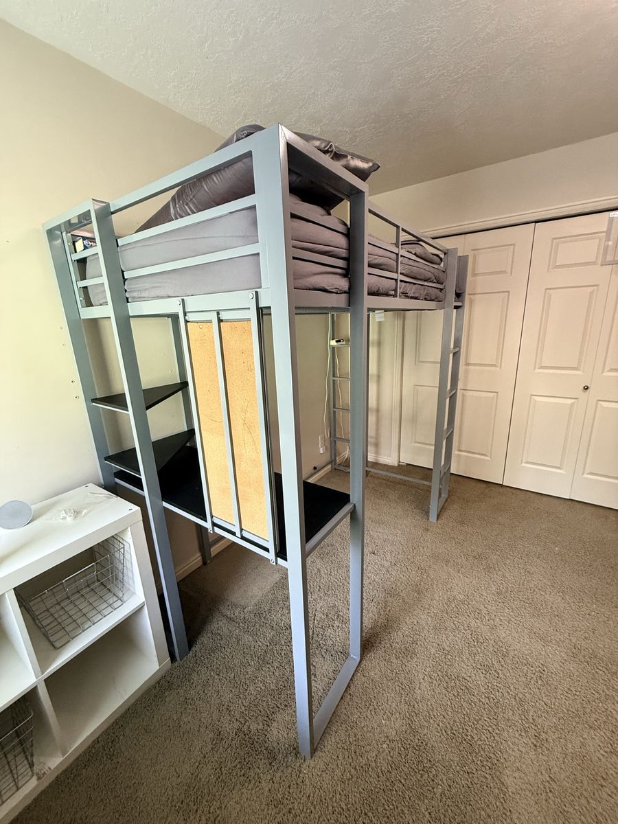 VenmoGray, twin sized, metal loft bed with two ladders, built in desk and shelf. Mattress not included. Bed has been disassembled into four pieces for easy transport, so will need to be bolted back together. Two of the allen head bolts were broken off during disassembly, so you can either look for matching ones at a hardware store or leave as is- it’s still perfectly structurally sound. We also have a second, matching loft bed available, if you’re interested in two. Attached stock photo shows all dimensions. Asking $125, cash or Venmo only, FCFS, pick-up only in Bountiful.