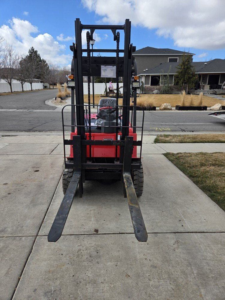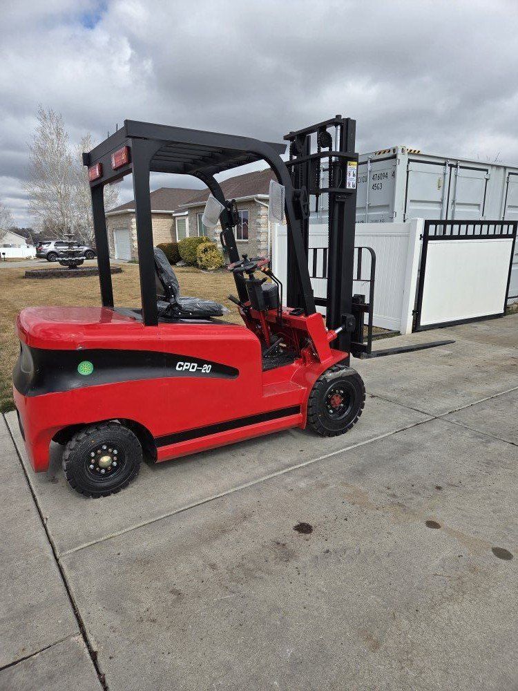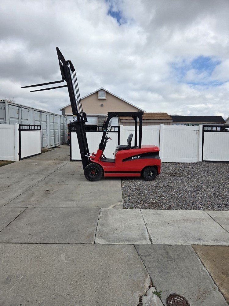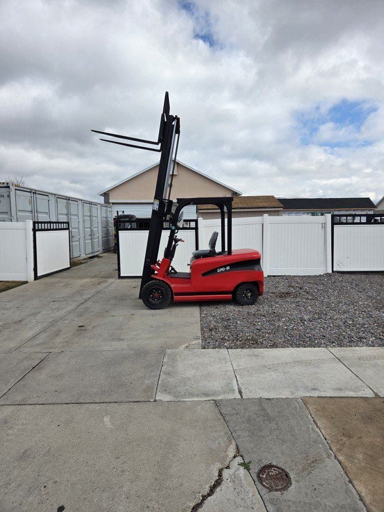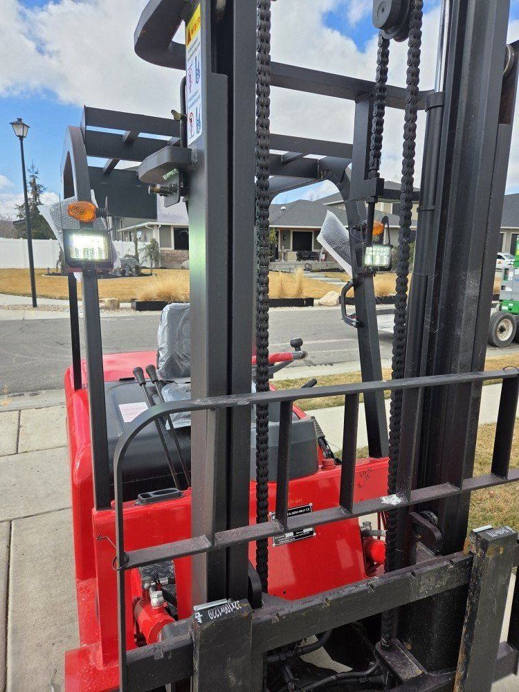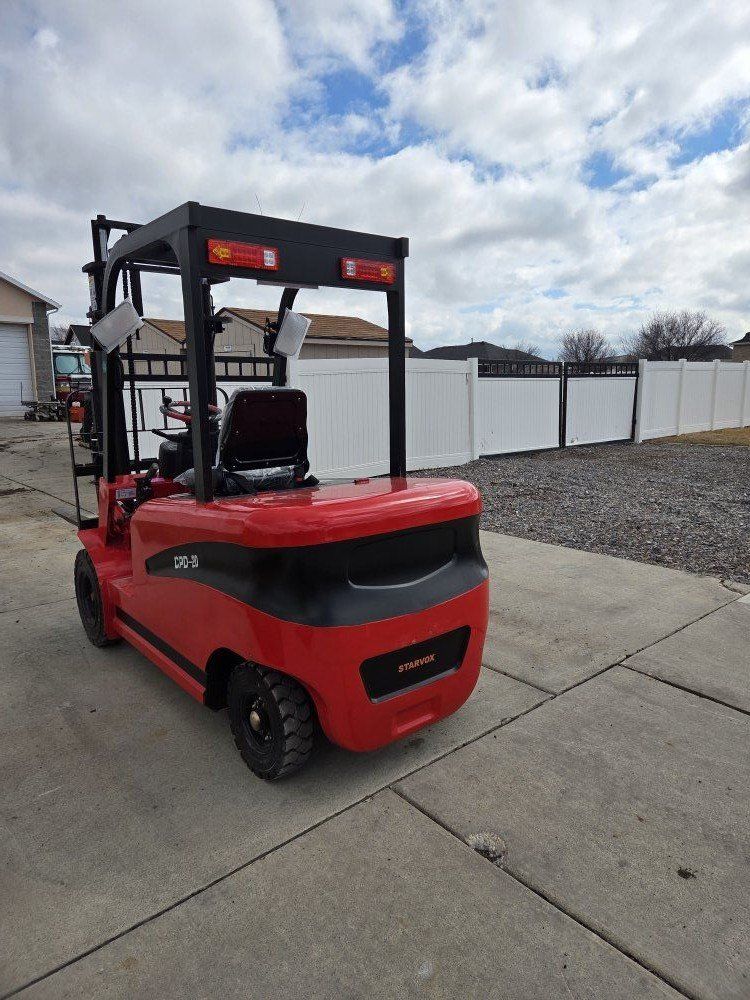 New Starvox Electric Forklift. 4400lbs, 118" lifting height, 48" forks, work lights, blinkers, reverse lights, mirrors, horn, 2500lbs machine weight, battery charger.
