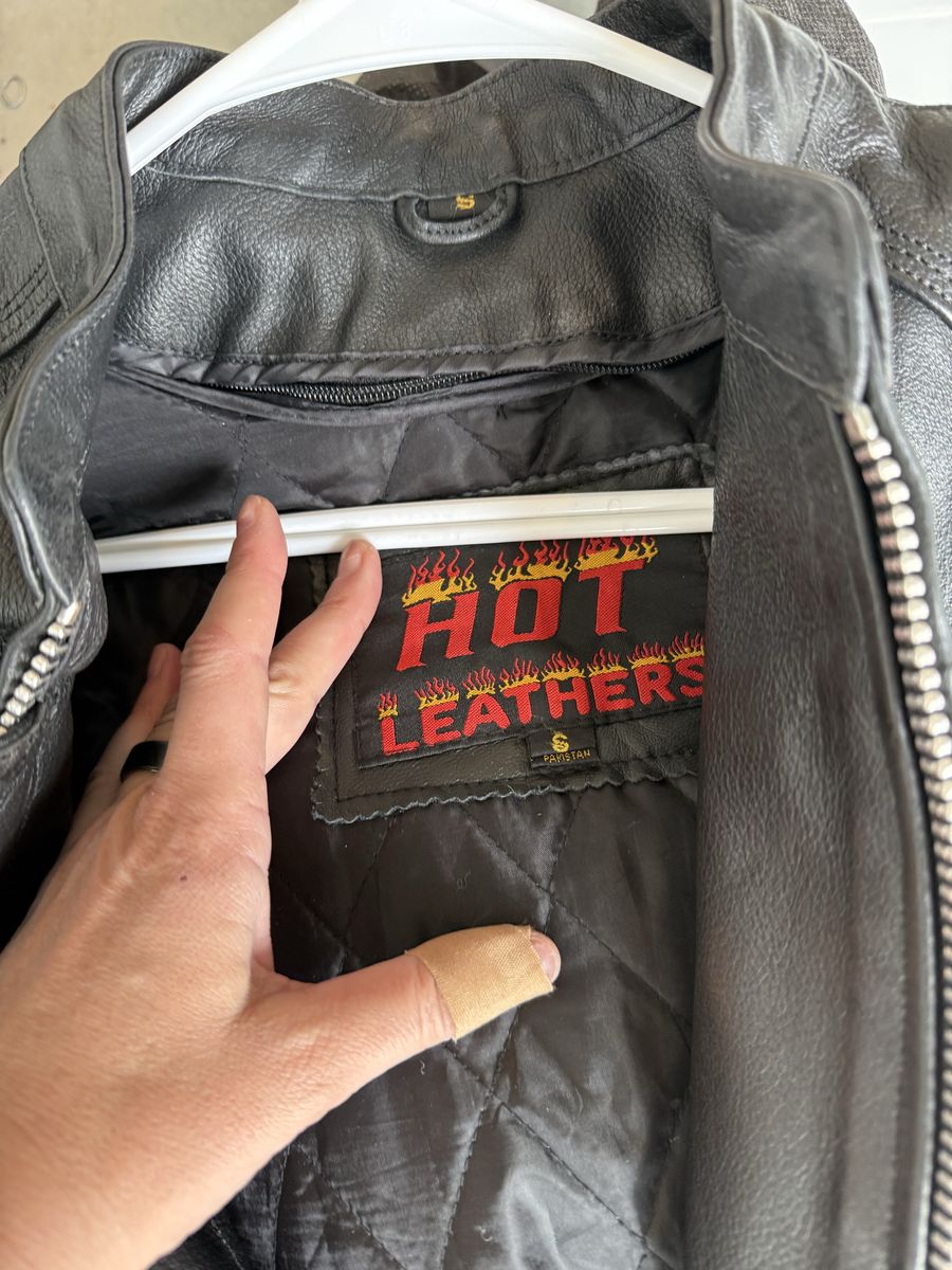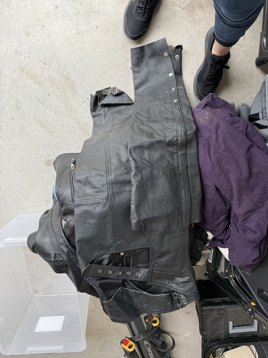 Hot Leather Jacket size small. Rocky Mountain Hides chaps size small. Warm, heavy leather, nicely broken in. (My Venmo isn’t working so cash only, sorry)