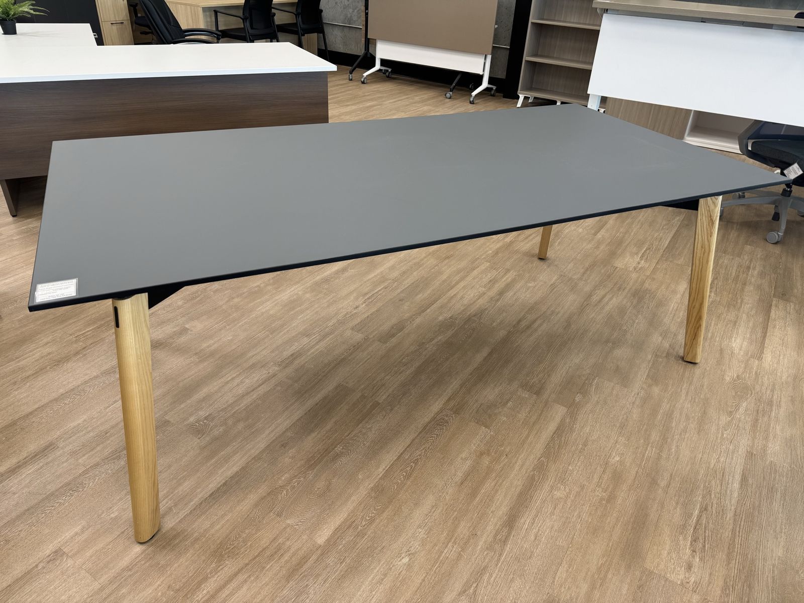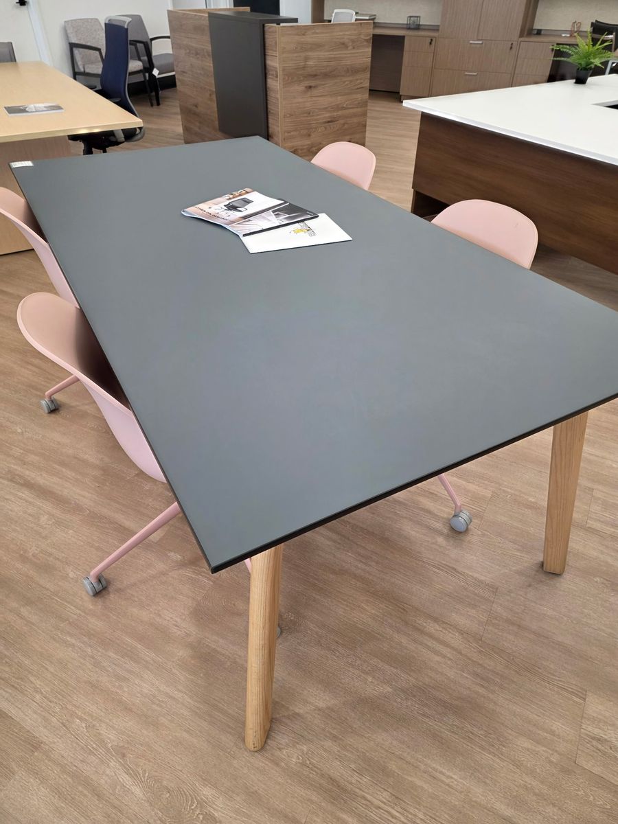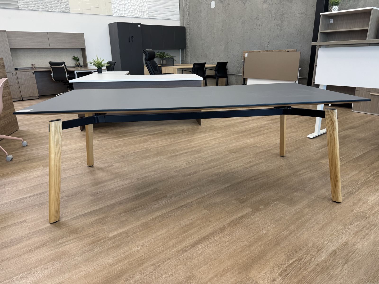 Ligouri table with a premium Fenix surface and a reverse knife edge profile by Enwork. Like new, showroom model. 1 table available.