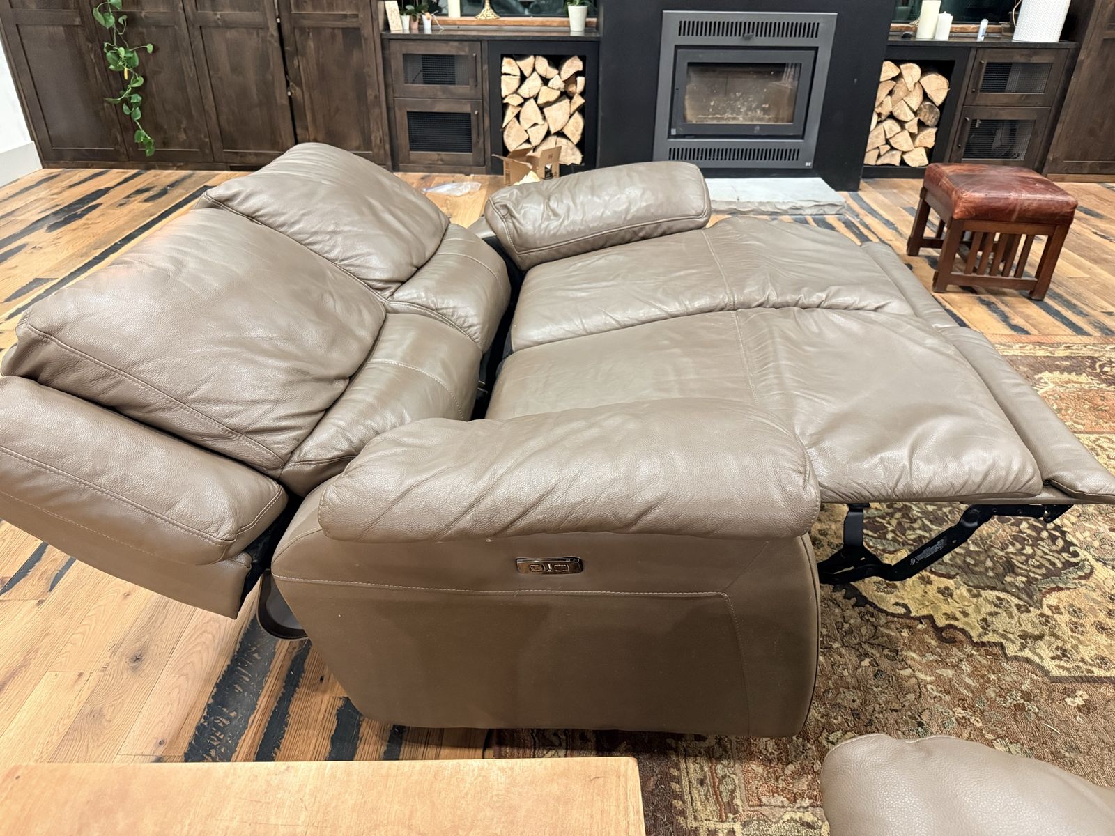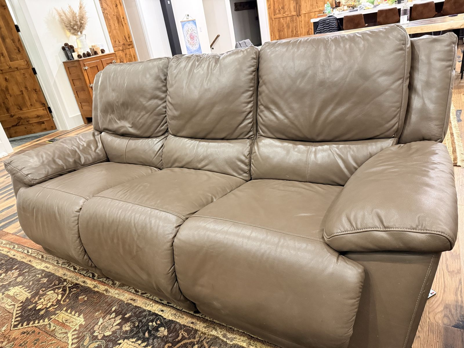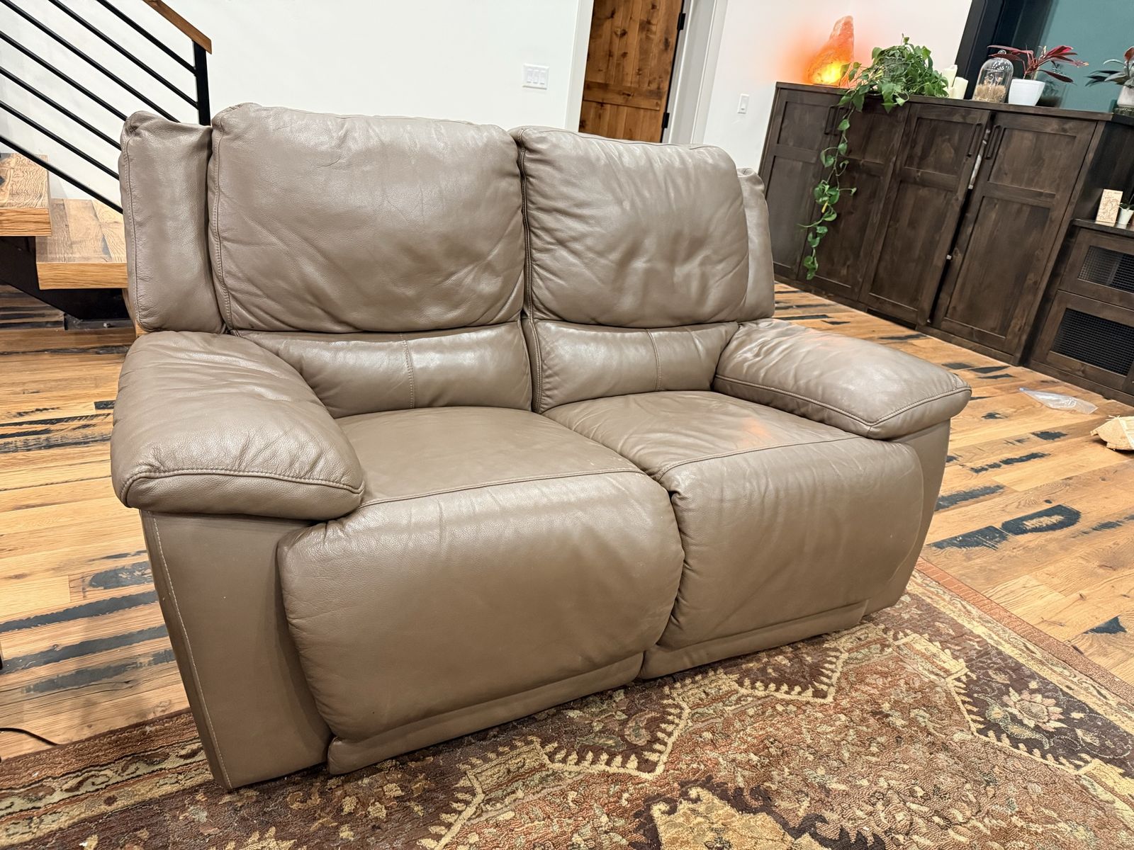 VenmoThis classic sofa set is made of real leather and is a great choice for homes looking for durability in their furniture. Using discreet buttons on the side of the couch, both seats of the love seat recline and so do the two end seats of the sofa. Head rests also adjust via buttons along the side. Sofa uses a standard 120V plug for power. Minor signs of wear on sofa seat Sofa 94” x 38” Loveseat 60” x 38”