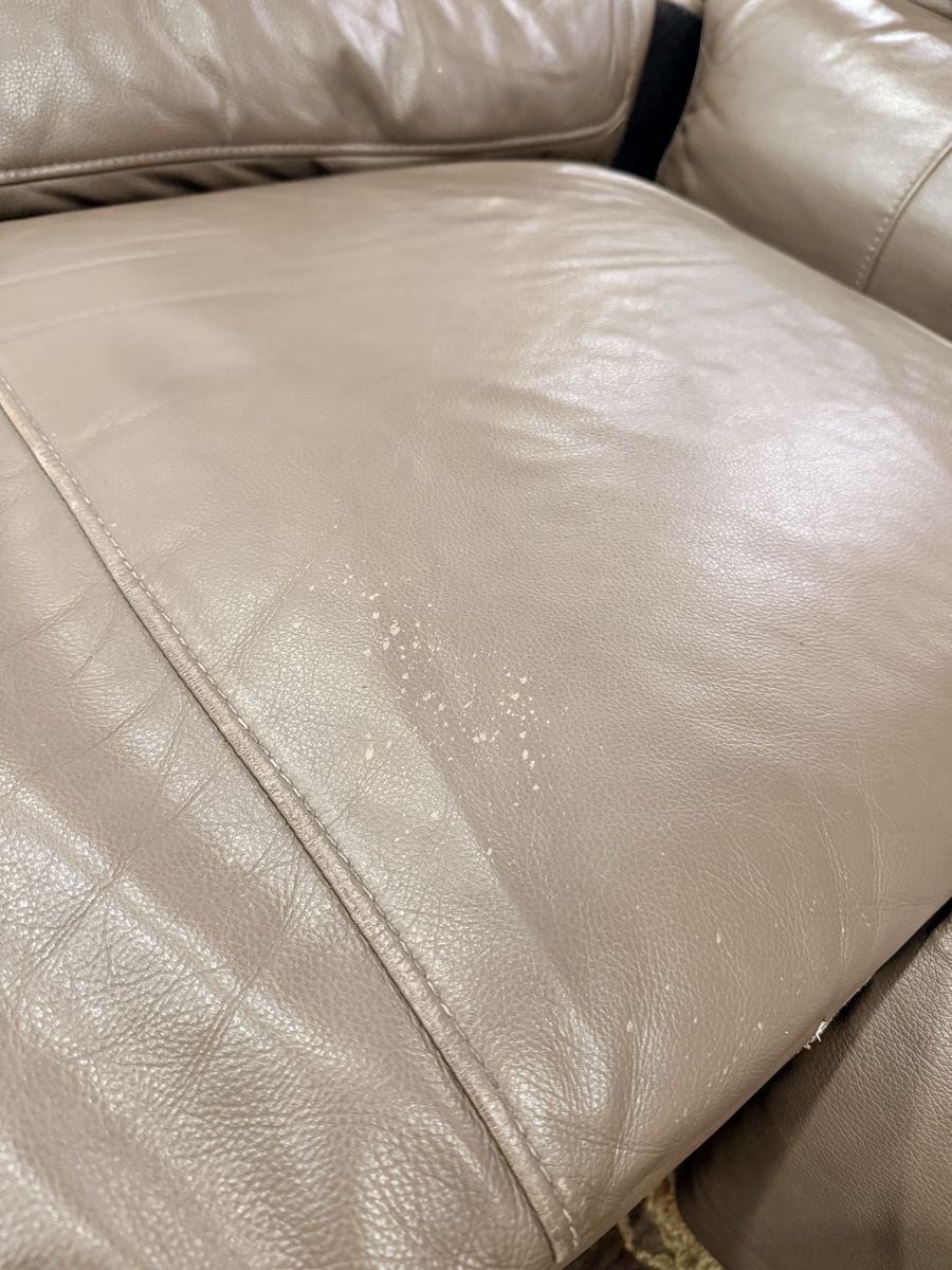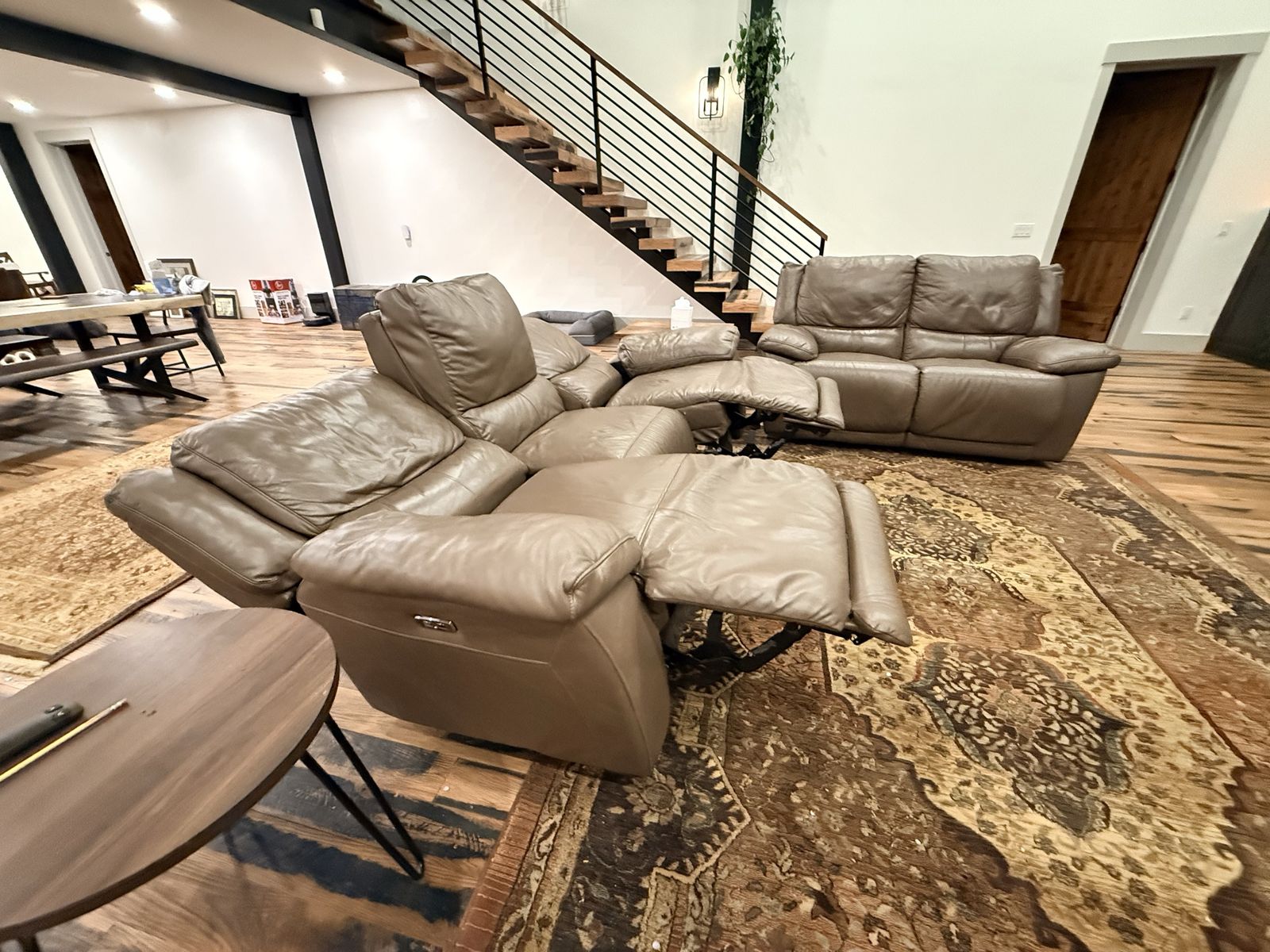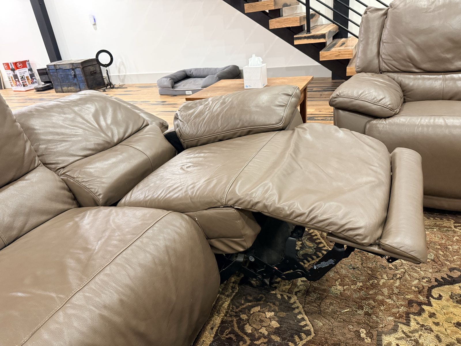 VenmoThis classic sofa set is made of real leather and is a great choice for homes looking for durability in their furniture. Using discreet buttons on the side of the couch, both seats of the love seat recline and so do the two end seats of the sofa. Head rests also adjust via buttons along the side. Sofa uses a standard 120V plug for power. Minor signs of wear on sofa seat Sofa 94” x 38” Loveseat 60” x 38”