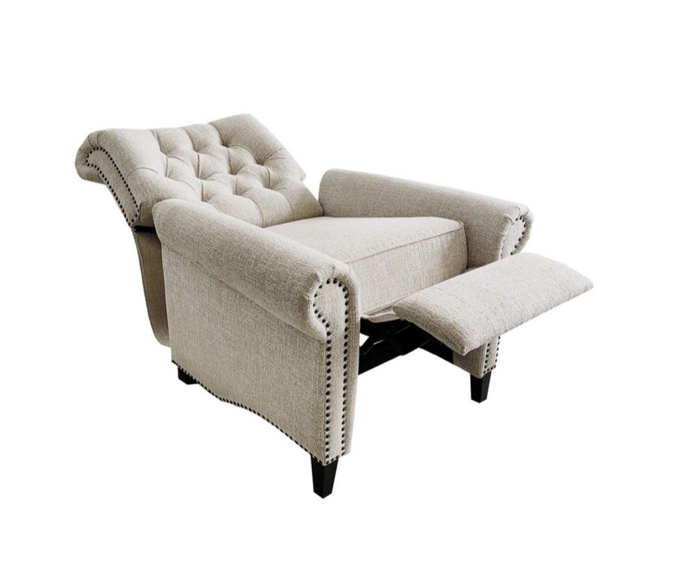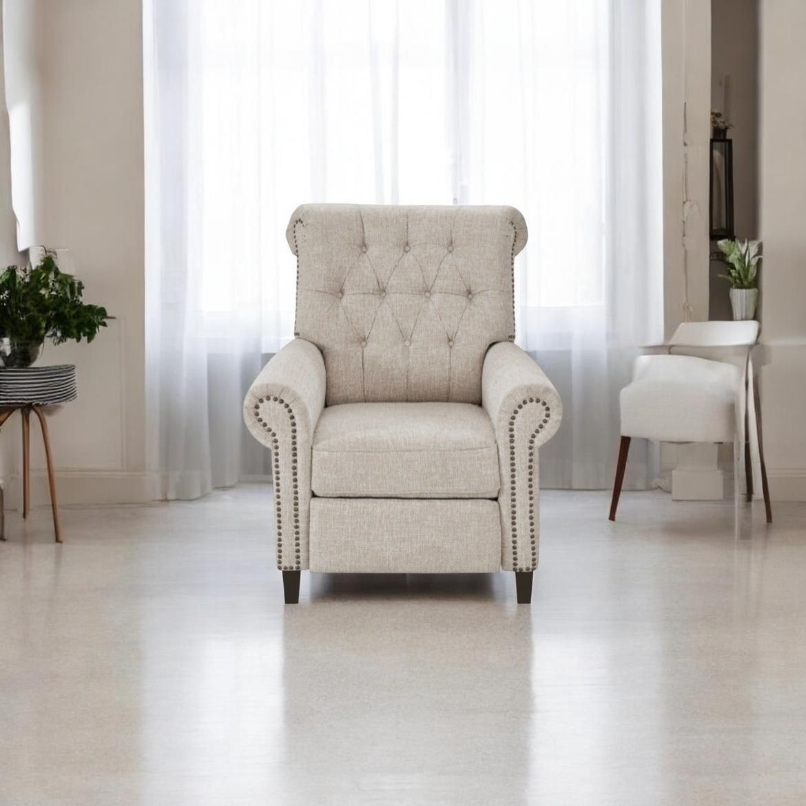 Features: • Push-back reclining (no bulky handles) • Elegant tufted back design • Nailhead trim detailing • Soft neutral fabric (matches any room) • Solid wood legs • Compact but super comfortable