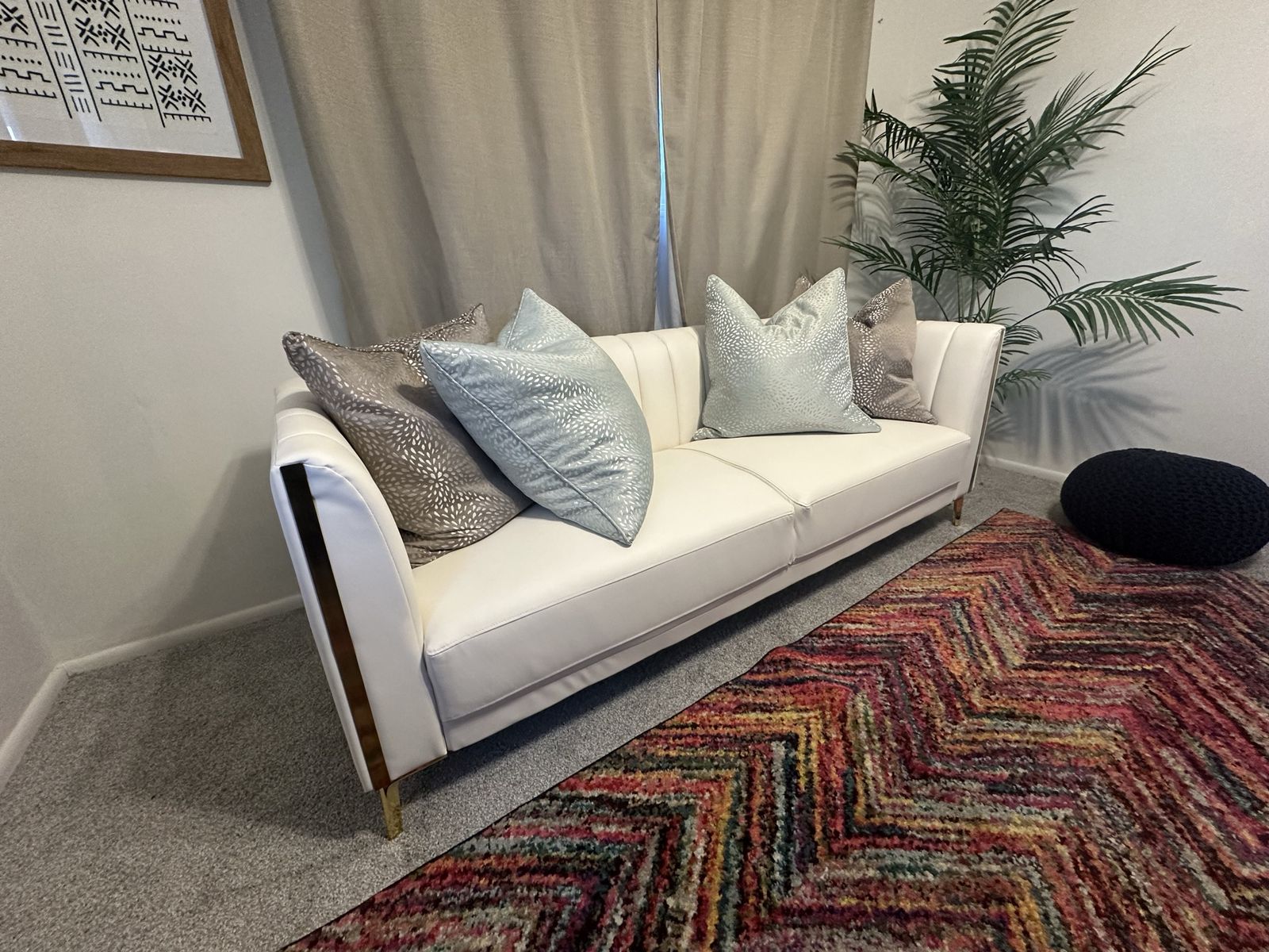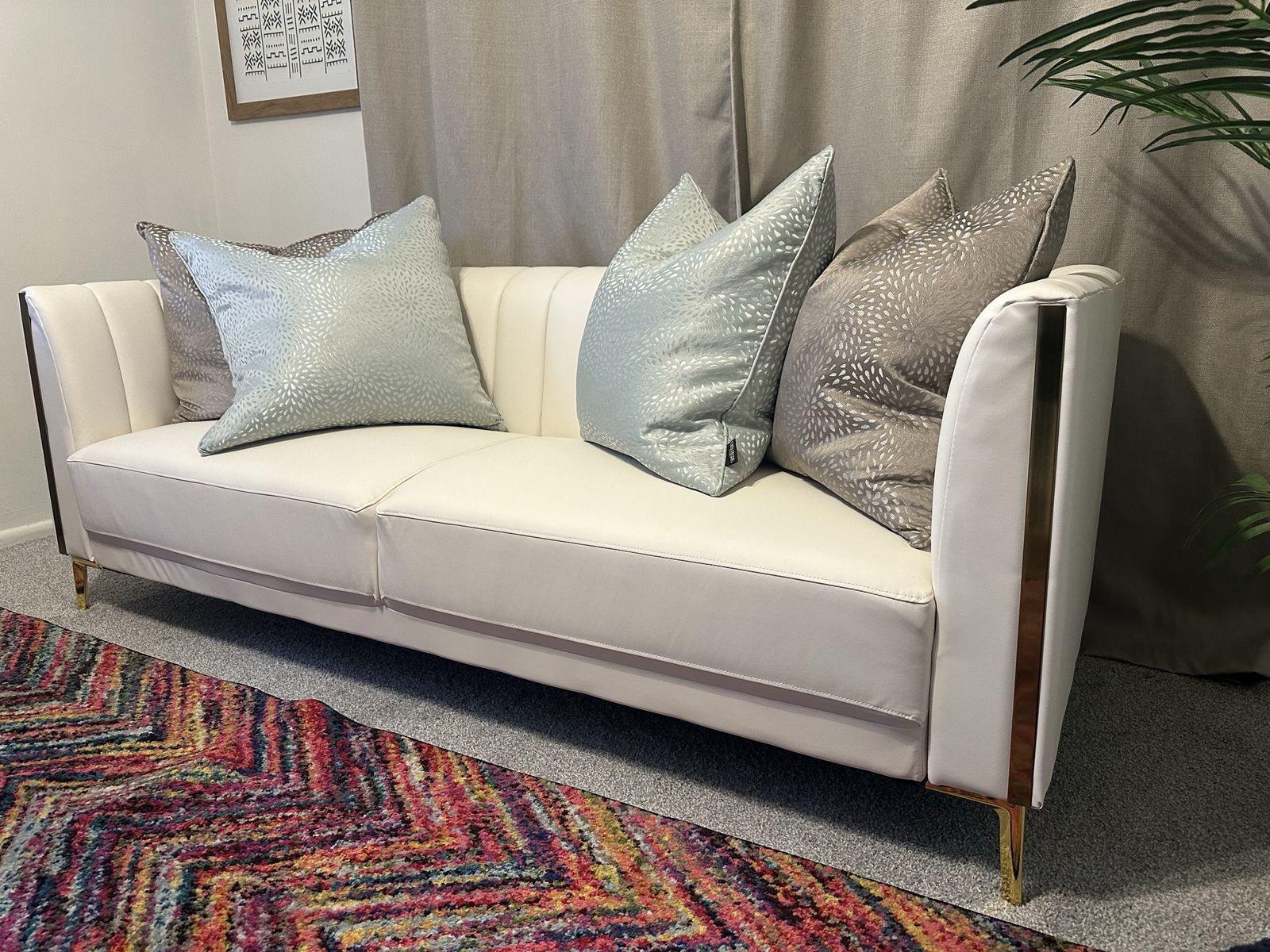 VenmoBeautiful like-new couch in perfect condition. Only used to stage a home! Cream, vinyl material that is easy to clean with gold accents. Moving and need gone!