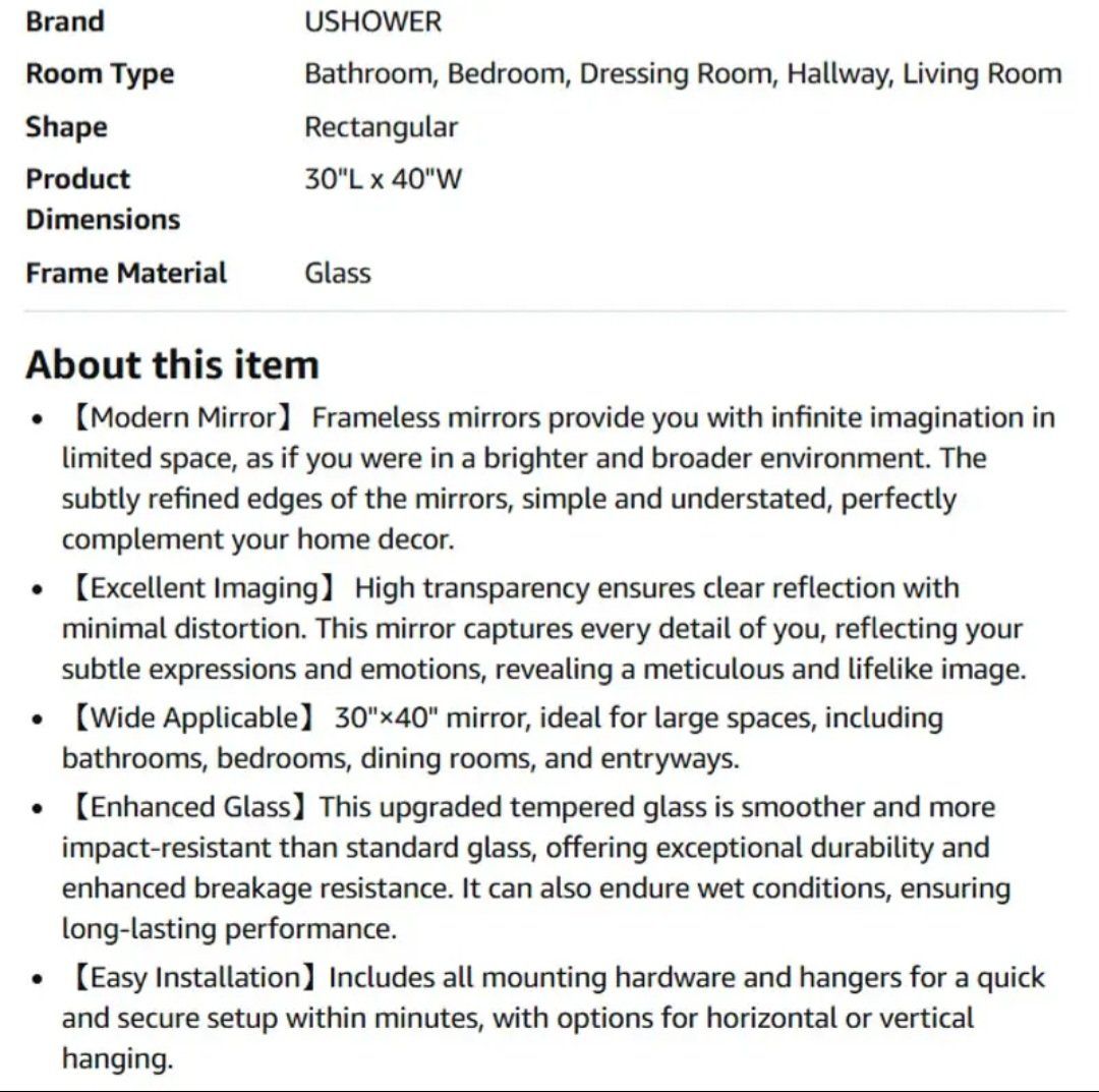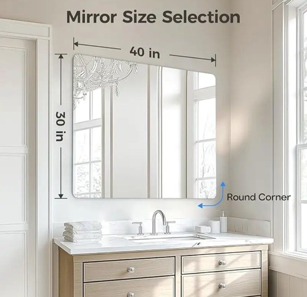 40x30 Inch Large Frameless Bathroom Mirror, Rectangle Wall Vanity Mirror for Bathroom, Bedroom, Entryway, Dining Room, Polished Edge, Tempered Glass
