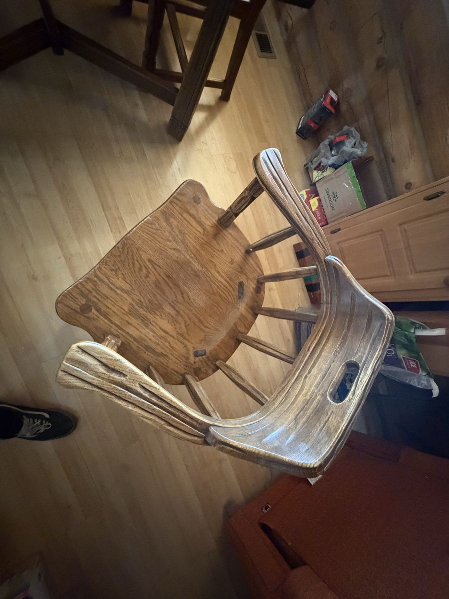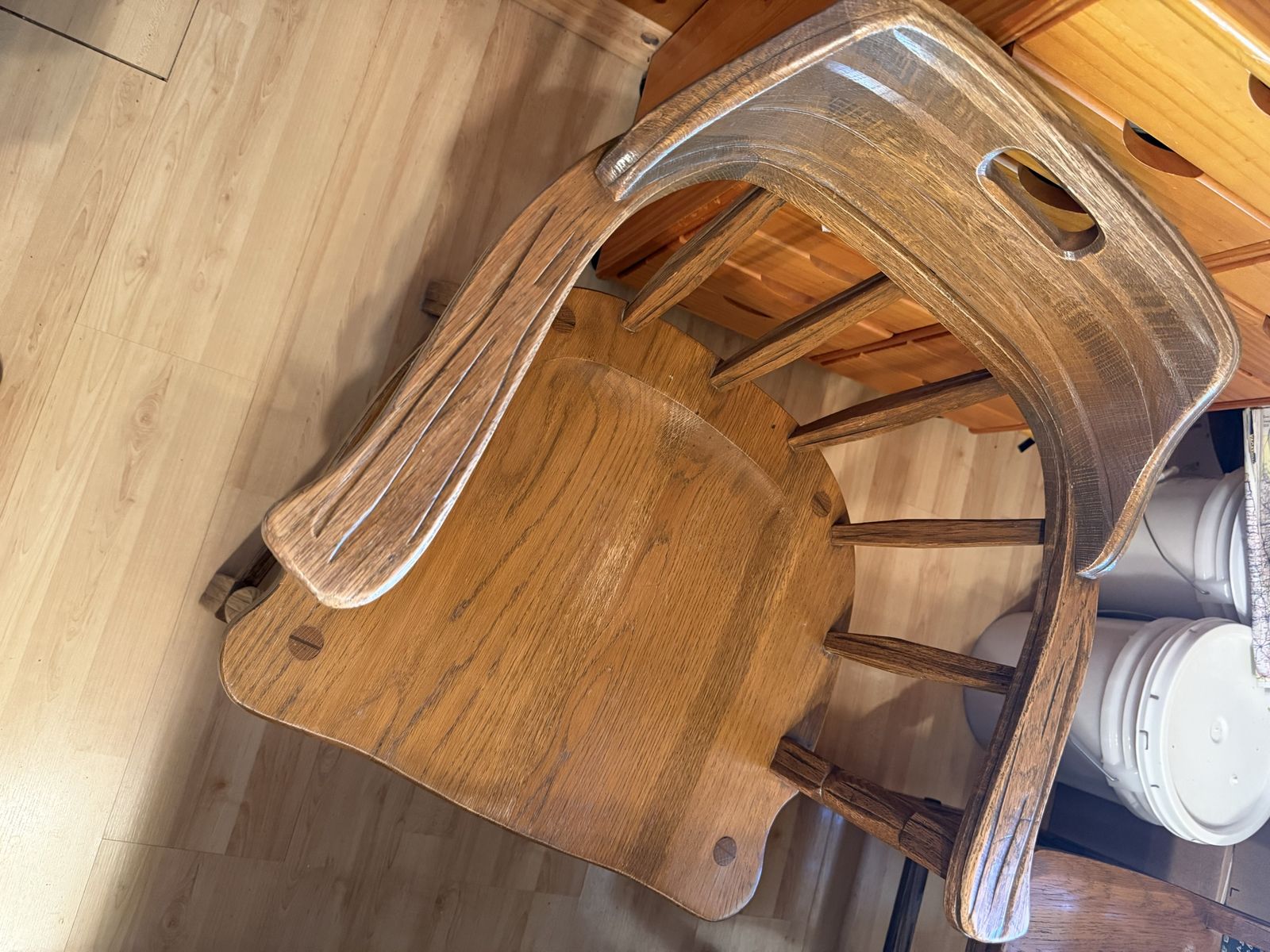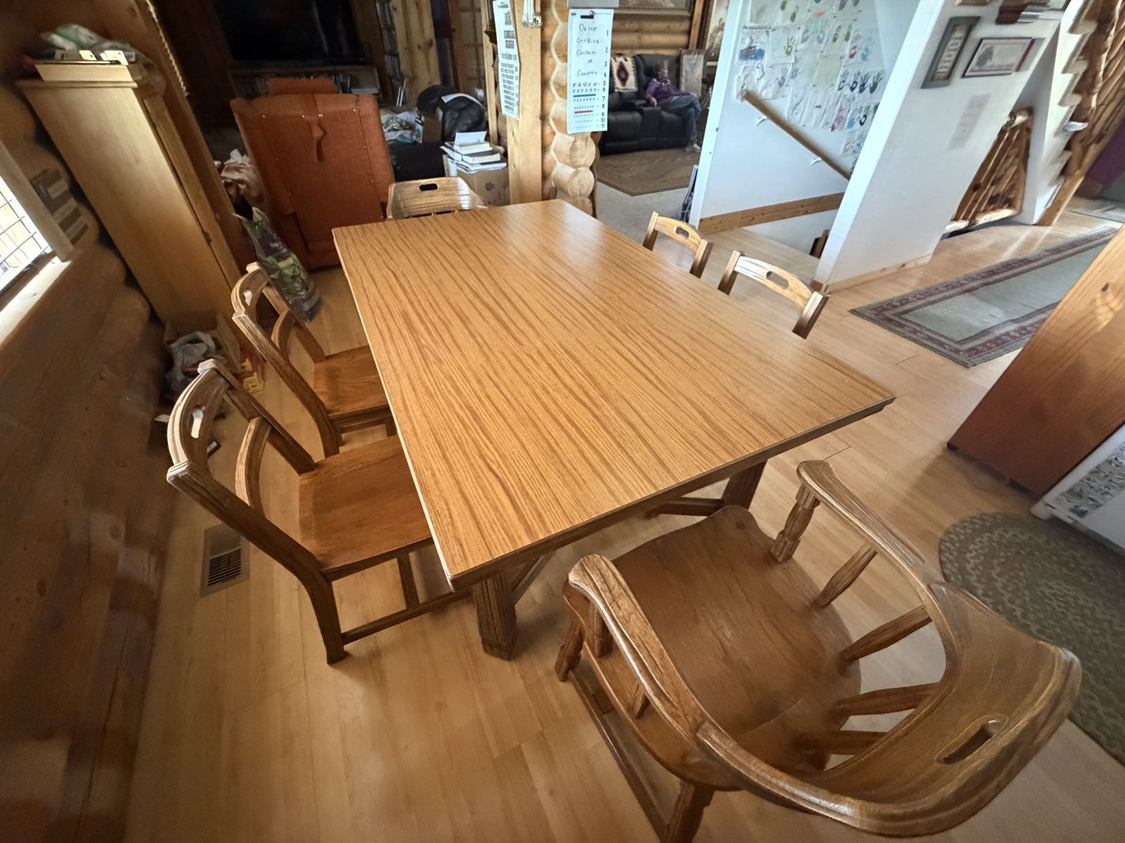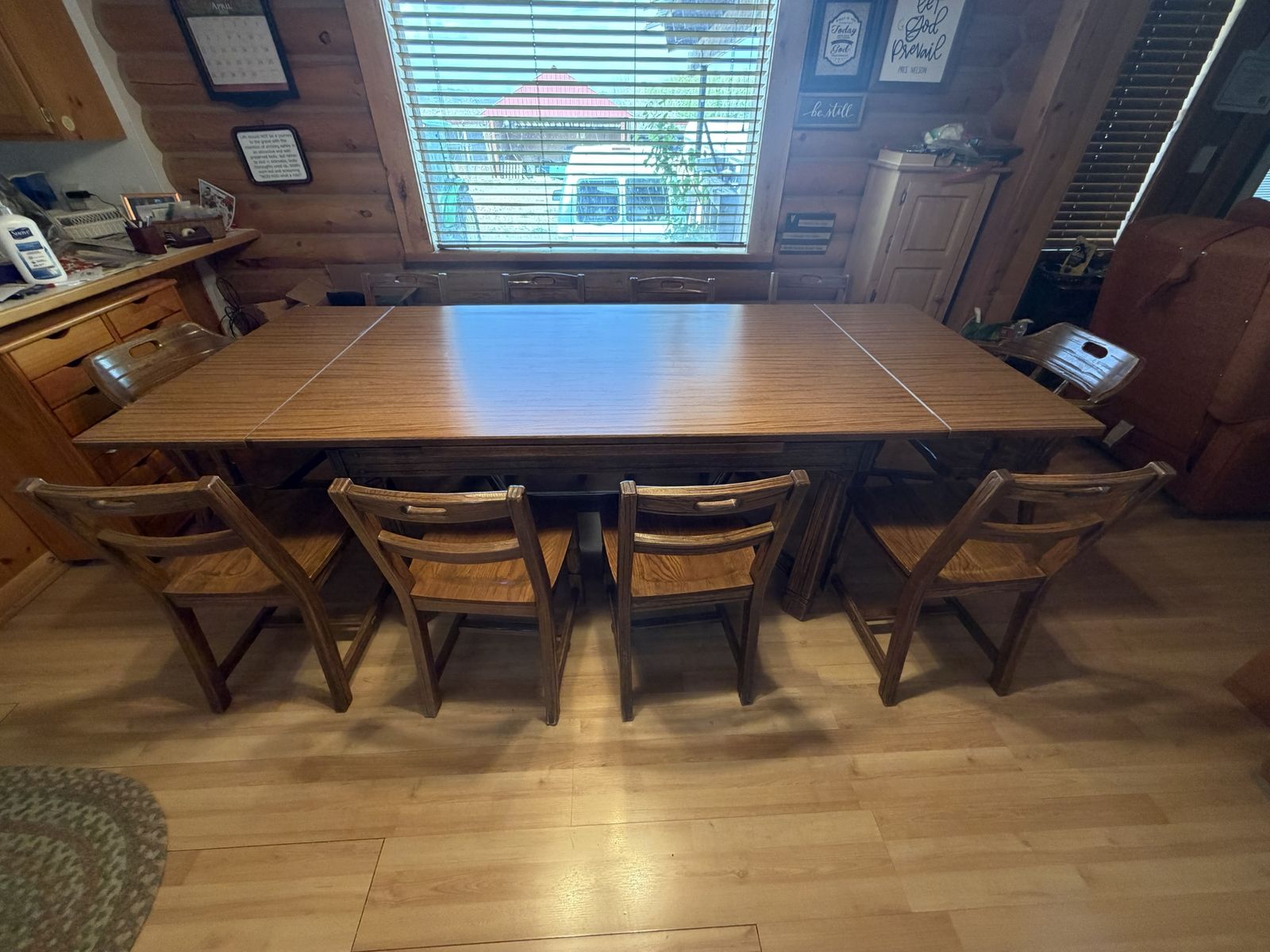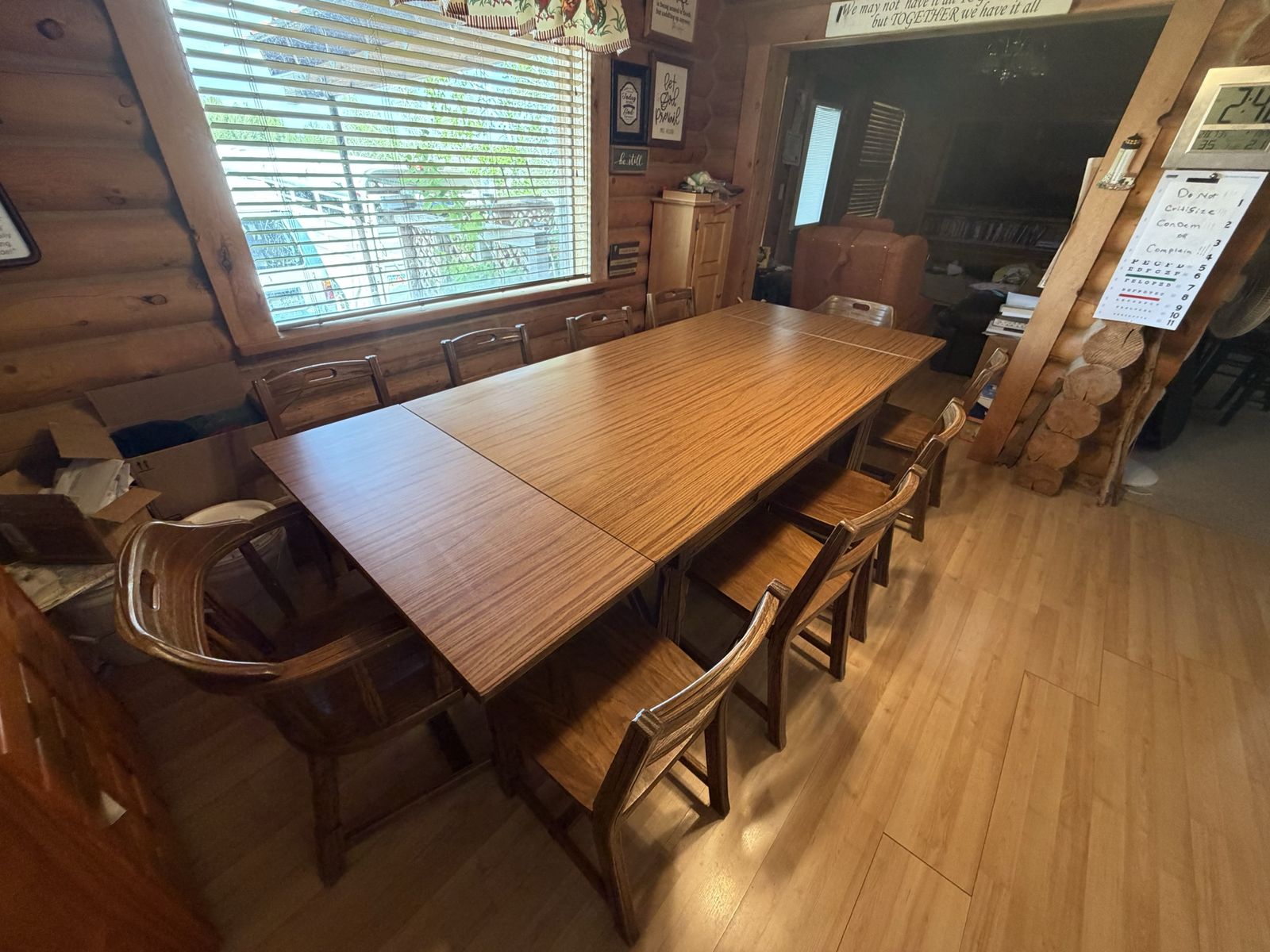 Ranch Oak solid wood dining table with 10 chairs. Everything is in very good shape and has been well cared for. -8 regular chairs -2 captain chairs