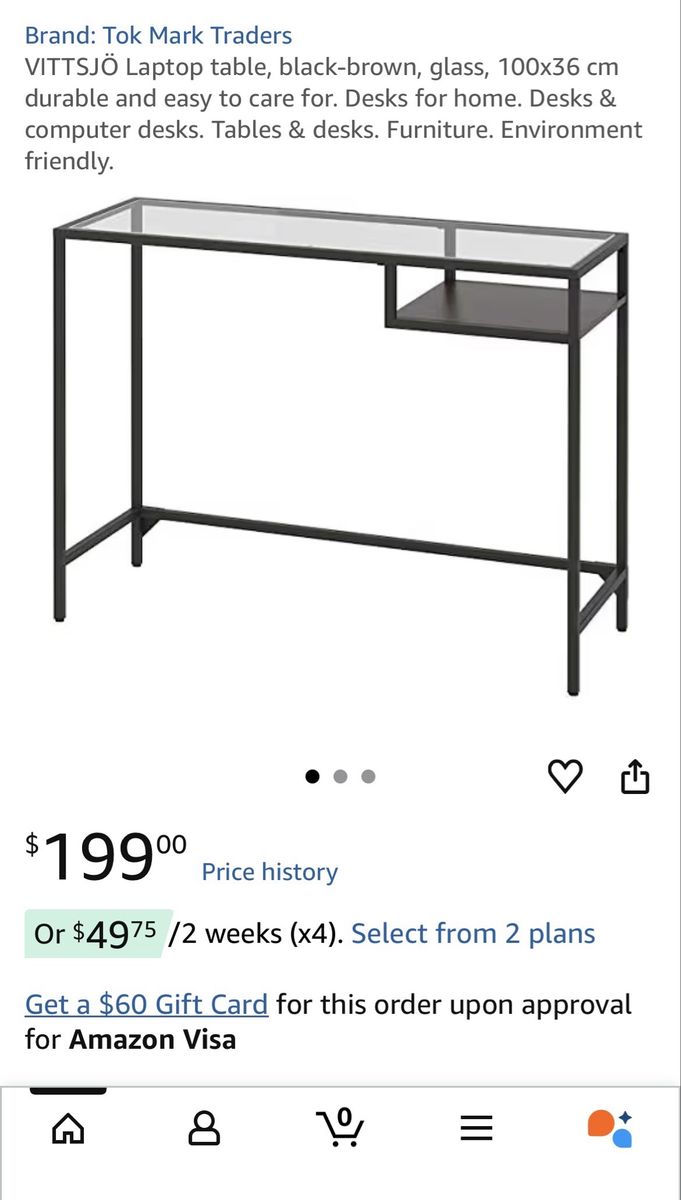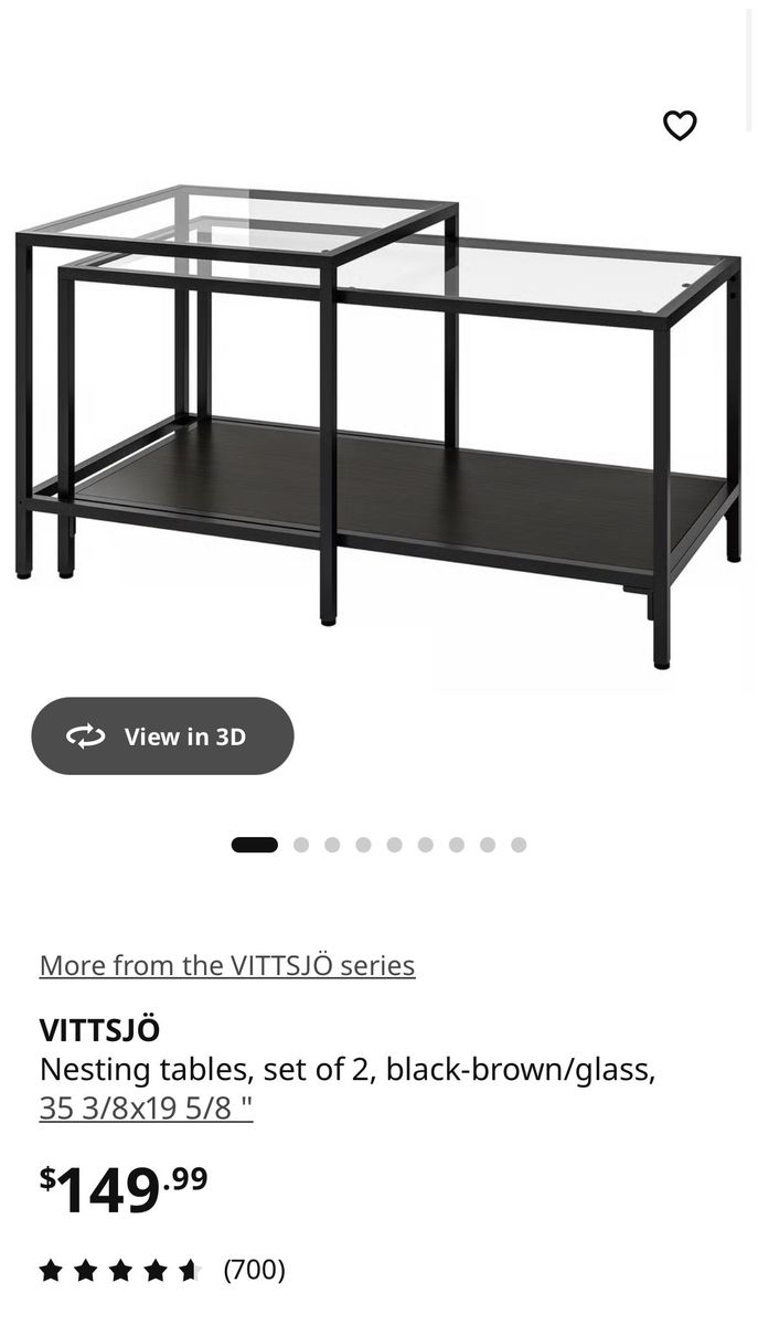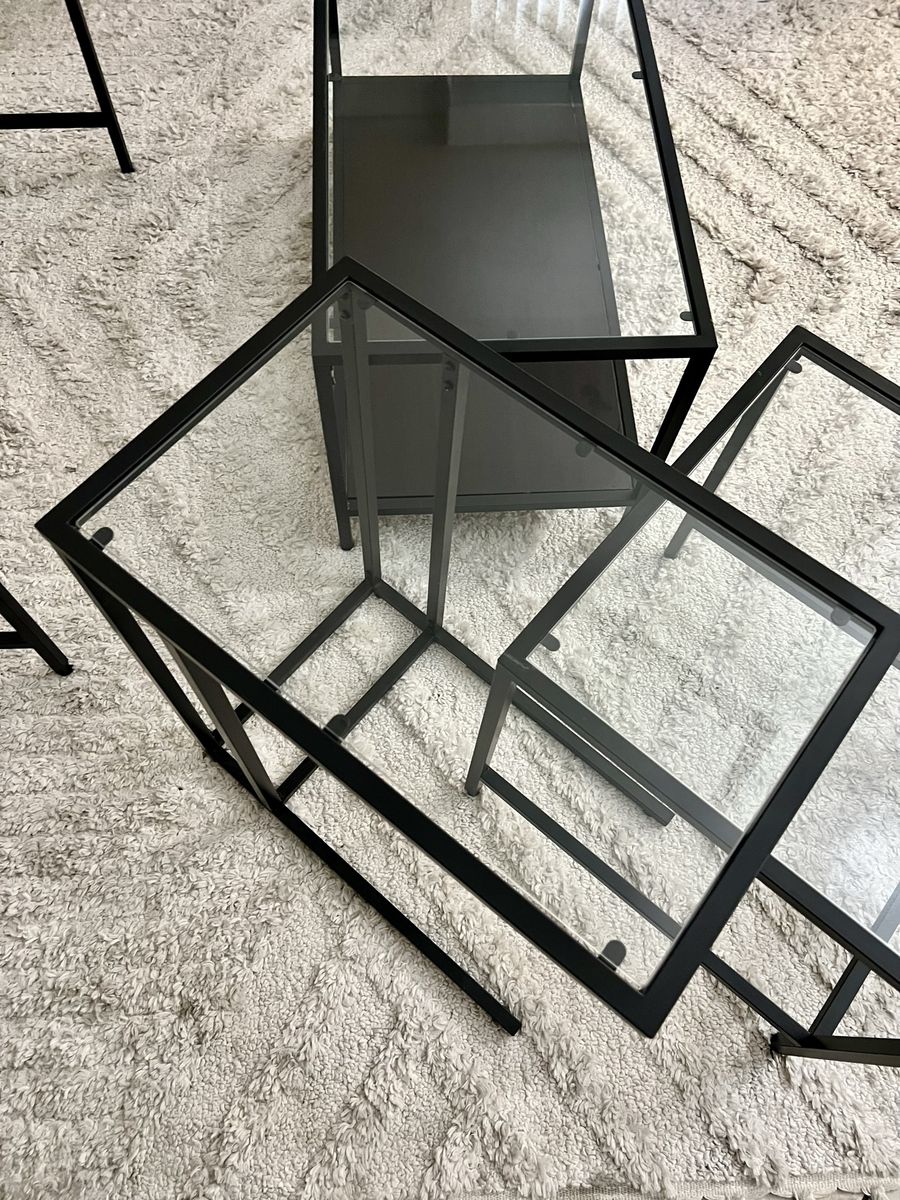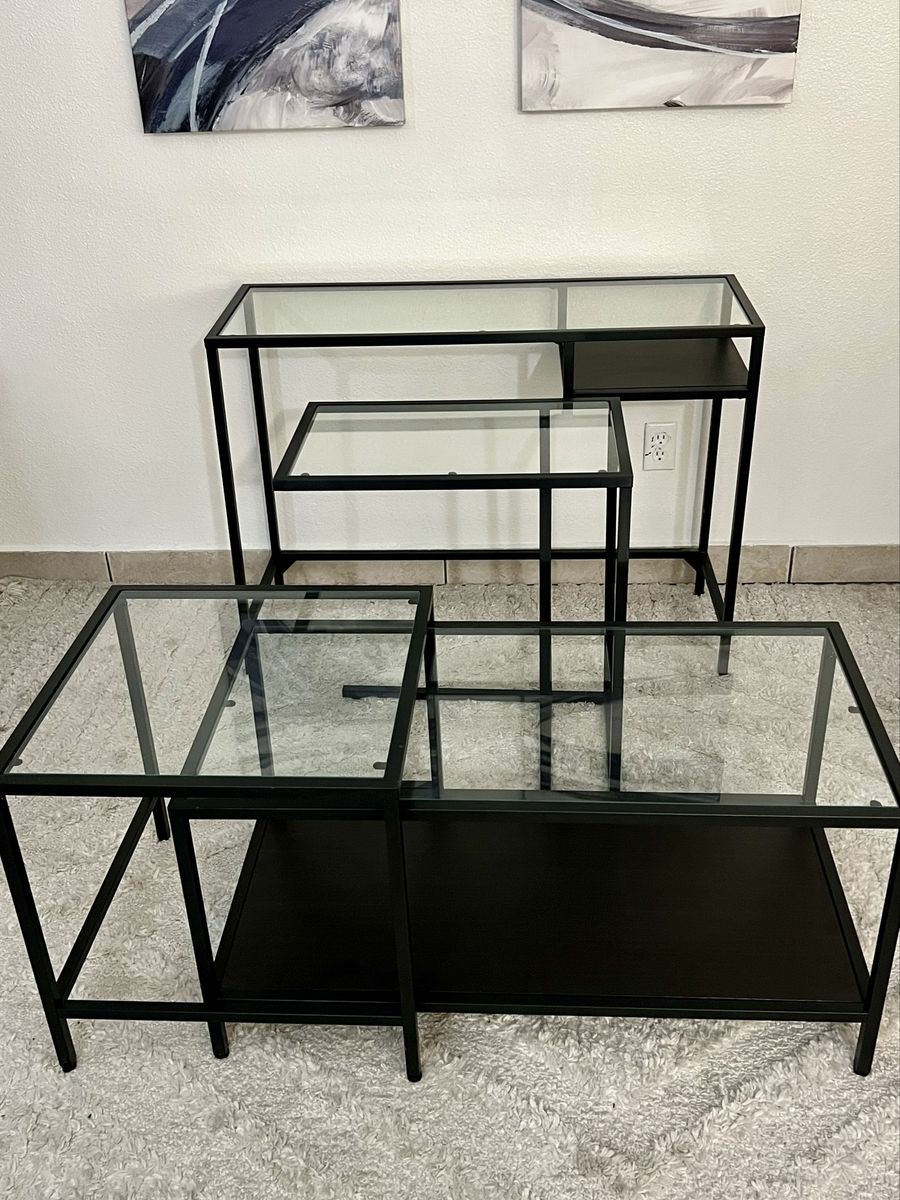 VenmoNice VITTSJÖ brand table set. All in great condition. Includes a glass coffee table, a square side table that slides right over it for a layered look, a handy L‑shaped side table, and a tall laptop desk that was used as an entry or TV table. Total retail value is about $400.00 however my asking price is $120.00. Delivery with fee available.