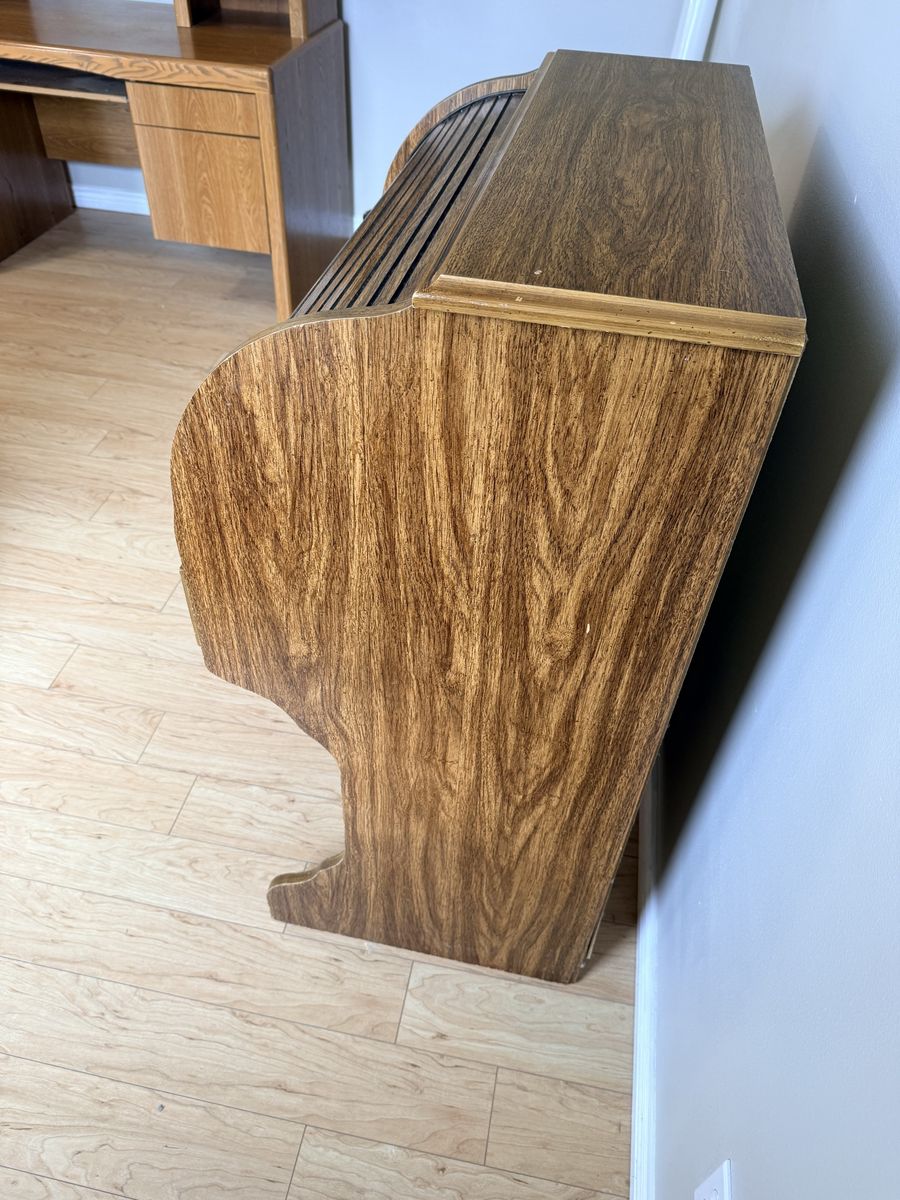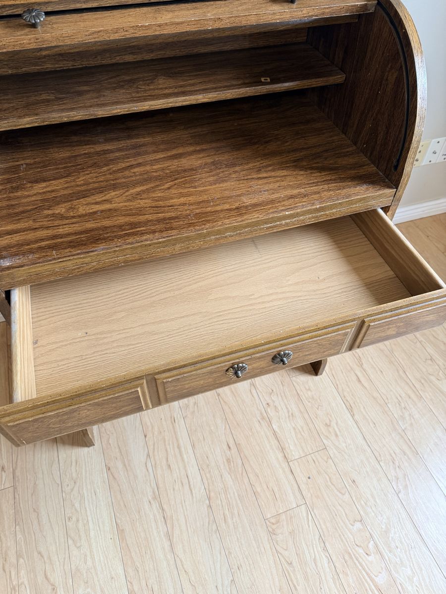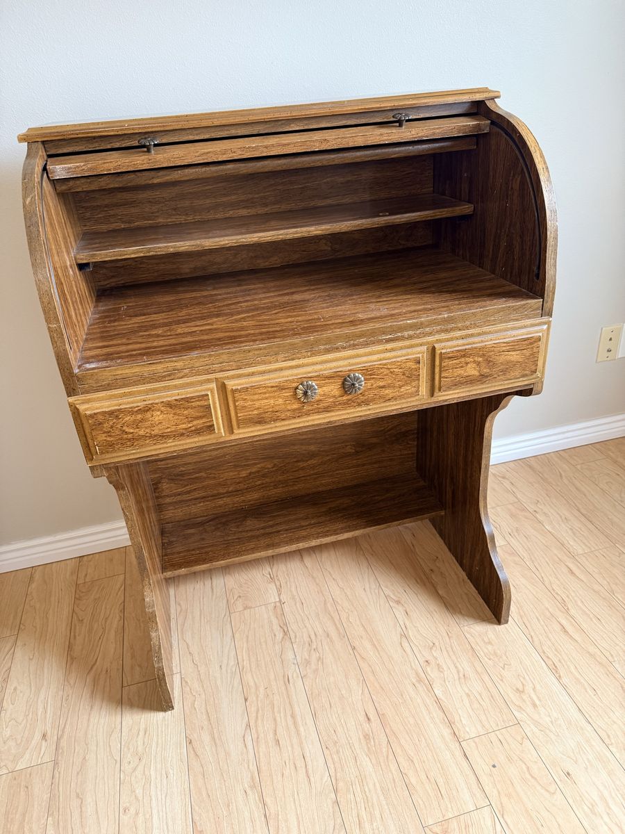 PayPalRolltop desk in good condition, with a few dings and scratches. Rolling action is smooth. Missing part of the handle on the drawer.