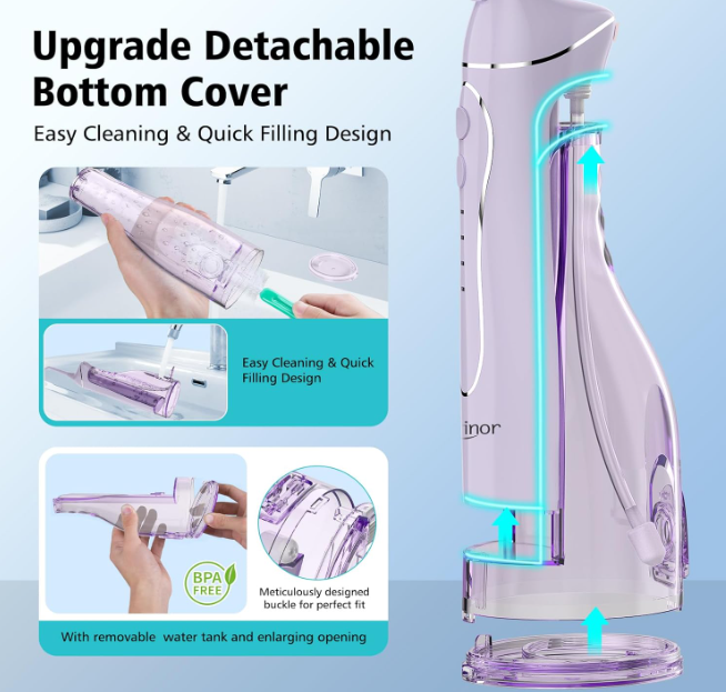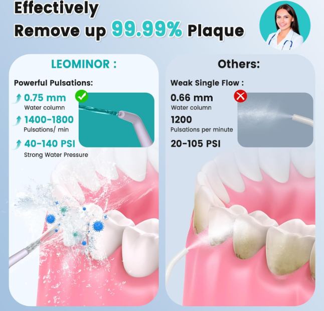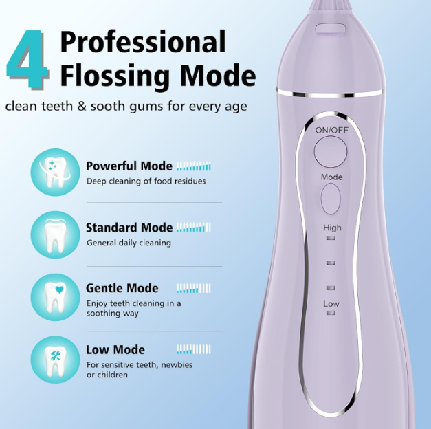 Deep Clean, Improve Gum Health, Freshen Breath This water dental flosser, With upgraded unique pulsation technique, the water flosser has 4 cleaning modes with a 0.75mm powerful water stream and up to 1400 high-pressure water pulses to remove 99.9% food residues hidden deep in the mouth, massage the gum effectively and promoting blood circulation. and addresses oral issues like bad breath, orthodontic teeth brace and bridge care. The travel teeth flosser has offer a pressure range of 50-150PSI strong water press making it suitable for sensitive teeth and meeting various oral care needs for different groups of people, including kids and the elderly.