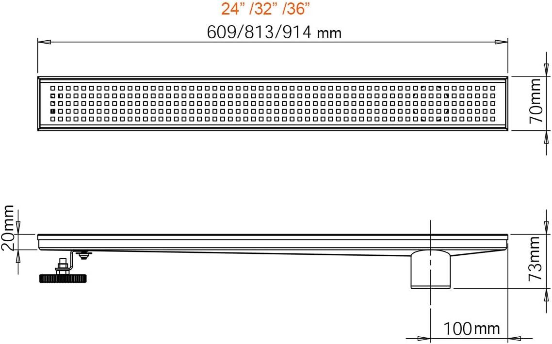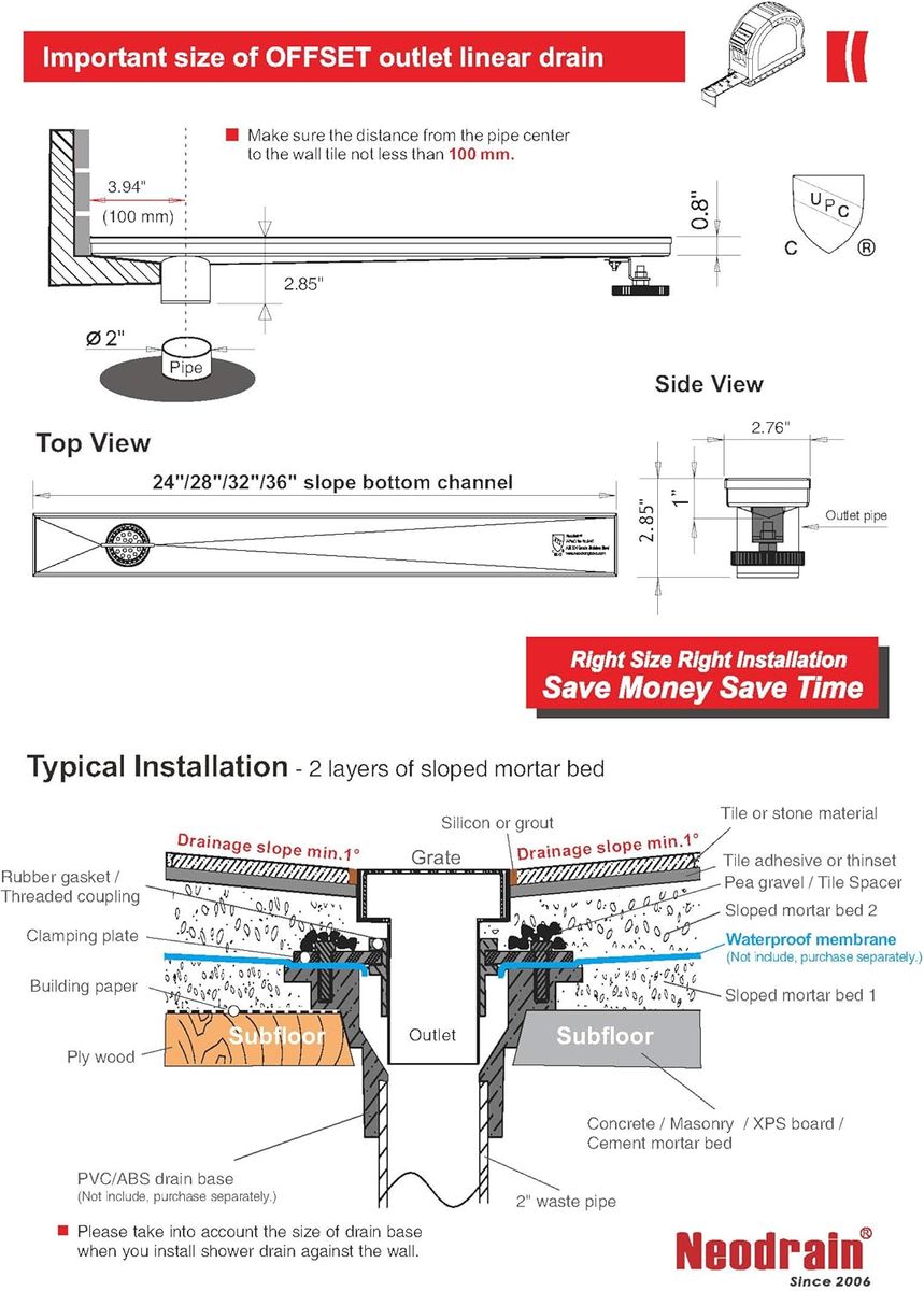 About this item - Linear Shower Drain Size:36" length, 2.75" width, 2" Side outlet. 36 L/min High Flow Capability.