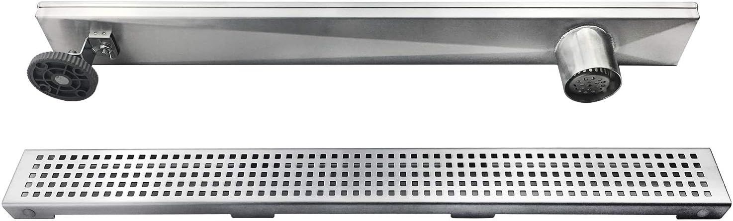 ApplePayNeodrain 36-Inch Offset Side Outlet Linear Shower Drain with Quadrato Pattern Grate Cover, Brushed 304 Stainless Steel Rectangle Shower Floor Drain, with Leveling Foot, Hair Strainer Catcher