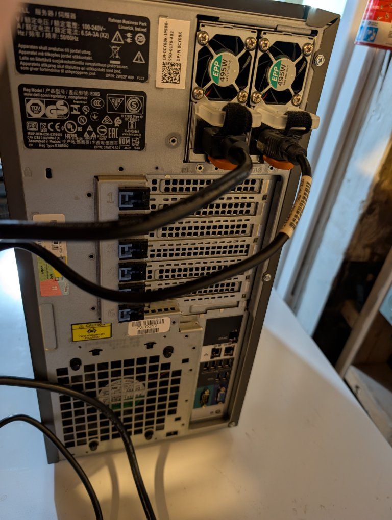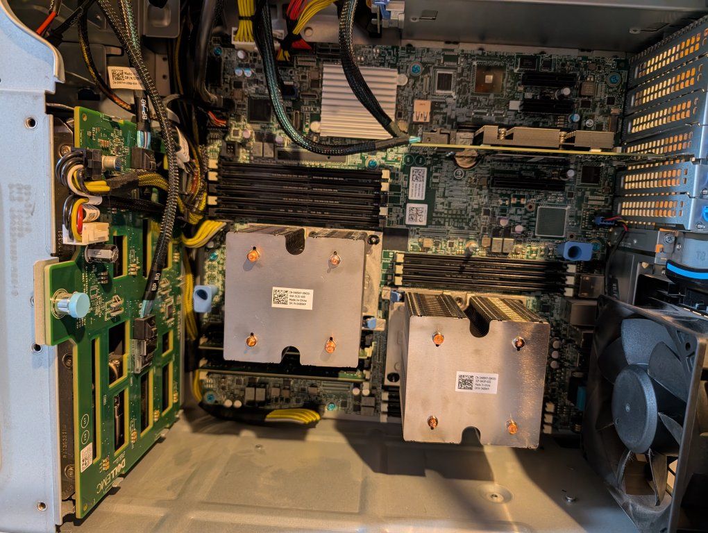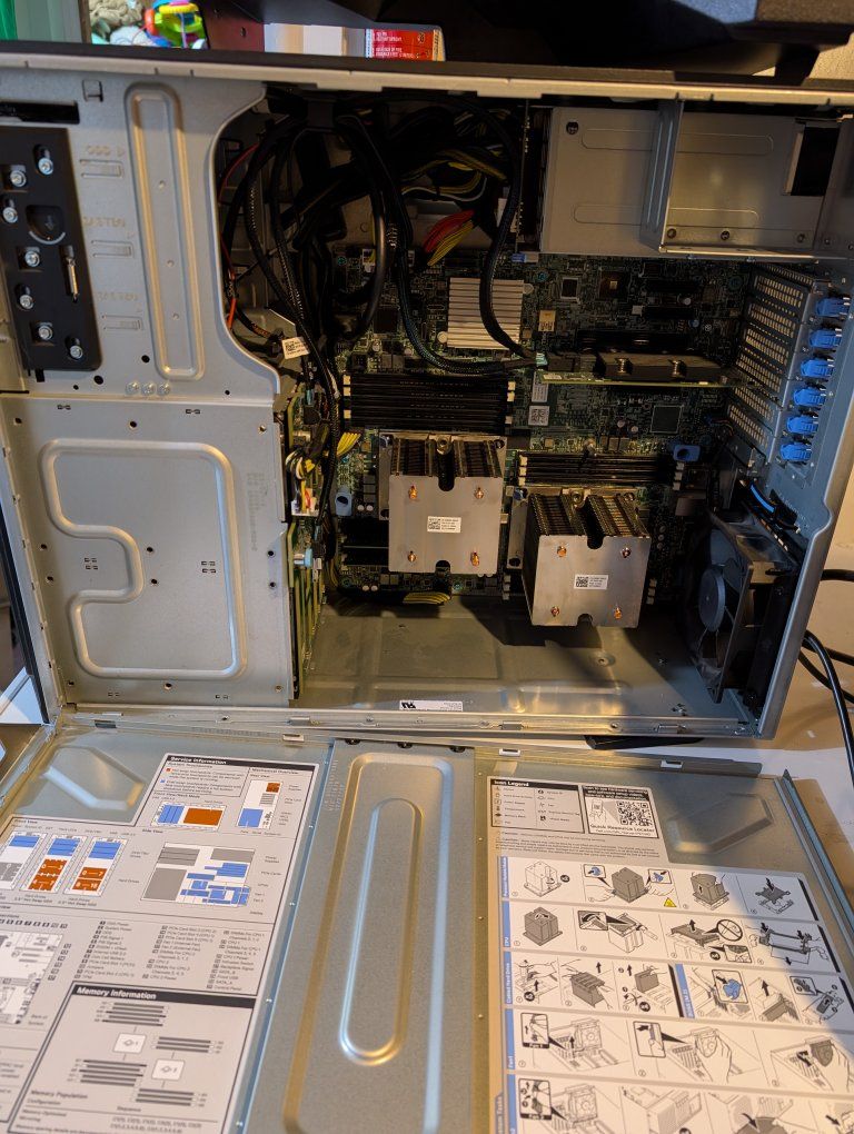 It currently has dual Intel Xeon Platinum 8160 processors, 32 gigs of RAM (with 14 additional slots available), eight hot swappable drive bays (currently holds 3x 1.2Tb drives, 3x 500Gb drives, 1Tb drive, and one 600Gb drive), and dual power supply. I currently having it running Ubuntu, but you can swap it to whatever you want.