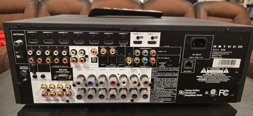 Specs for Anthem MRX 510 receiver: Type: 7.1-channel AV receiver Amplifier power: 100 watts per channel with 2 channels driven, 75 watts per channel with 5 channels driven, into 8 ohms at 0.1% THD+N HDMI: 8 inputs total, including 1 front input; 2 HDMI outputs Video handling: 4K scaling / upscaling and pass-through support Legacy video inputs: 2 component inputs and 1 composite input (great for Wii) Digital audio inputs: 3 optical and 2 coaxial Analog inputs: 5 stereo RCA inputs Pre-outs: 7.1-channel preamp outputs Room correction: Anthem Room Correction (ARC) included Tuner: AM/FM tuner Dimensions: about 6.5 in H x 17.25 in W x 14.625 in D. Weight: 30.2 lb (13.7 kg)