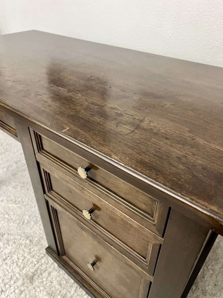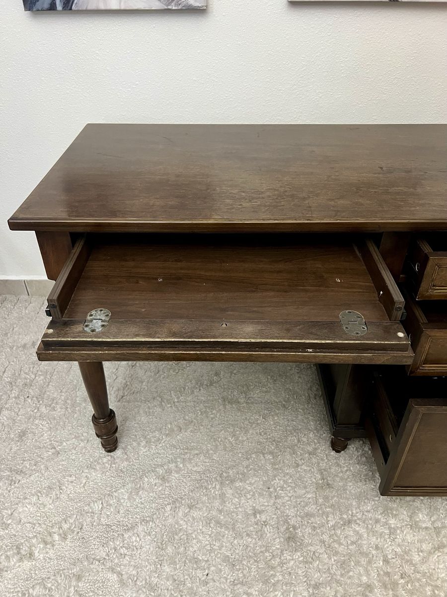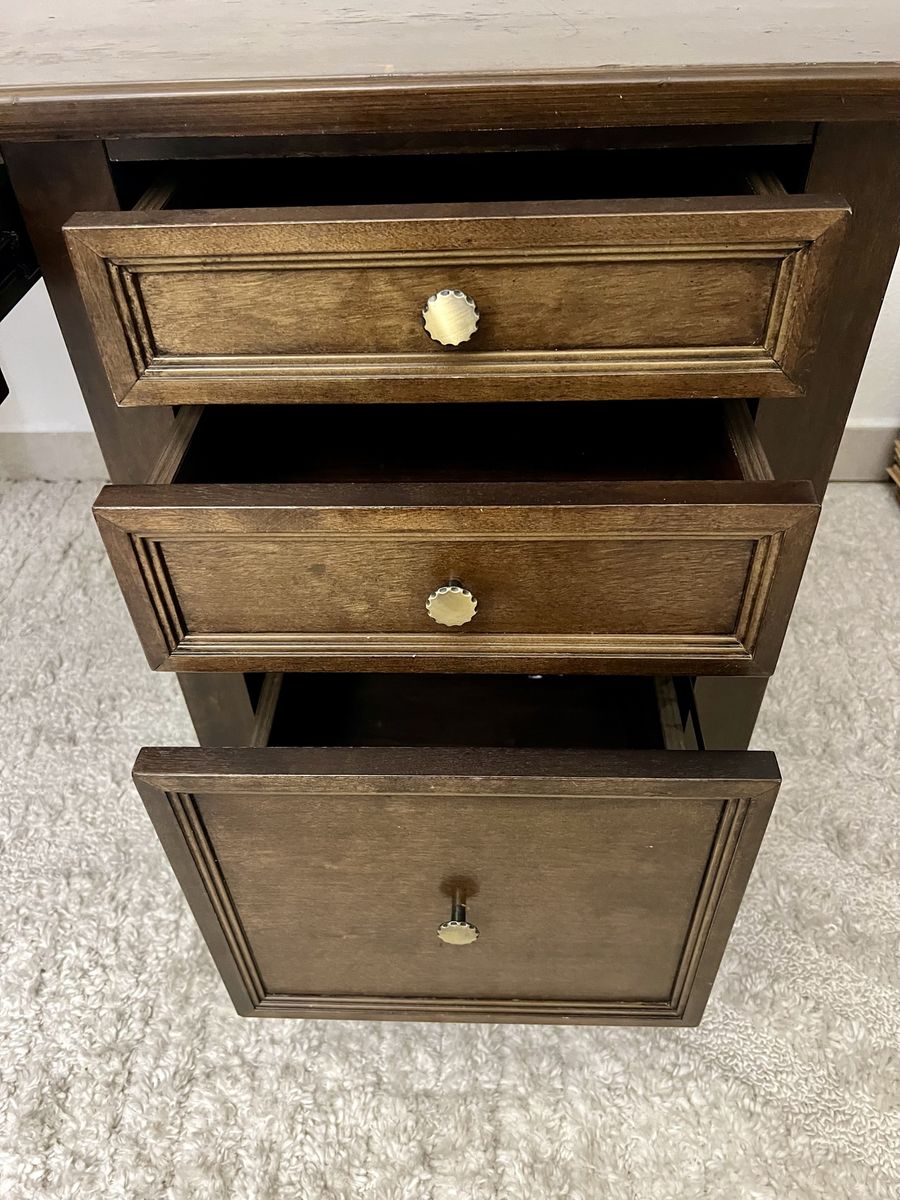 VenmoVintage elegant wooden office desk with drawers and brass knobs. Main drawer has unique face opening. All drawers function normally and smooth. There are scratches and dings around it so it's priced accordingly. Asking price $65, delivery available with fee or pickup.