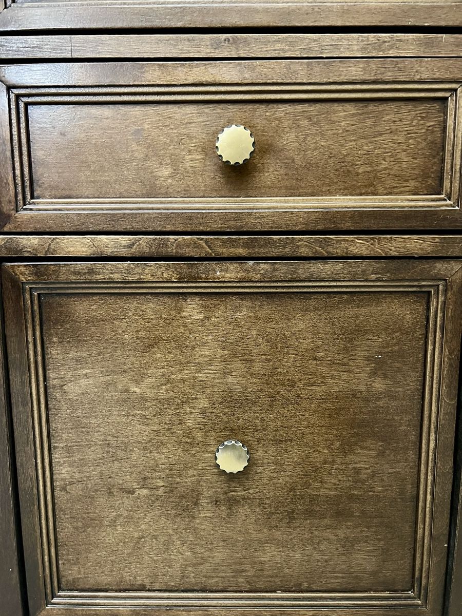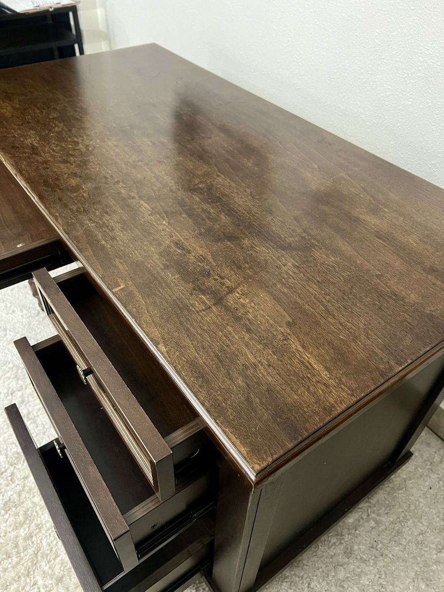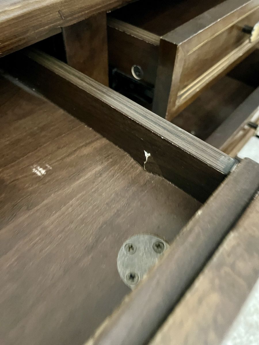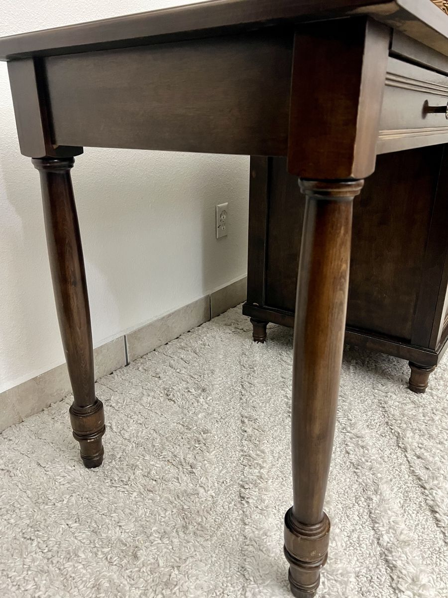 VenmoVintage elegant wooden office desk with drawers and brass knobs. Main drawer has unique face opening. All drawers function normally and smooth. There are scratches and dings around it so it's priced accordingly. Asking price $65, delivery available with fee or pickup.