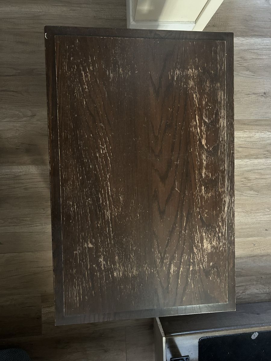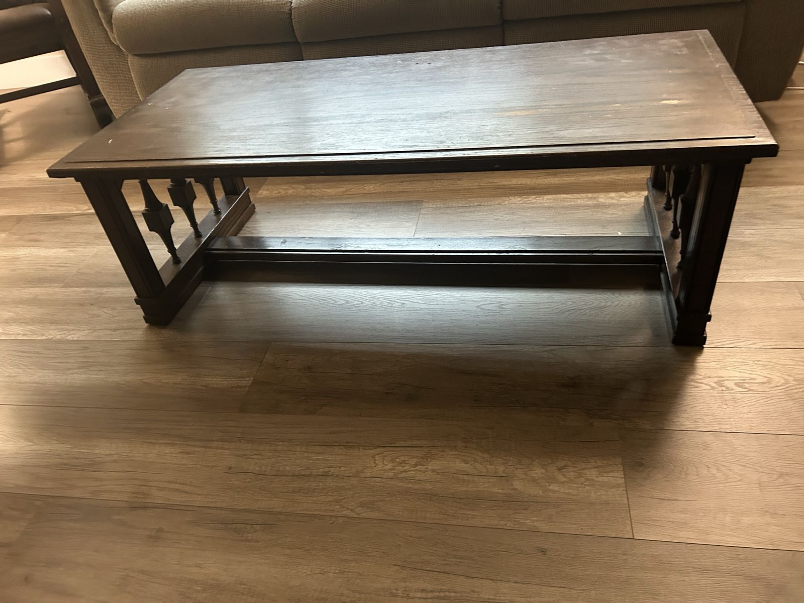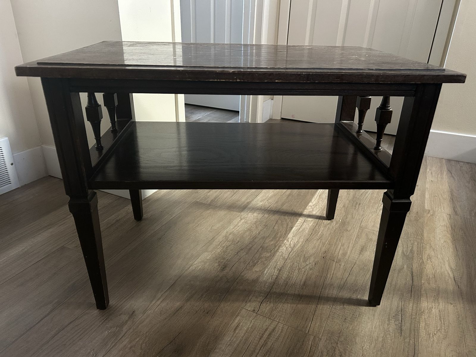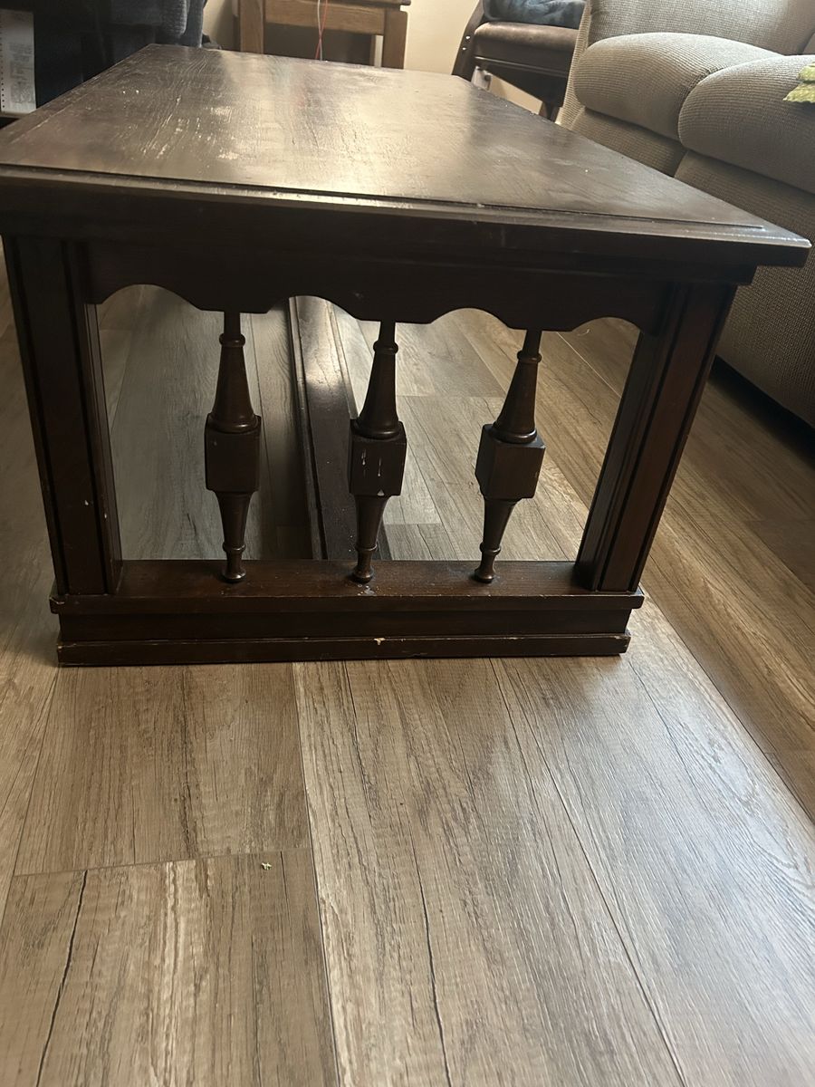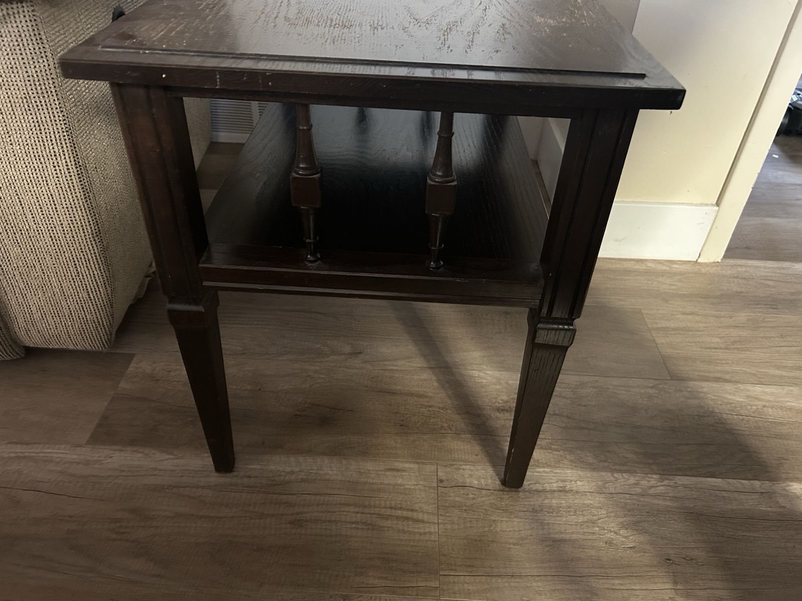 Dark brown wood table set, tops are pretty worn otherwise in good condition
