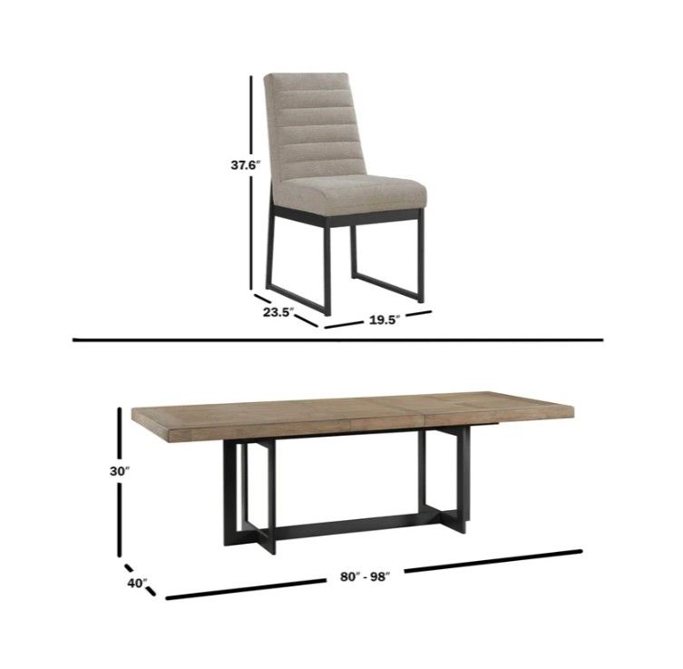 Dimensions: • Table: 80–98” L x 40” W x 30” H • Chairs: 23.5” L x 19.5” W x 37.6” H • Leaf: 18”