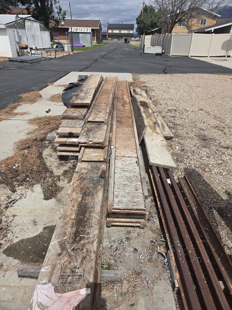 I joists, originally used as concrete footing forms. Plywood on one side.